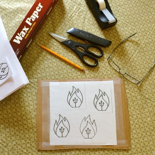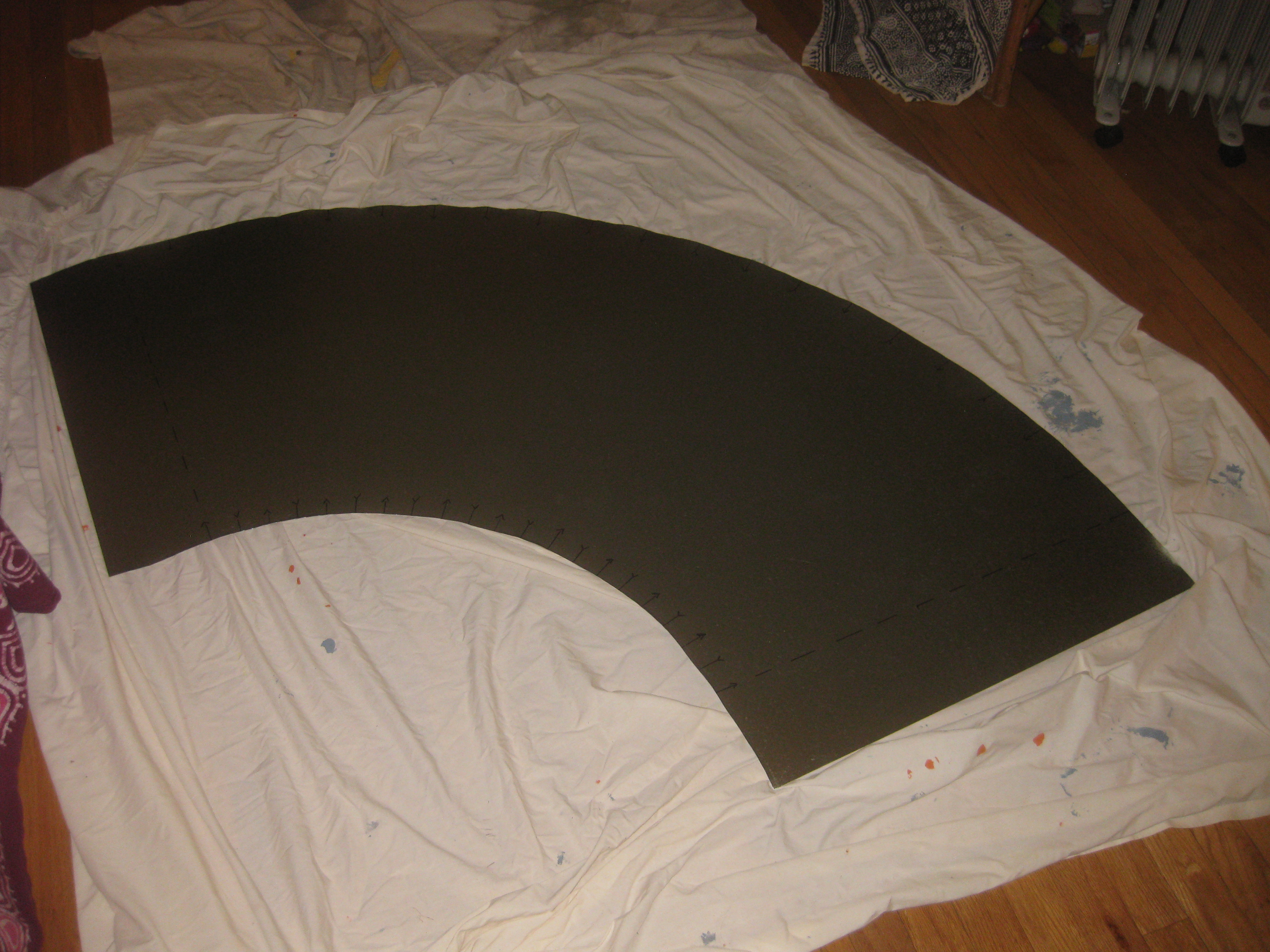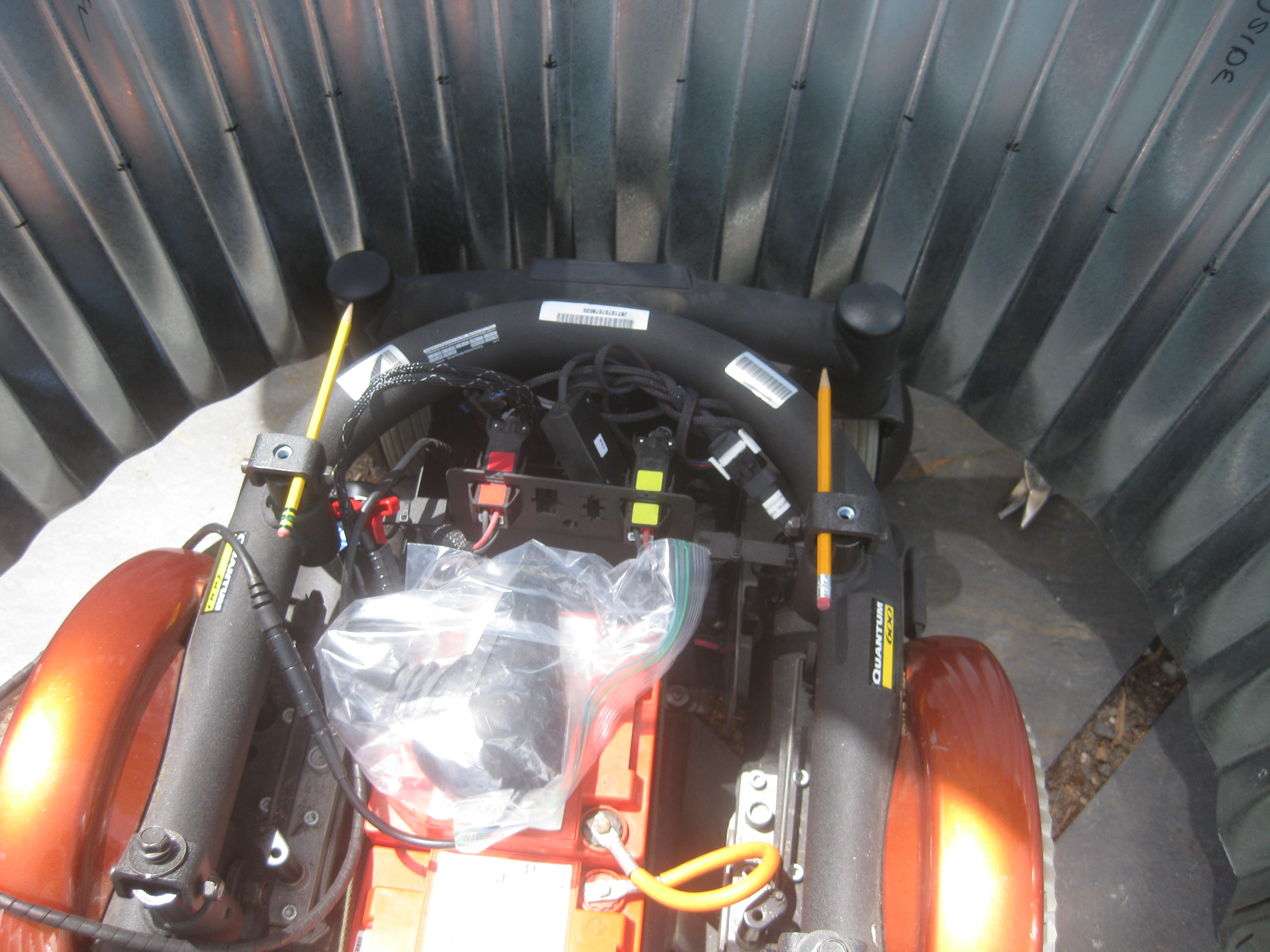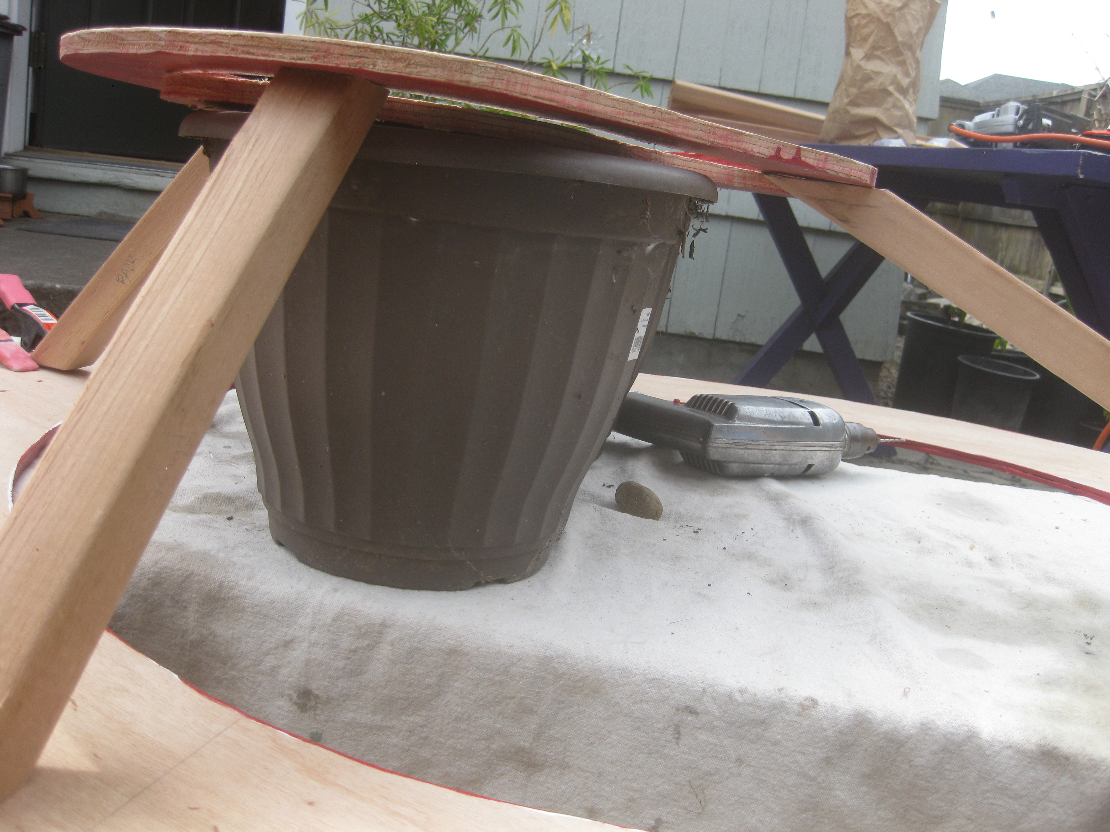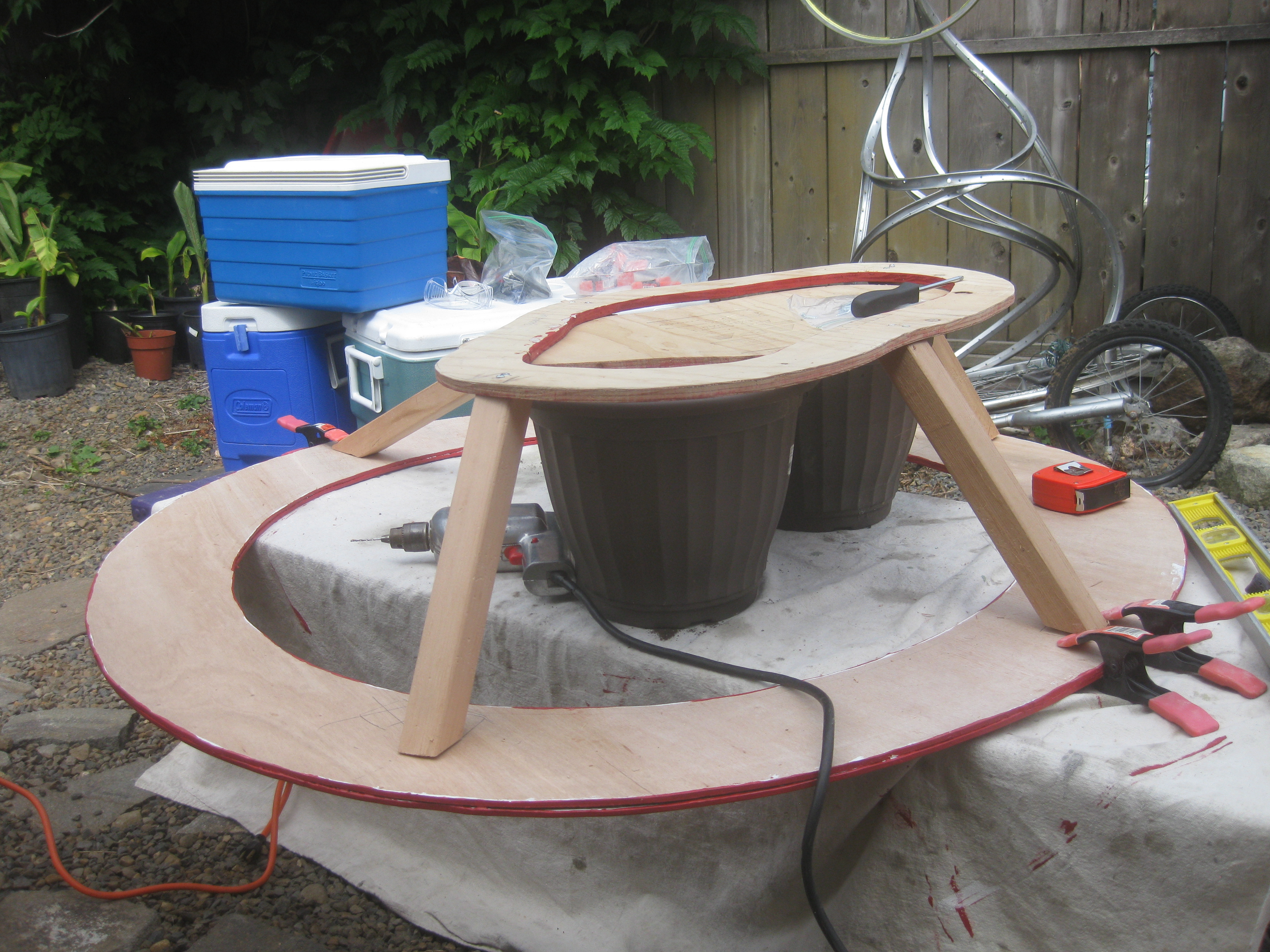 Now that it’s summer, the project has moved to my house and I’ve made significant progress on the cupcake in the last couple of weeks. A wood base sits as a platform on the mobility cart and the tins attach to it with six hinges. There’s a hole in the platform for my legs and I’m moving one of the two batteries up onto the platform to allow more room for my feet. Sections of the tin have been cut away to make room for moving wheels. To disguise the wheel openings, I’m planning to make cloven hooves to act as fenders. To give the illusion of flames and cover the higher ground clearance, I’m wrapping the bottom of the cupcake with metallic red and gold pennants that will flutter as the cupcake moves.