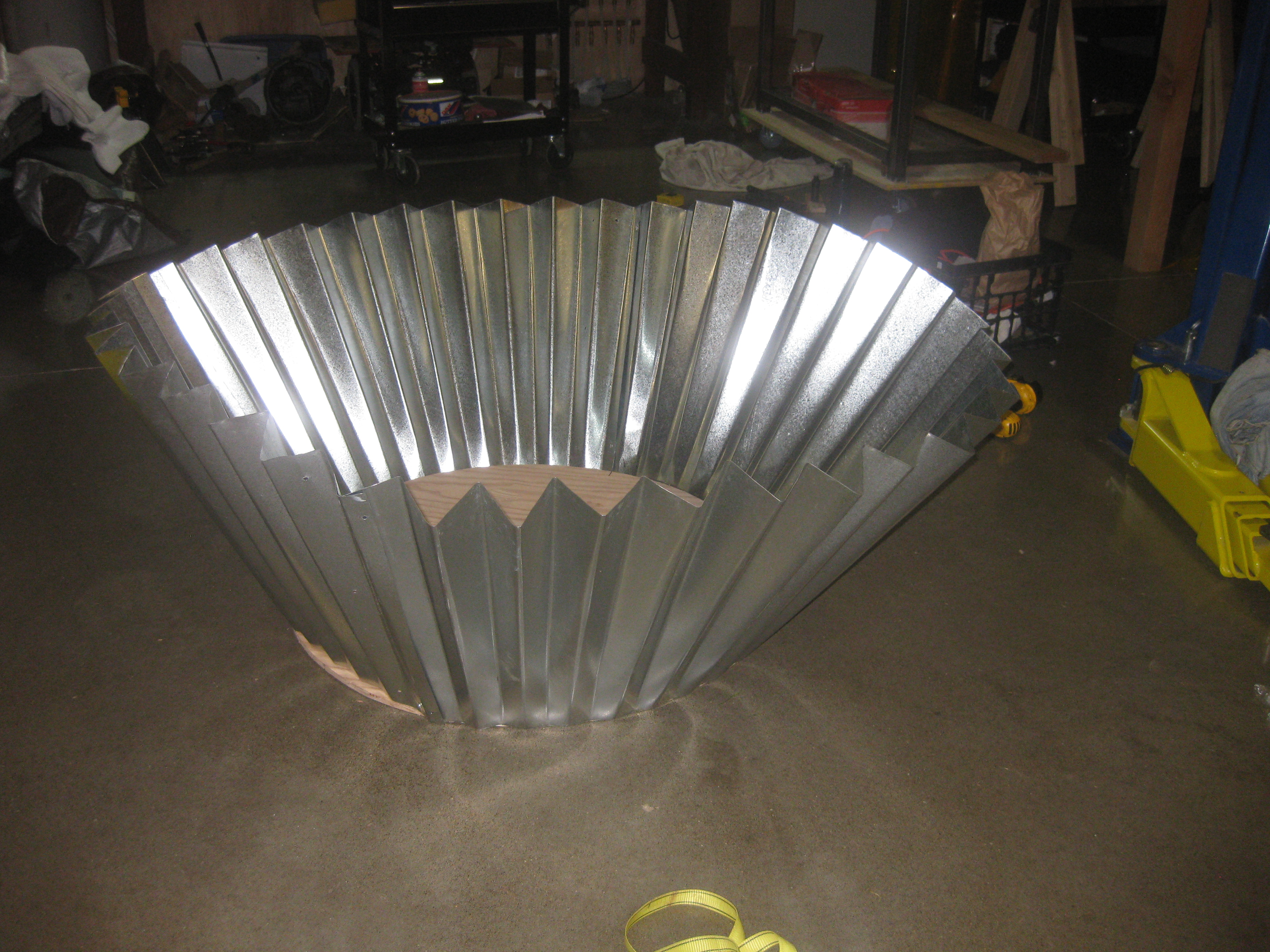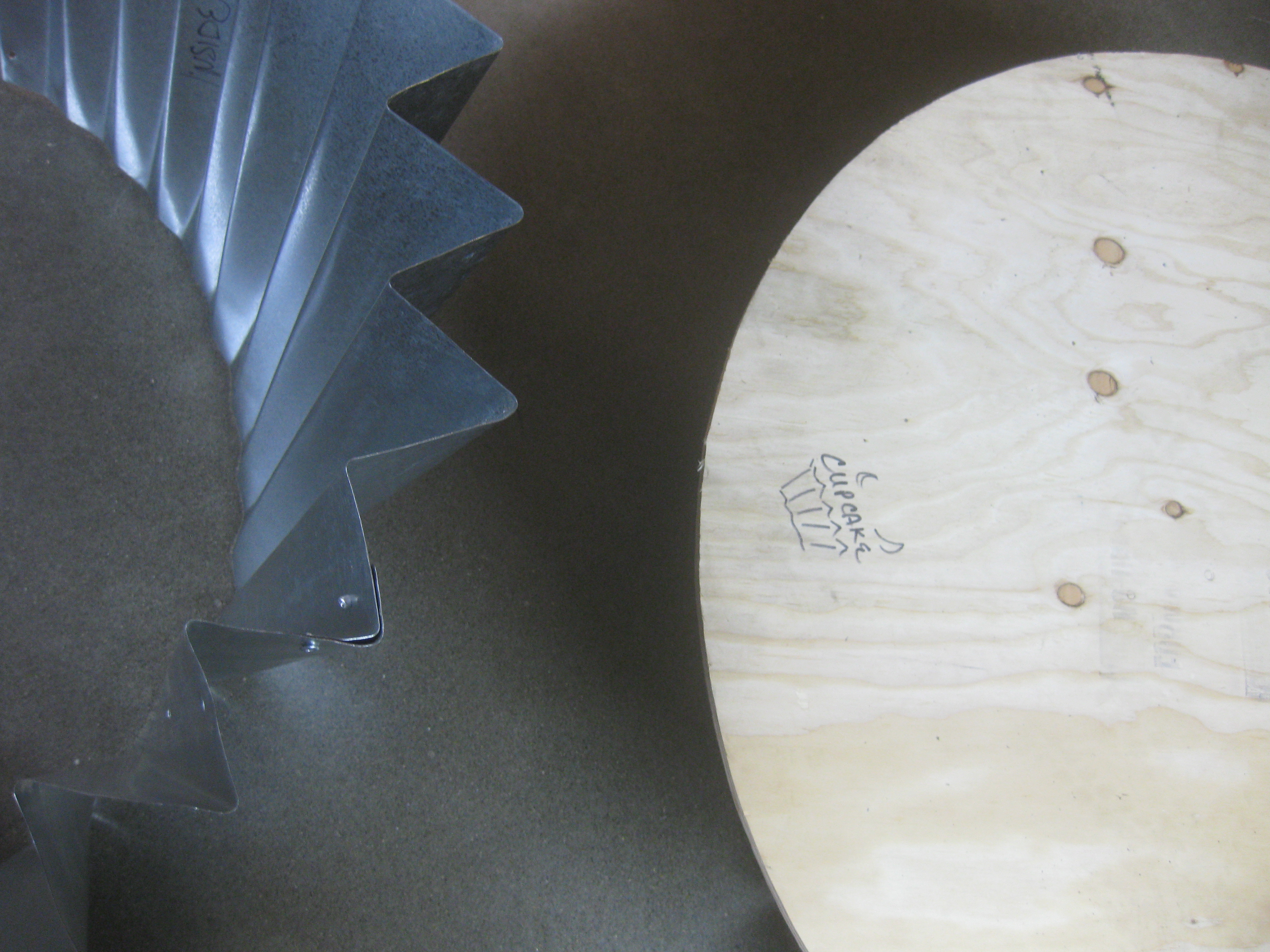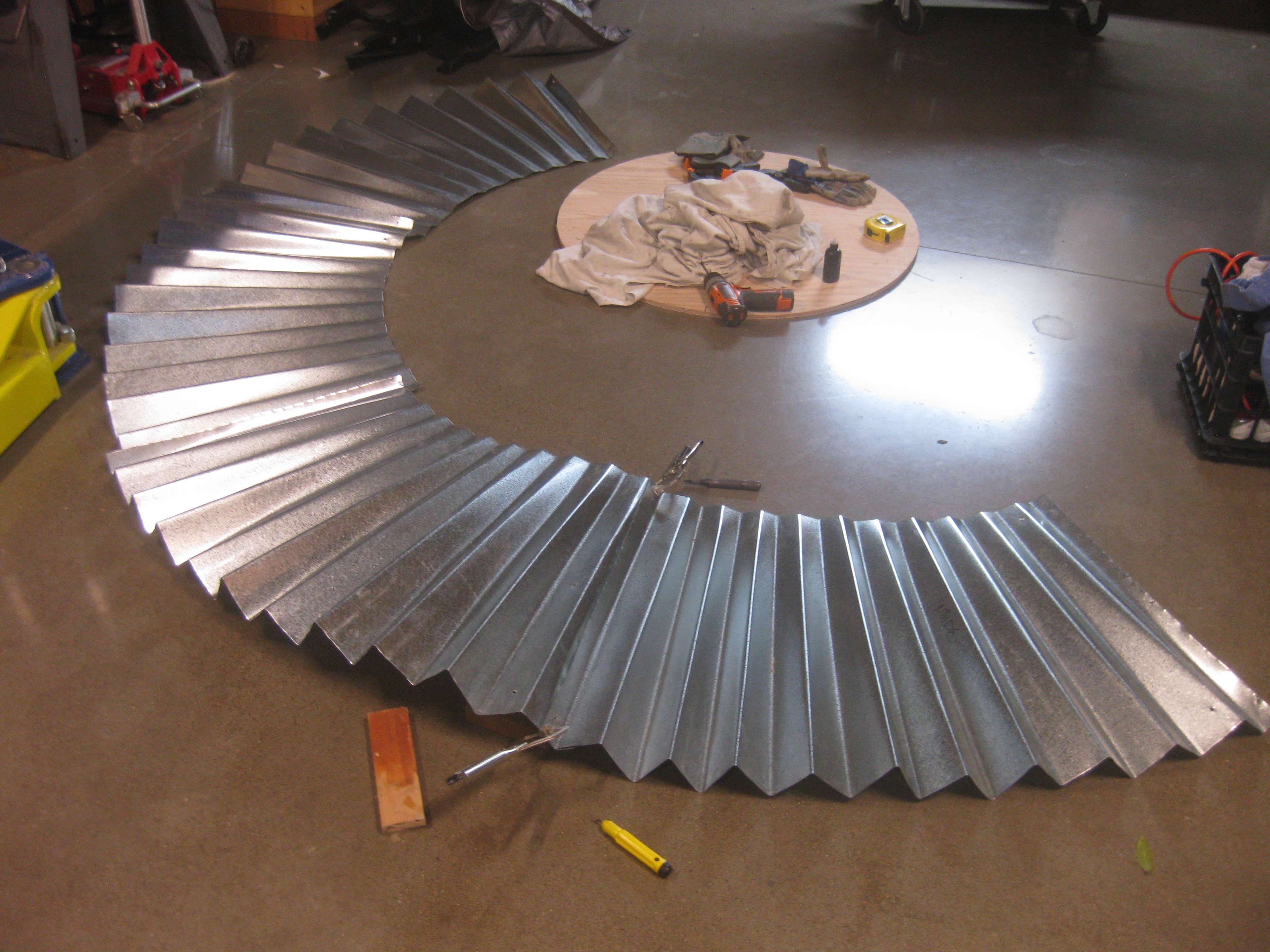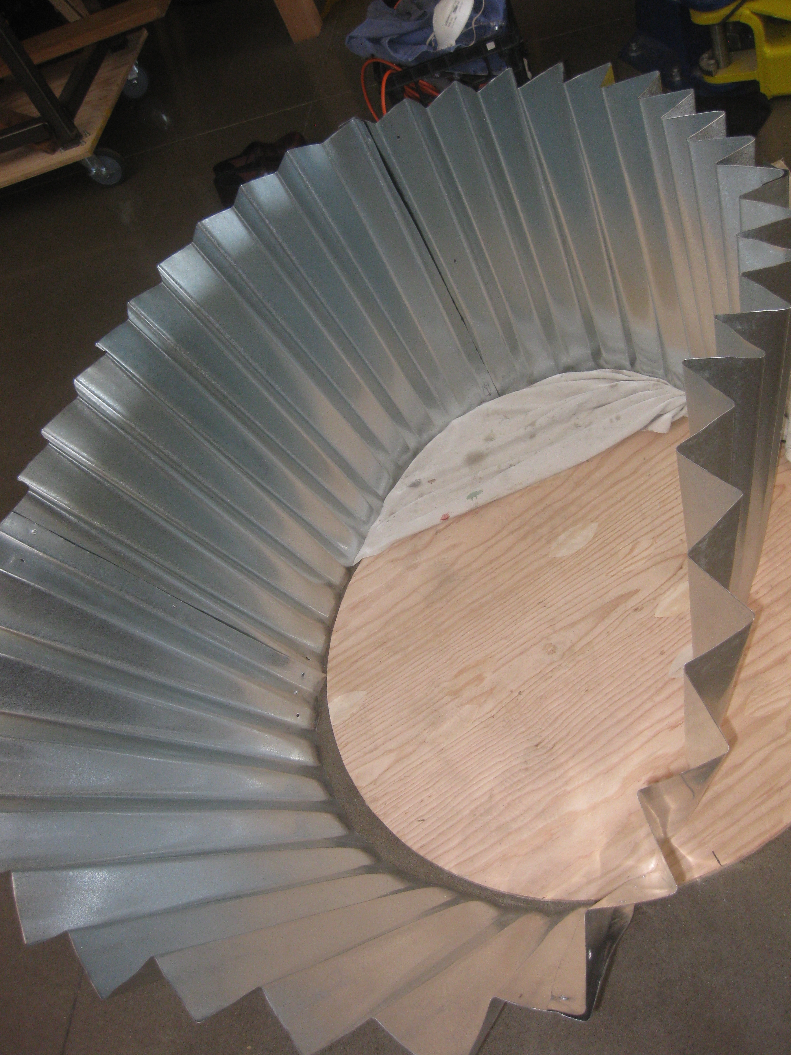 Tin folding is definitely a two person operation. After four 4’x4’ sheets of metal are cut into an arc, you have to use a bending tool to create the folds so the metal looks like cupcake paper. It involves sheer force and a lot of physically flipping the tin over for every single fold.
