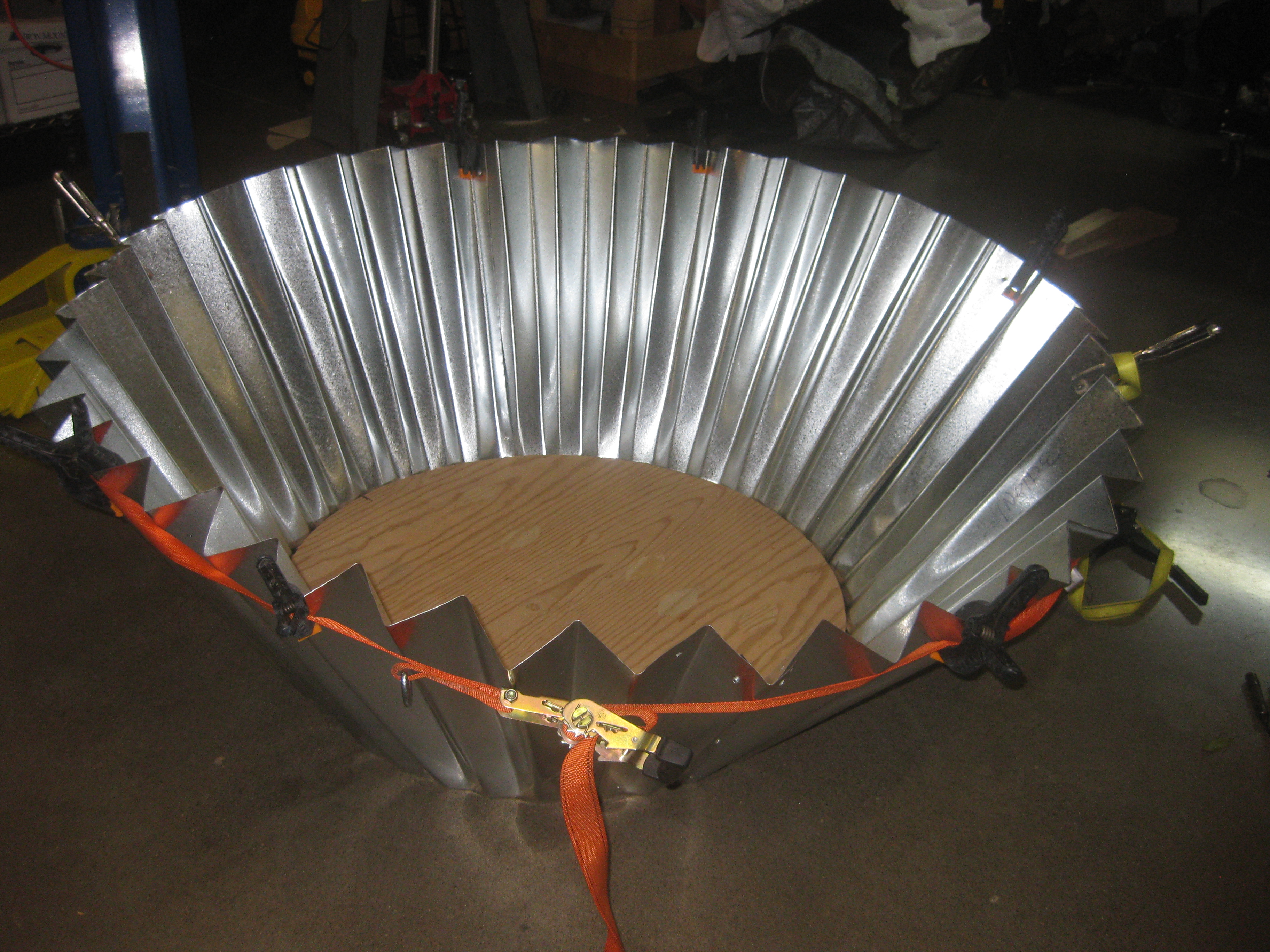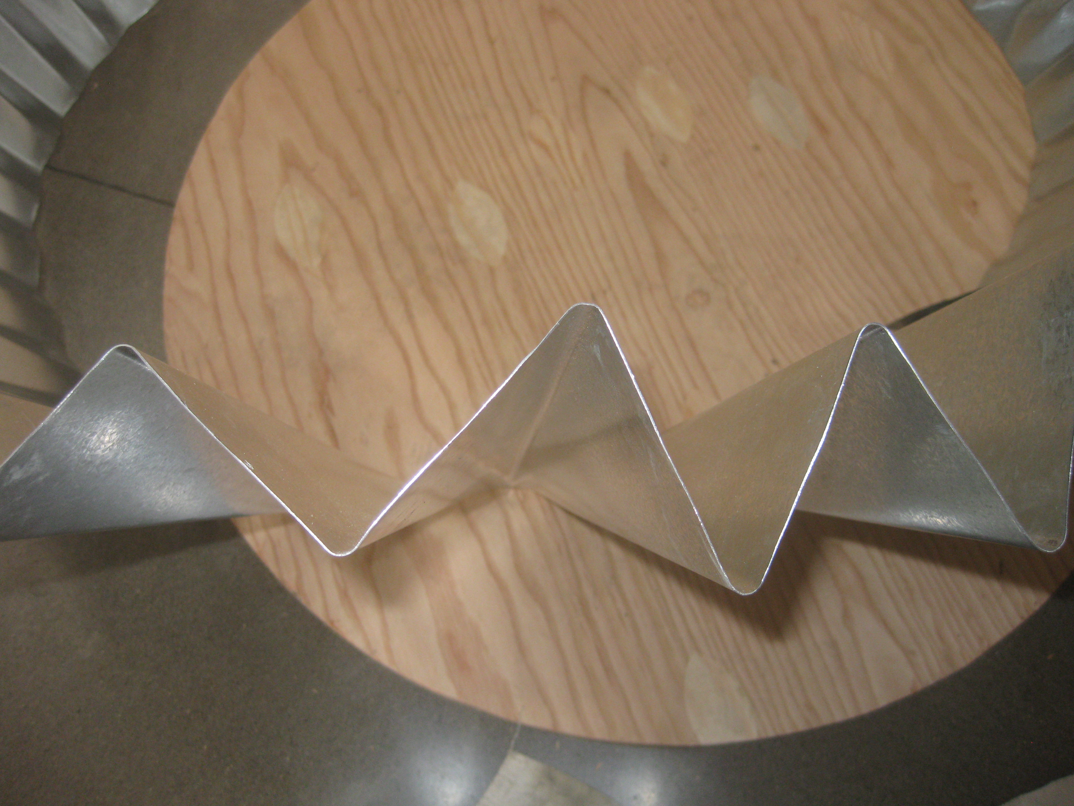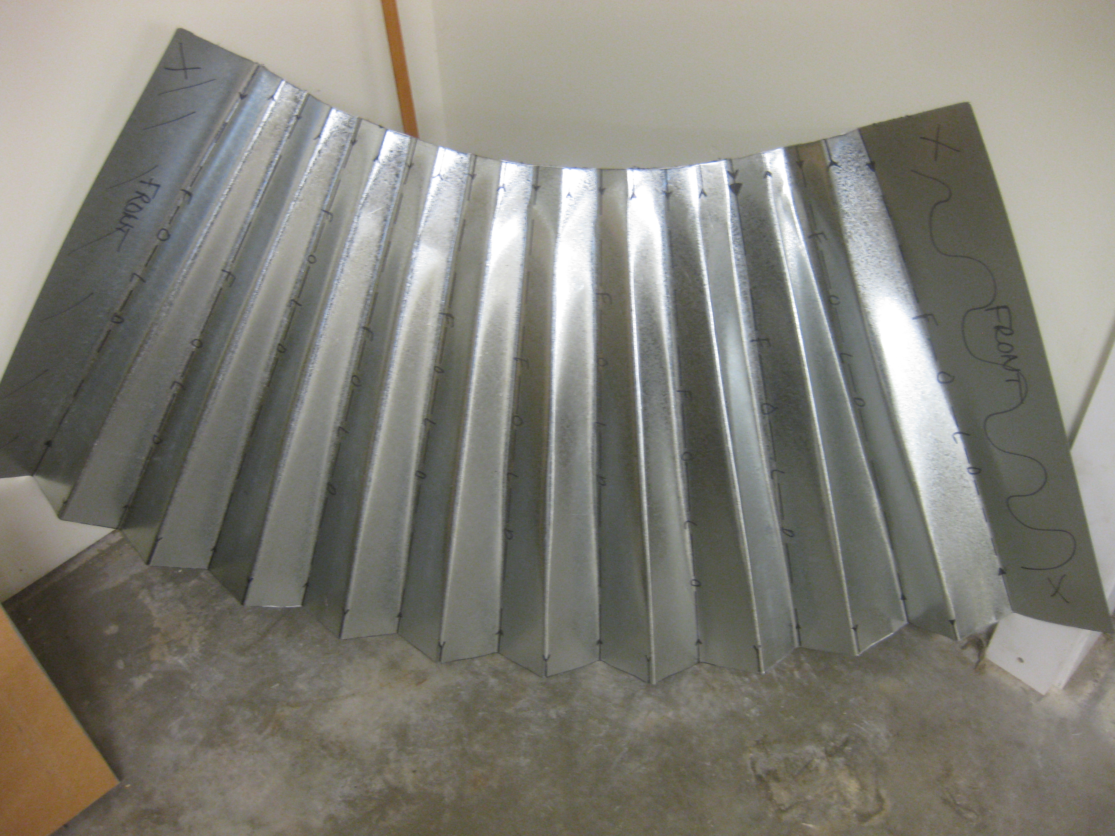 Tin folding is definitely a two person operation. After four 4’x4’ sheets of metal are cut into an arc, you have to use a bending tool to create the folds so the metal looks like cupcake paper. It involves sheer force and a lot of physically flipping the tin over for every single fold.