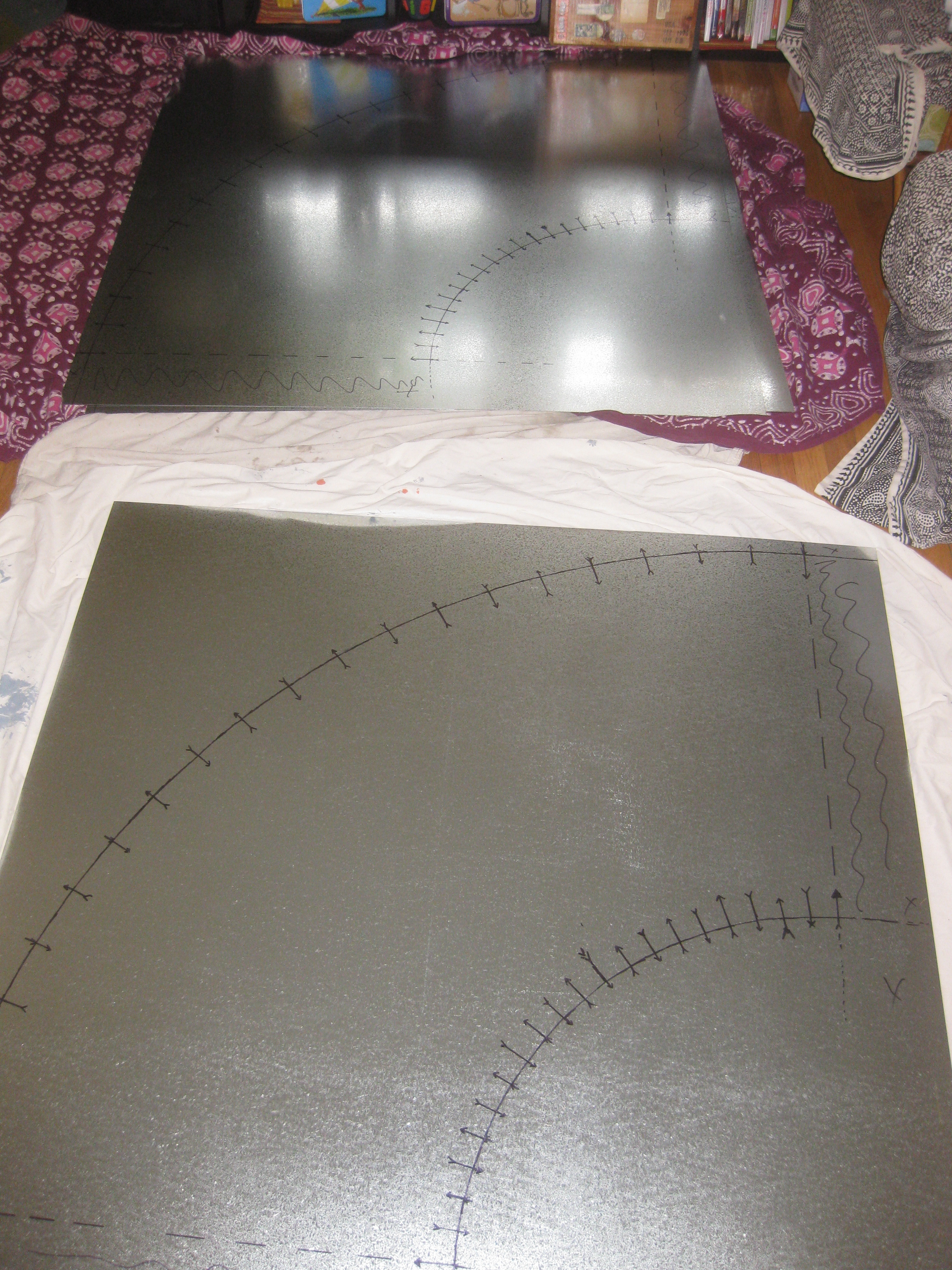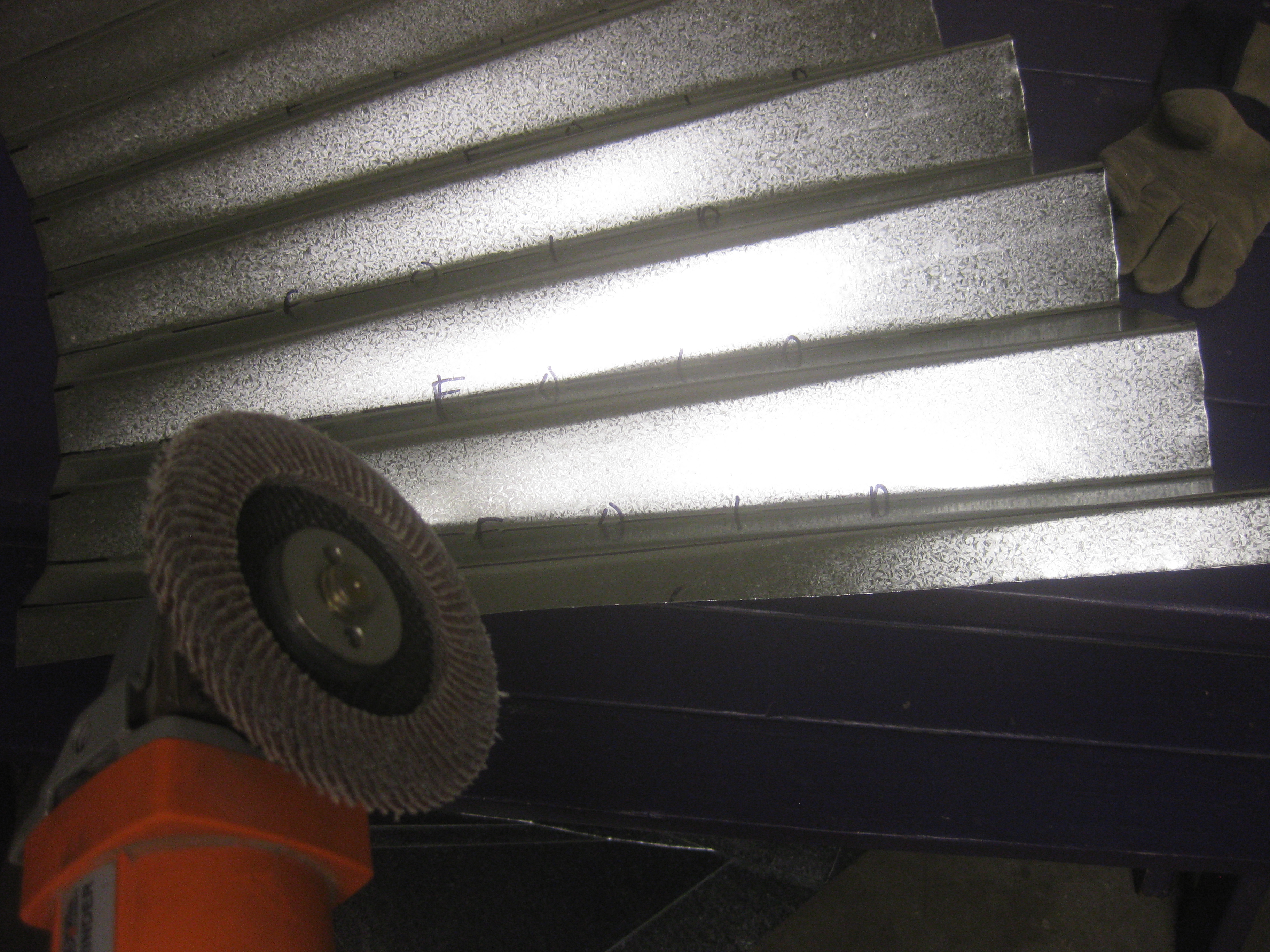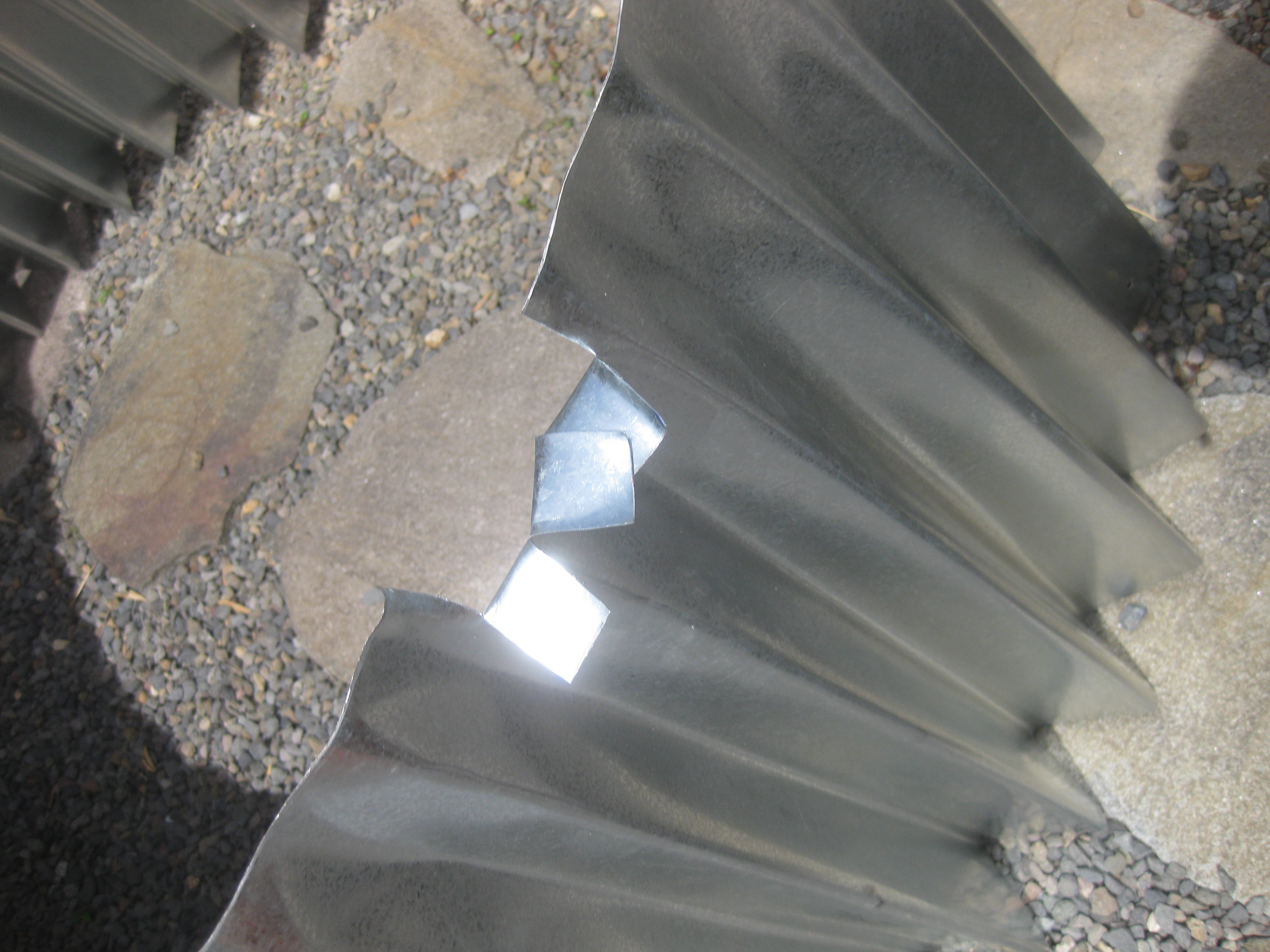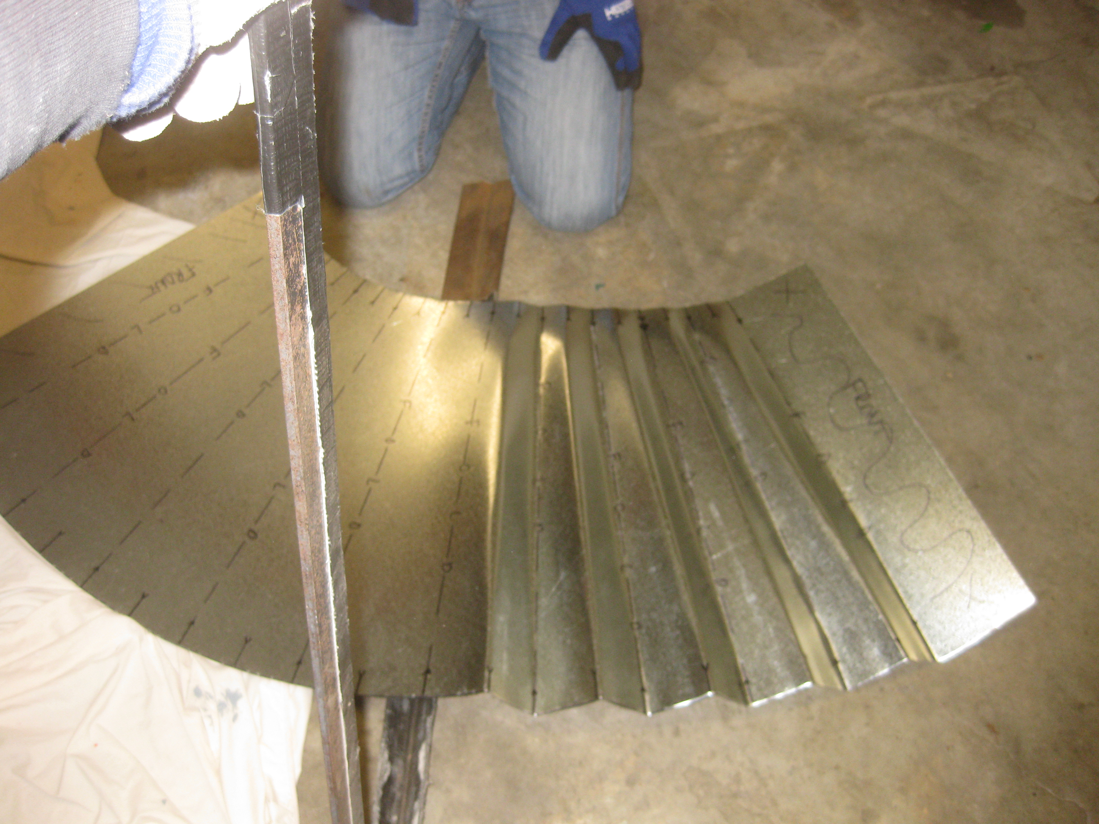Tin folding is definitely a two person operation. After four 4’x4’ sheets of metal are cut into an arc, you have to use a bending tool to create the folds so the metal looks like cupcake paper. It involves sheer force and a lot of physically flipping the tin over for every single fold.