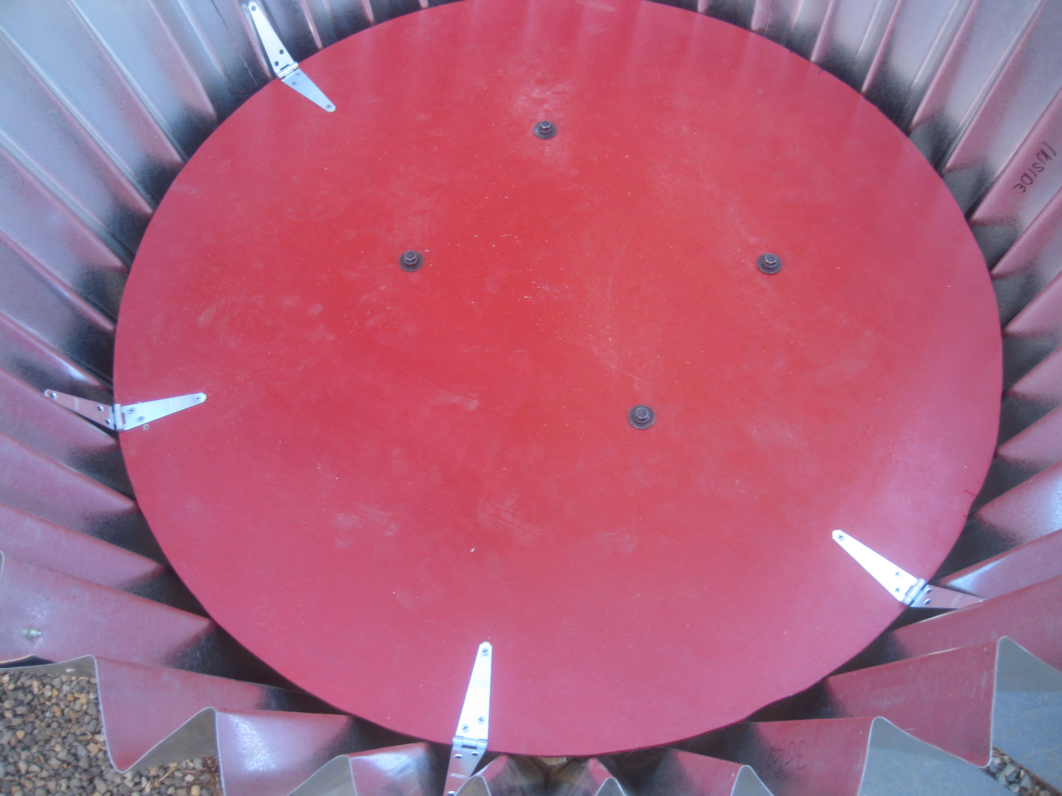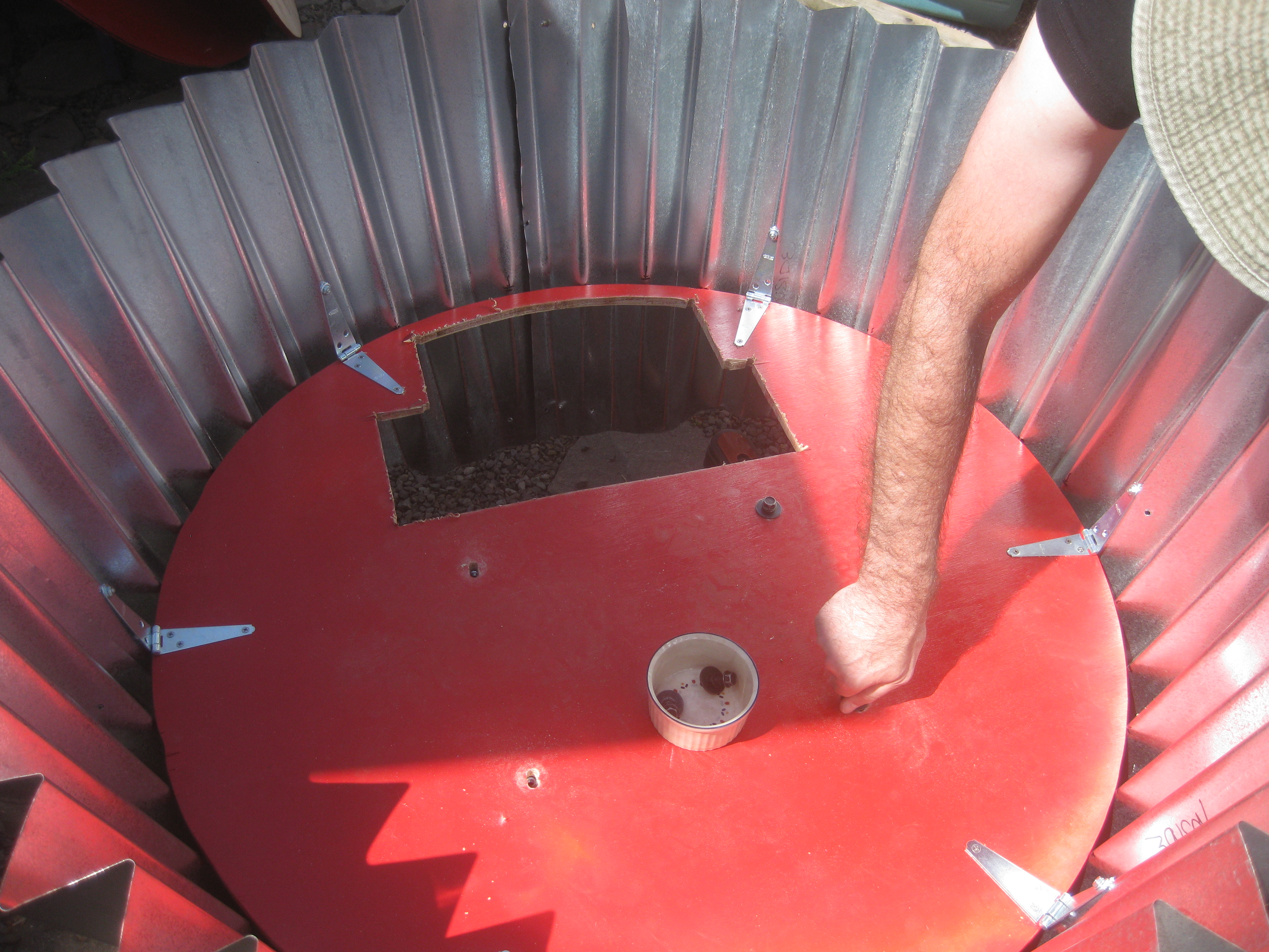 Since the ultimate goal for this cupcake is to get it to Burning Man this year in my ’77 VW Bus, I made the cupcake to be easily taken apart. The base detaches from the cart by four bolts and the tin comes off the base by unscrewing the hinges. The tin splits in two places and each piece can be laid out flat.