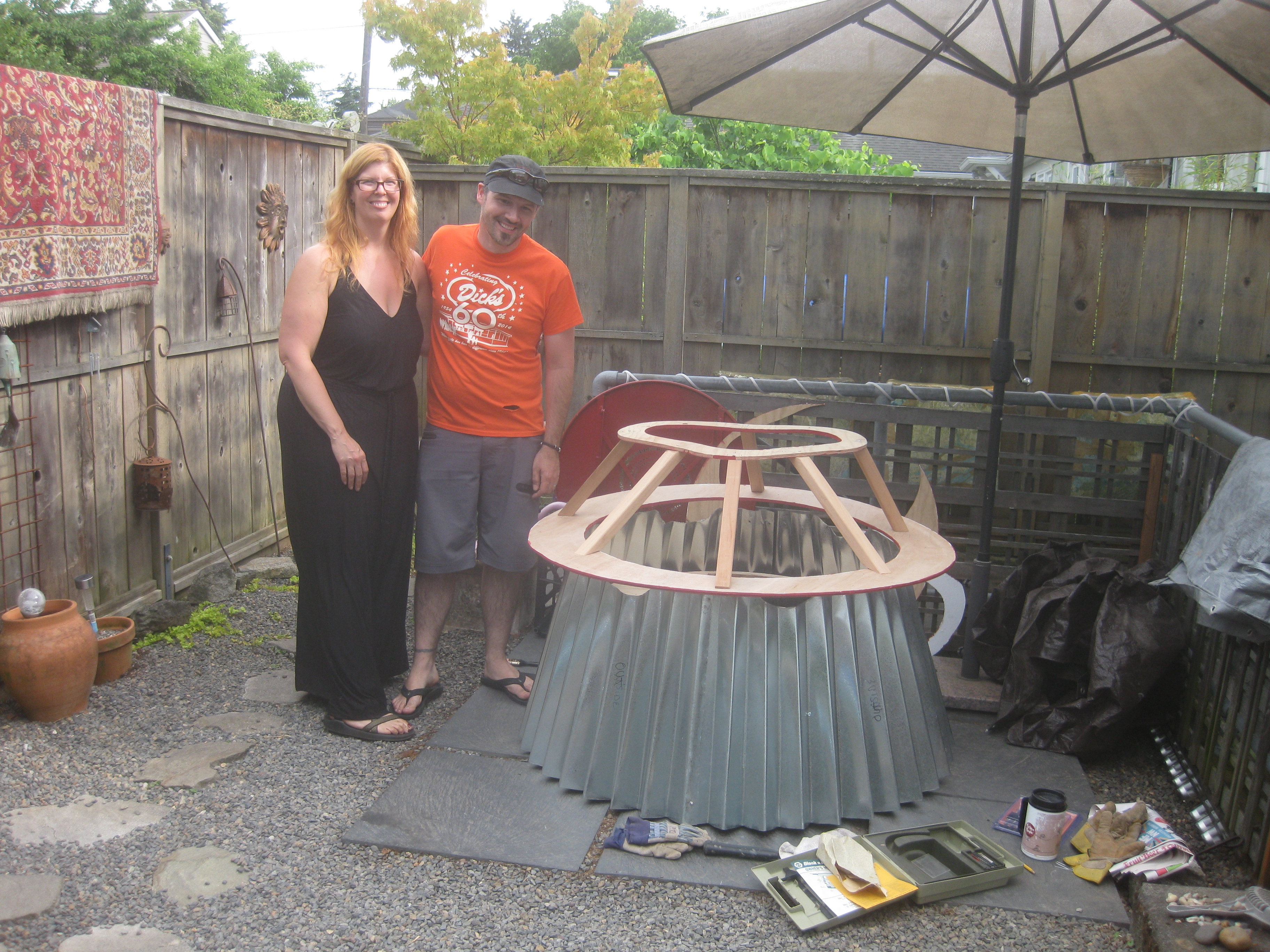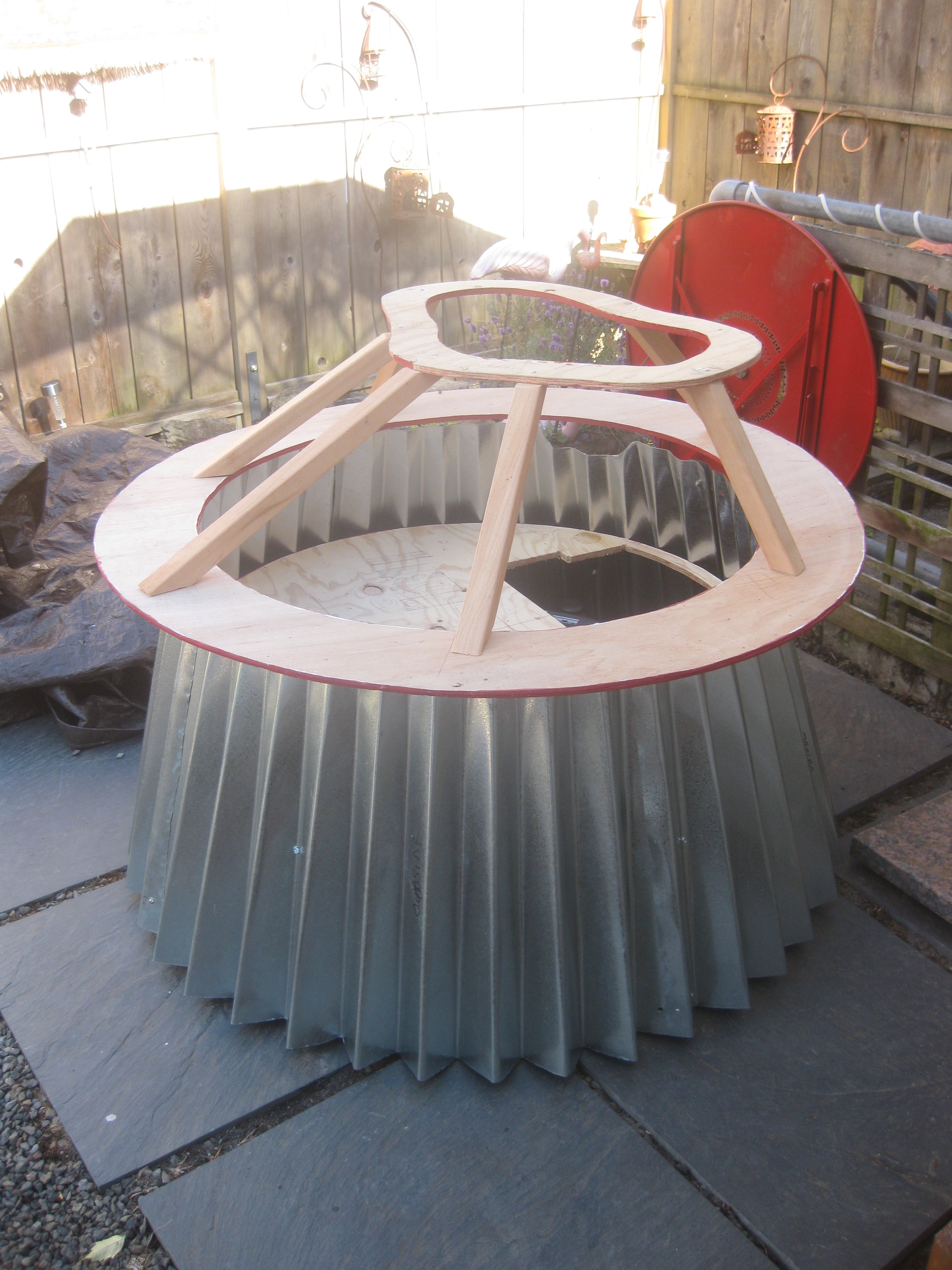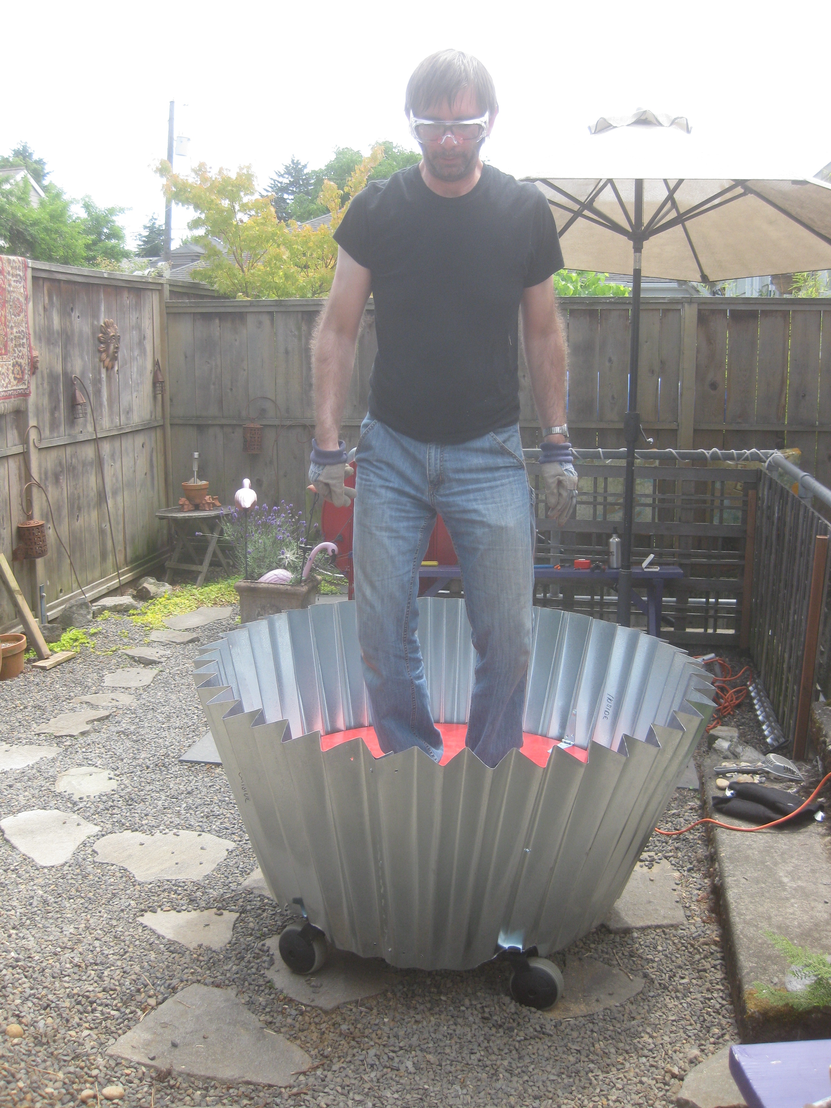 The folded tins and cart were transported to their new “home” for the next several weeks where I struggled with almost every aspect of the build. Attaching the tins with rivets was physically challenging – seriously. Then I discovered I overlapped the folds too closely and the tin was too small. I had to take it apart and put it back together again. Then it was floppy. It took me an hour to figure out how to get my body into a position where I could put enough force into my hands to squeeze each fold closer together to tighten the diameter. Whew!