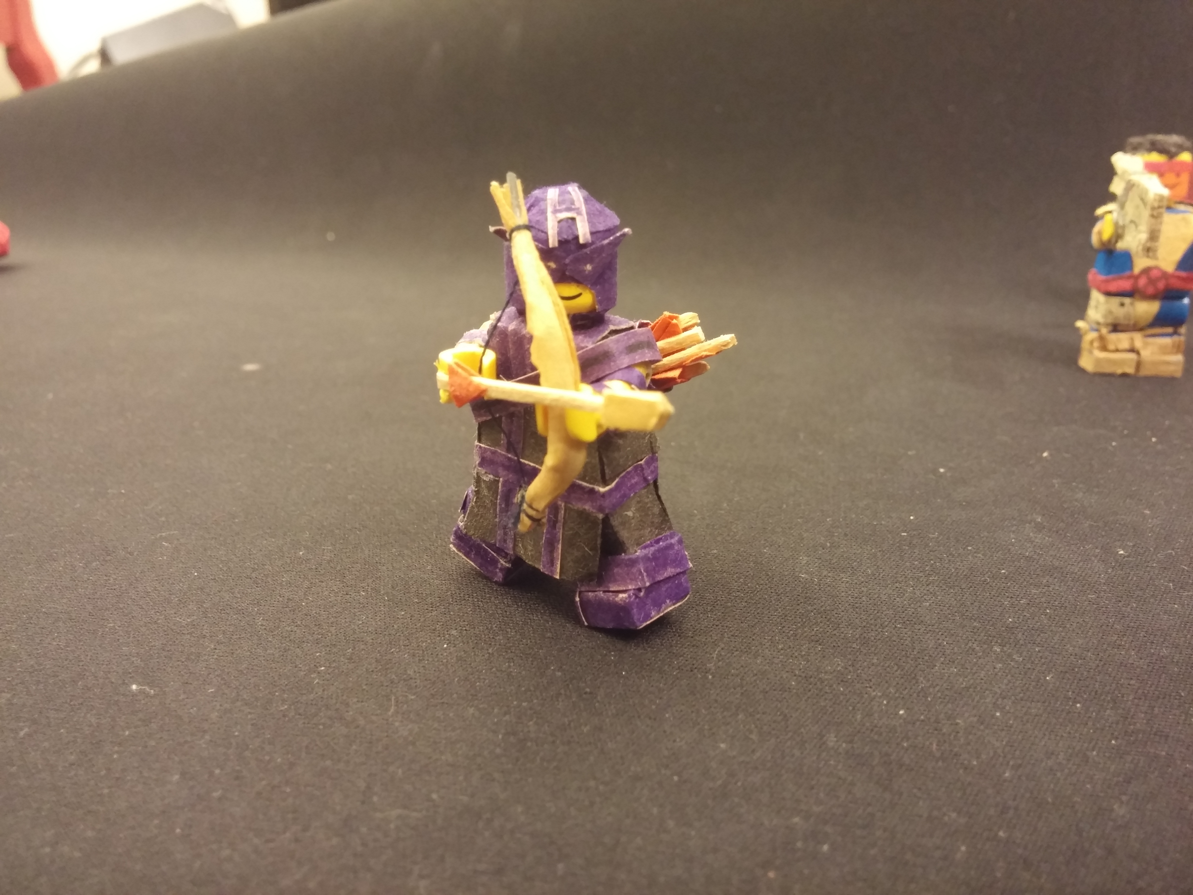 Hawkeye was another wide stance character. I thought it looked better. He’s wearing the classic black and purple costume. I made a quiver, arrows, and a bow too. I cut a slot out of one hand to hold the arrows. I only had a few Hawkeye solo comics from my brother, but I never followed his exploits outside the solo run.