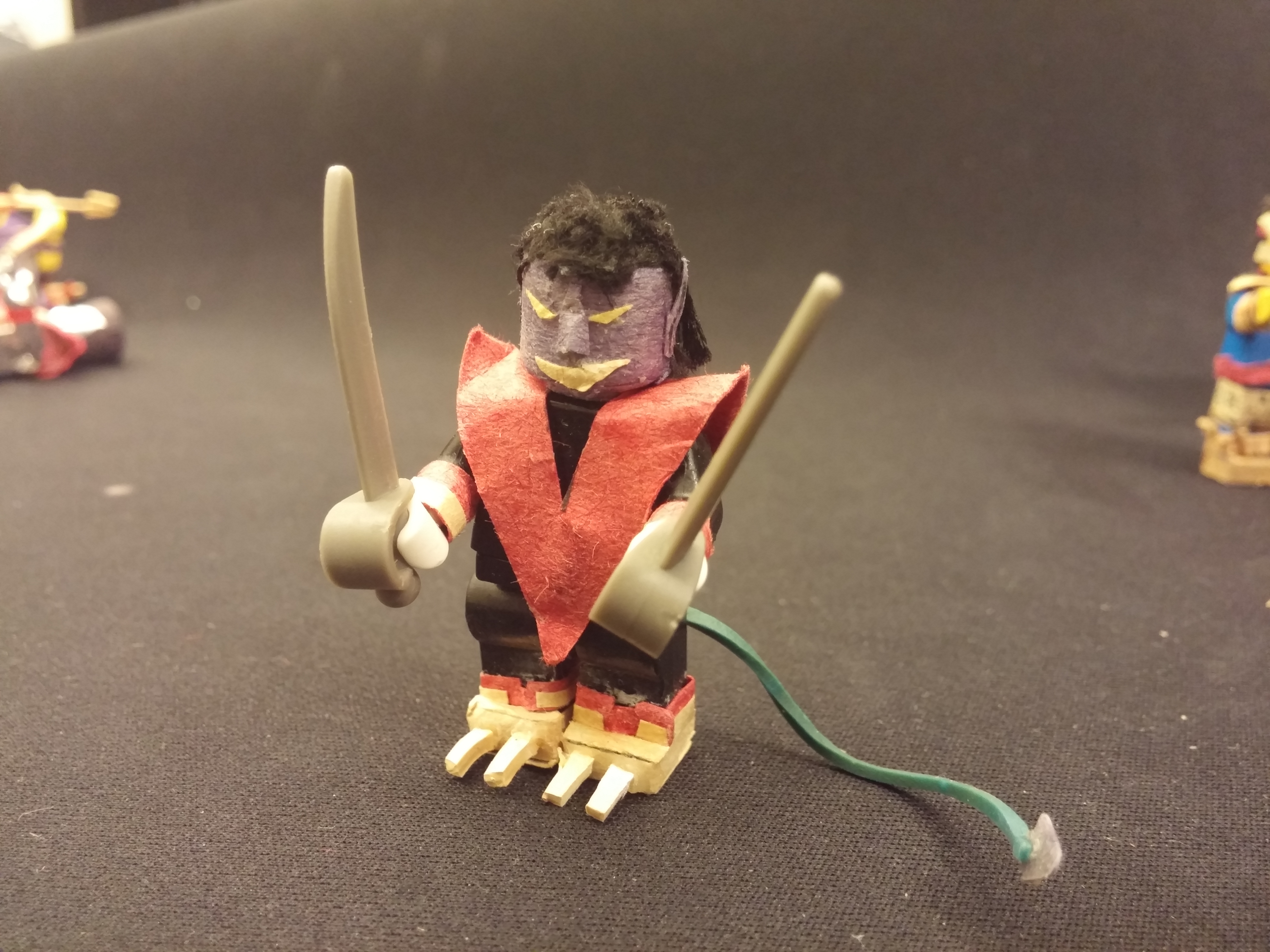 Nightcrawler was one my favorite X-Men for a long time, so I wanted this one to be good… it didn’t exactly turn out that way. Costume wise, he was OK. The feet were three-toed like in the comic. I used white rubber bands for toes and blue rubber band for the tail, but the head was never right.