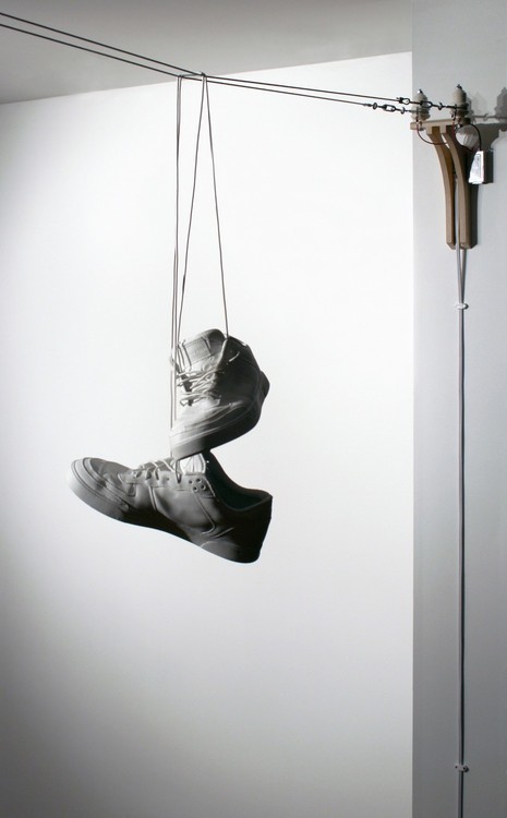 Ricochet Studio produces exquisite ceramics that look like everyday objects, like this clever and functional domestic lighting piece called Shoe Toss, which features porcelain shoes hung over a telephone wire.