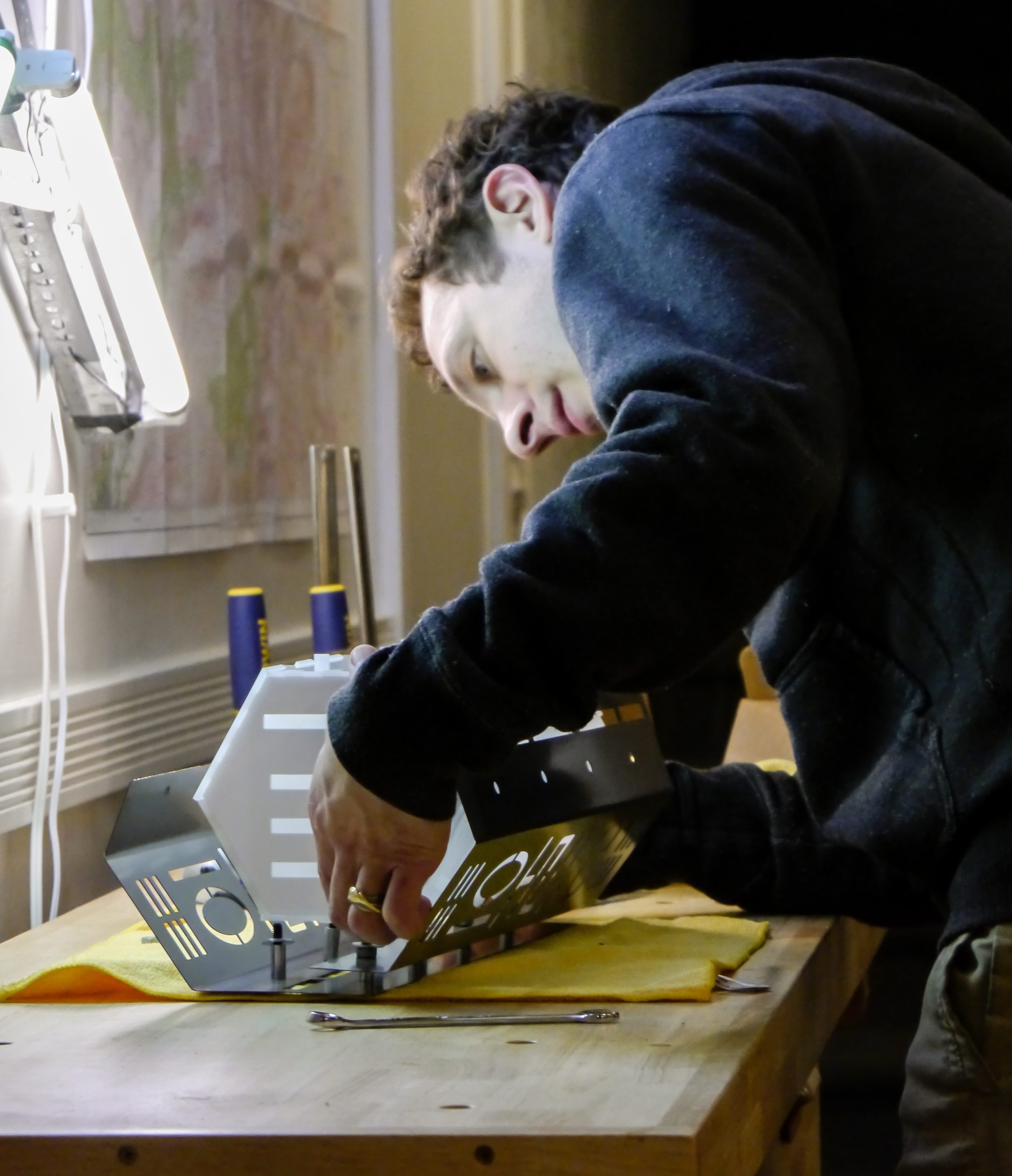 For the actual fabrication, I did everything myself, except for the actual laser-cutting of the steel, including bending and finishing the steel, laser-cutting the acrylic interior, wiring the socket (UL-listed!) and then actual assembly. I did some of the harder work at Maker-works (like laser-cutting and bending) and the assembly in my basement, and the curing of the steel in my garage. I had to clean and rust-proof all the 150 pieces of raw steel in my garage in the middle of Michigan winter and that was not fun.