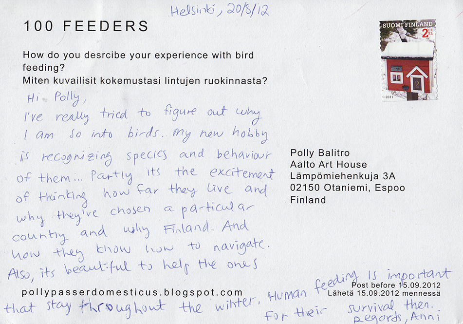 100 Feeders is a project by artist Polly Balitro consisting of 100 bird feeders made from recycled boxes that were distributed to people in Finland. The experiences of the participants were recorded in postcards they sent back to the artist.