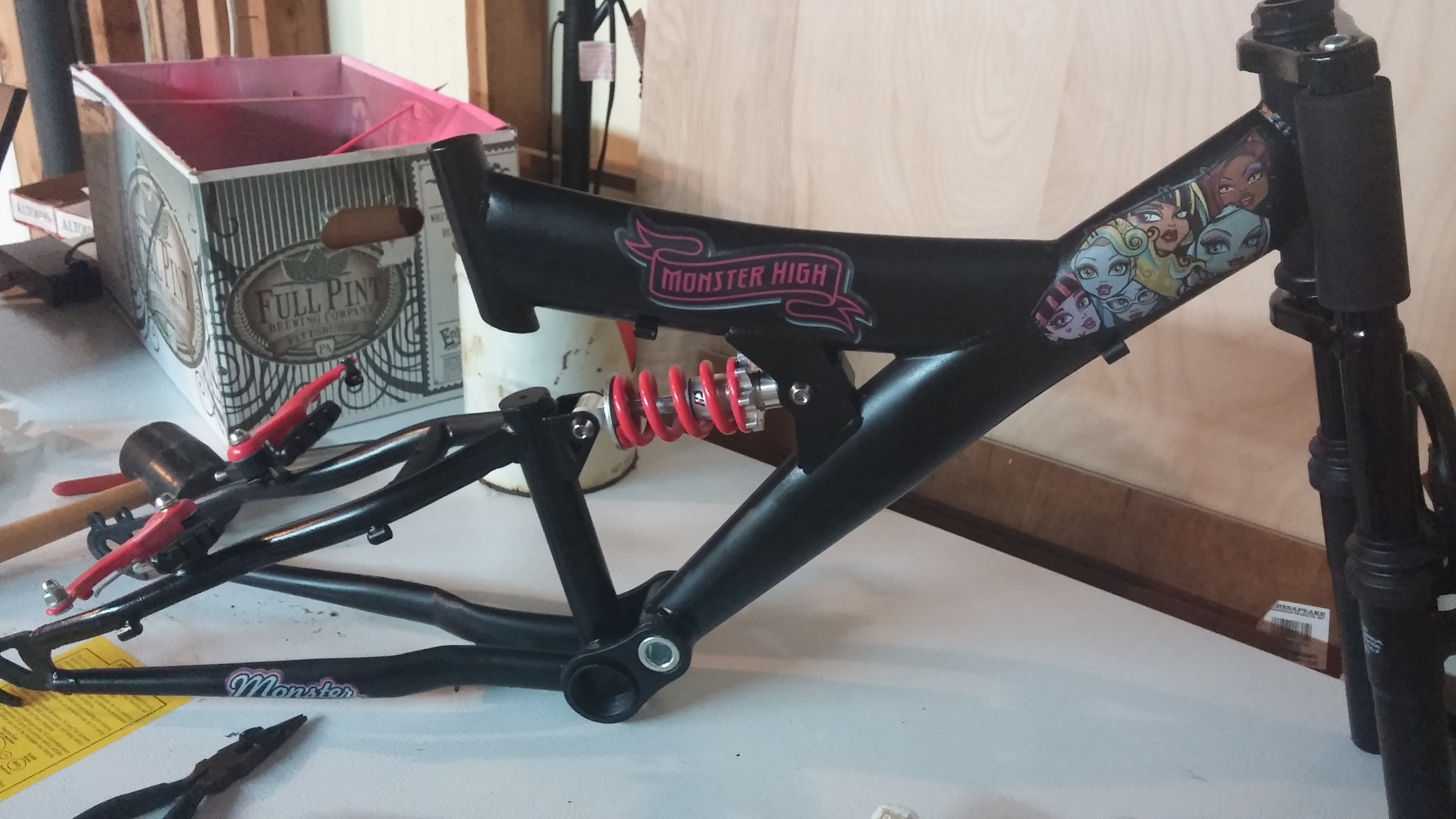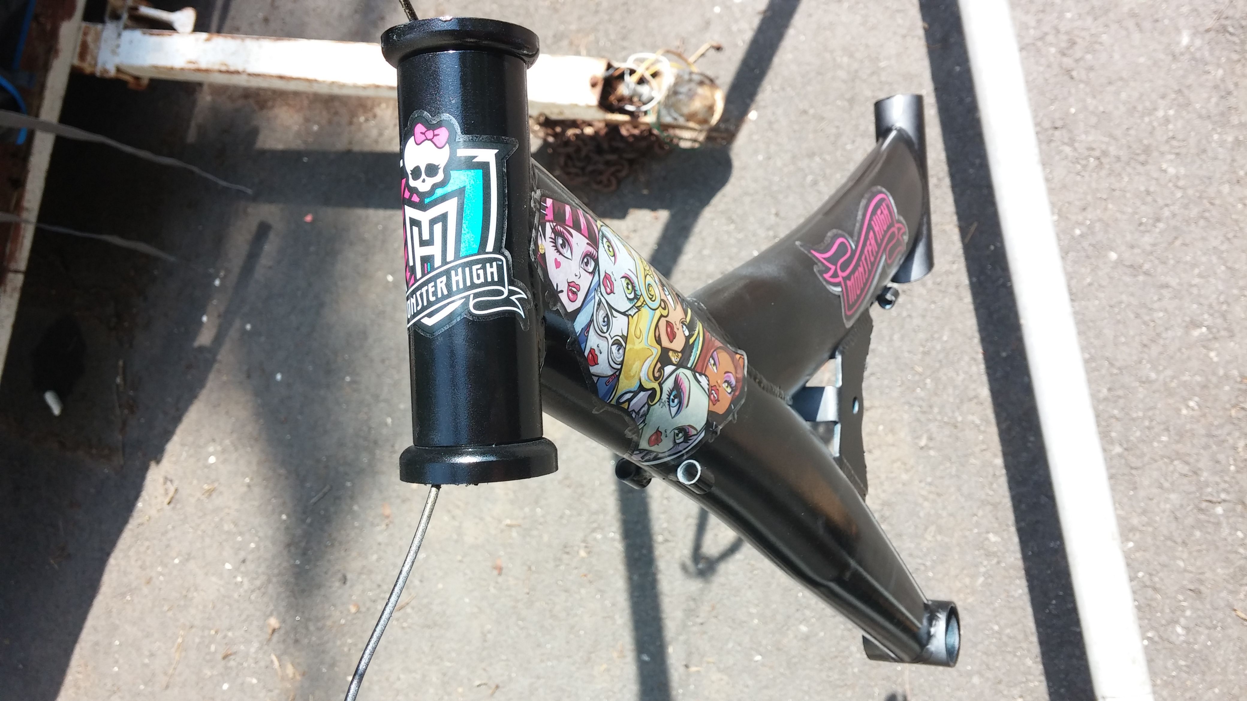 So began the complete bike makeover: tearing-down, sanding to bare metal, priming, painting, and decorating with Anna’s chosen Monster High theme.