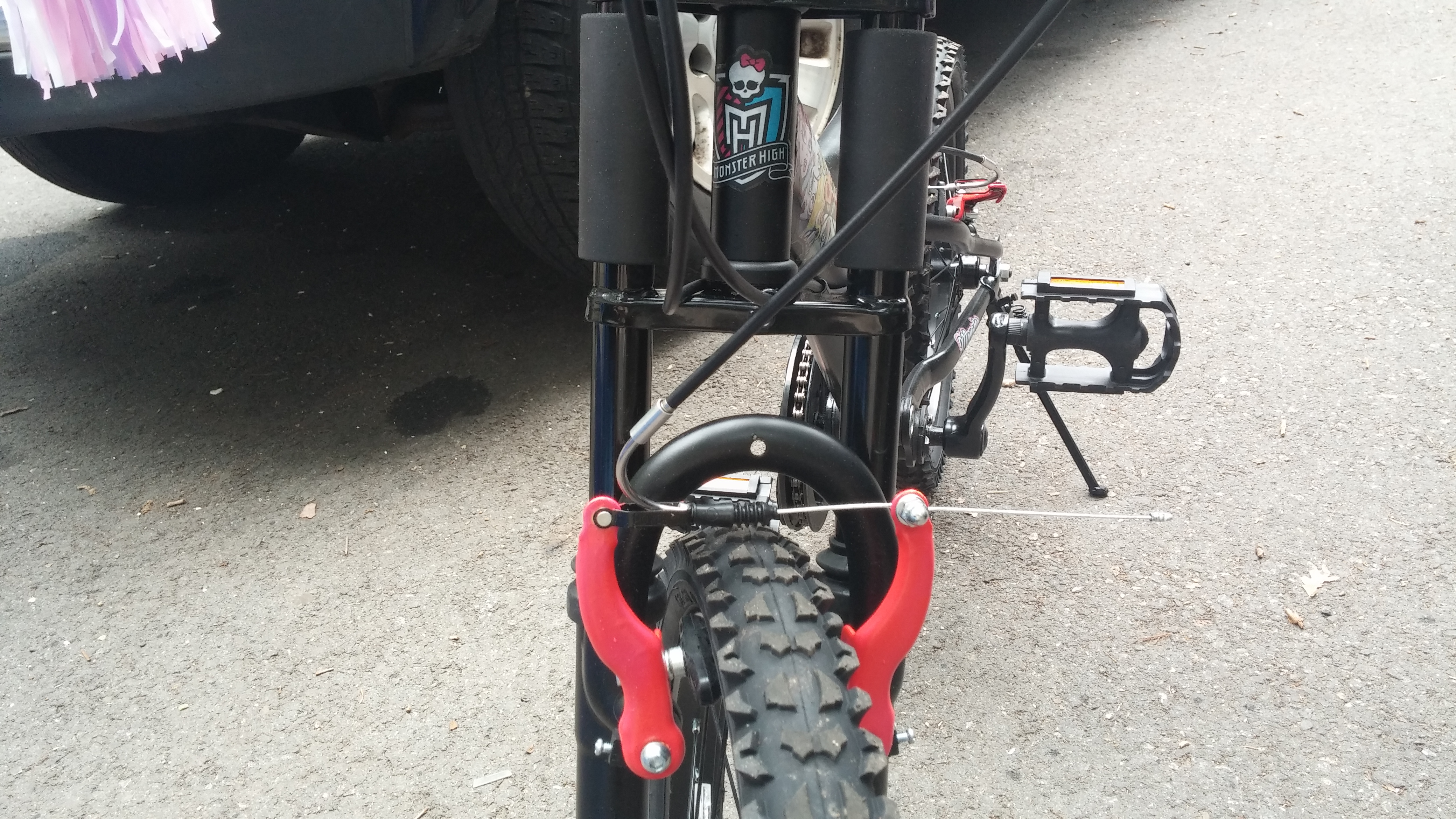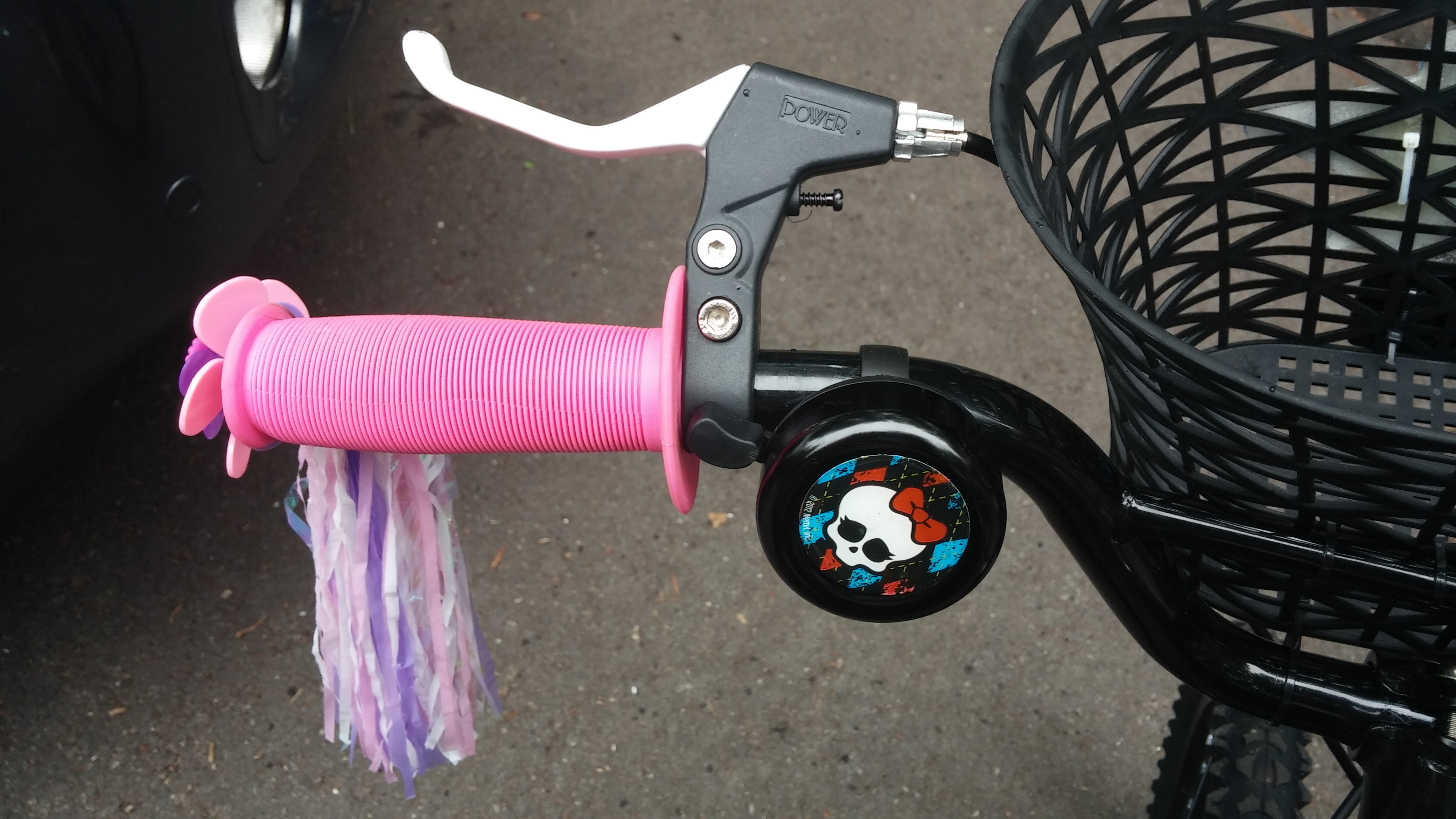 There was plenty of upside, though. Anna knows that her bike is one of a kind. No where in the universe will you find one just like it. In addition to picking the colors and various Monster High decals, we picked out a pink, black and white seat, pink hand grips with tassels and spinning flowers on them, and a black basket and bell both with Monster High decorations.