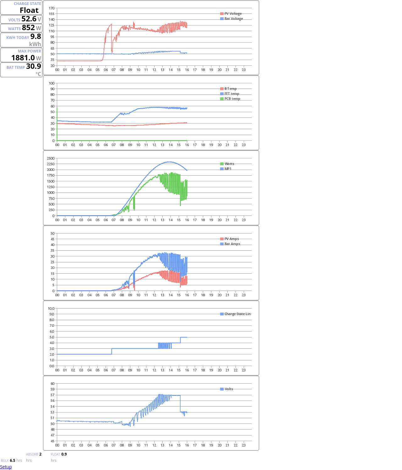 This bank consists of eight Deep-Cycle batteries, providing 48 volts and (theoretically) 12kWh of power. From these batteries, an inverter turns everything into usable 120 volt power. He can monitor the system using The Blackbox Project running on a Raspberry Pi 3.