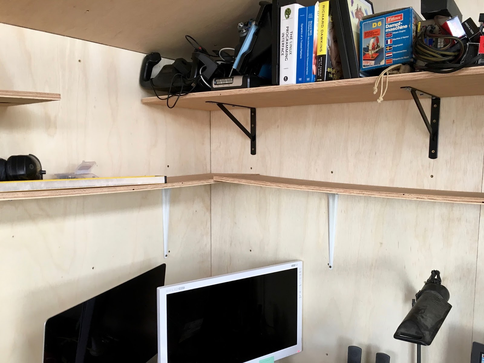 Graves finished his shed off with a lab bench on one side and an ample desk on the other. Additionally, he put up quite a bit of shelving on the plywood walls. Lighting is still a work in progress, and, like most projects of this type, it will probably never really be done.