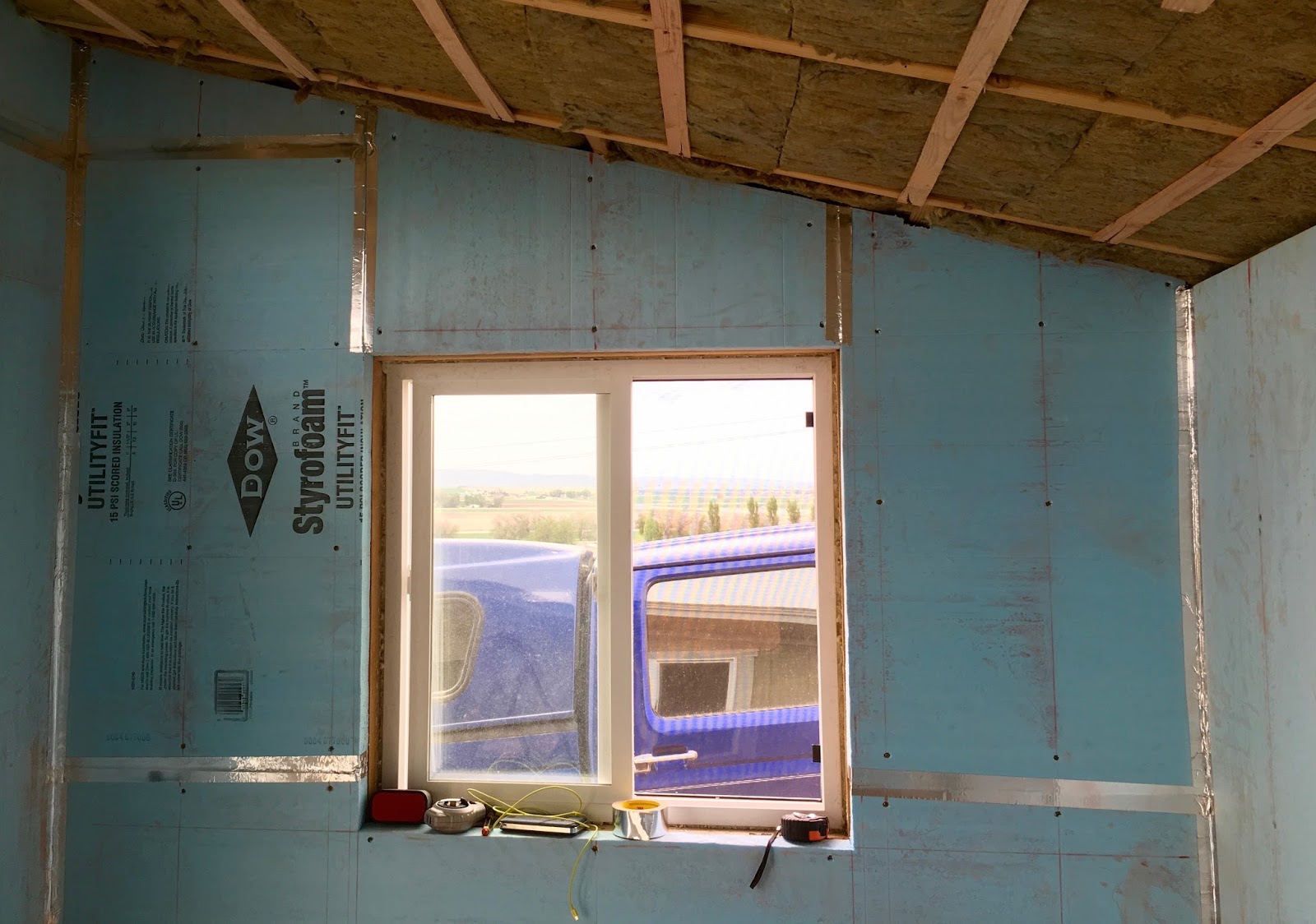 Once the insulation was in, he installed foam board insulation for an extra layer of protection from the elements. Over this, one would normally install drywall, but Graves instead opted to use plywood. His reasoning was that it gives a solid surface for mounting stuff, especially since the wall studs were recessed behind a layer of foam board. Also, he likes the look of plywood interiors.