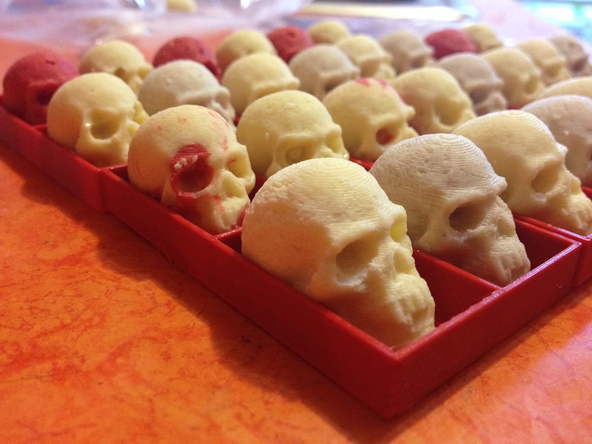 Decorations and costumes aside, candy does play a big role in the holiday tradition. 3D printed candy ups the ante, especially Anna Kaziunas Franceโs 3D printed white chocolate skulls. Actually, the skulls are not 3D printed themselves, but rather the molds used to make the candy.