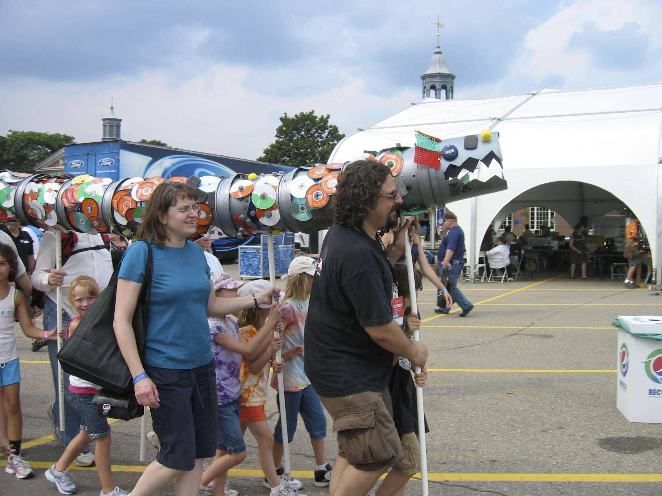 Personally, I’d have to say one of my fondest memories was at the first year, watching hacker and inventor Mitch Altman teach countless people, ages 5 to 85 (including someone with a giant Henry Ford head on), how to solder. Brought tears to my eyes. Here are some of my shots from the first Maker Faire Detroit, in 2010: