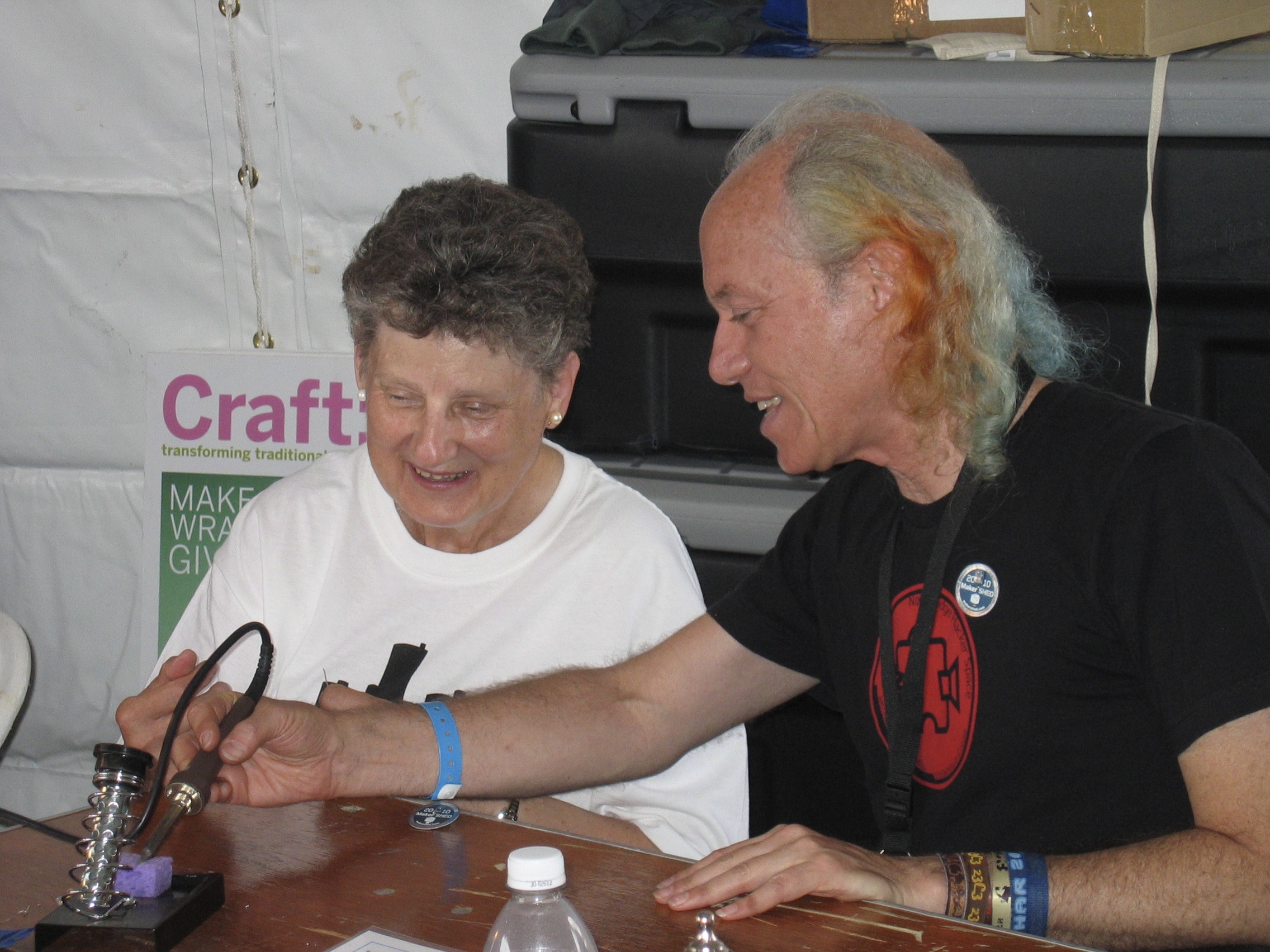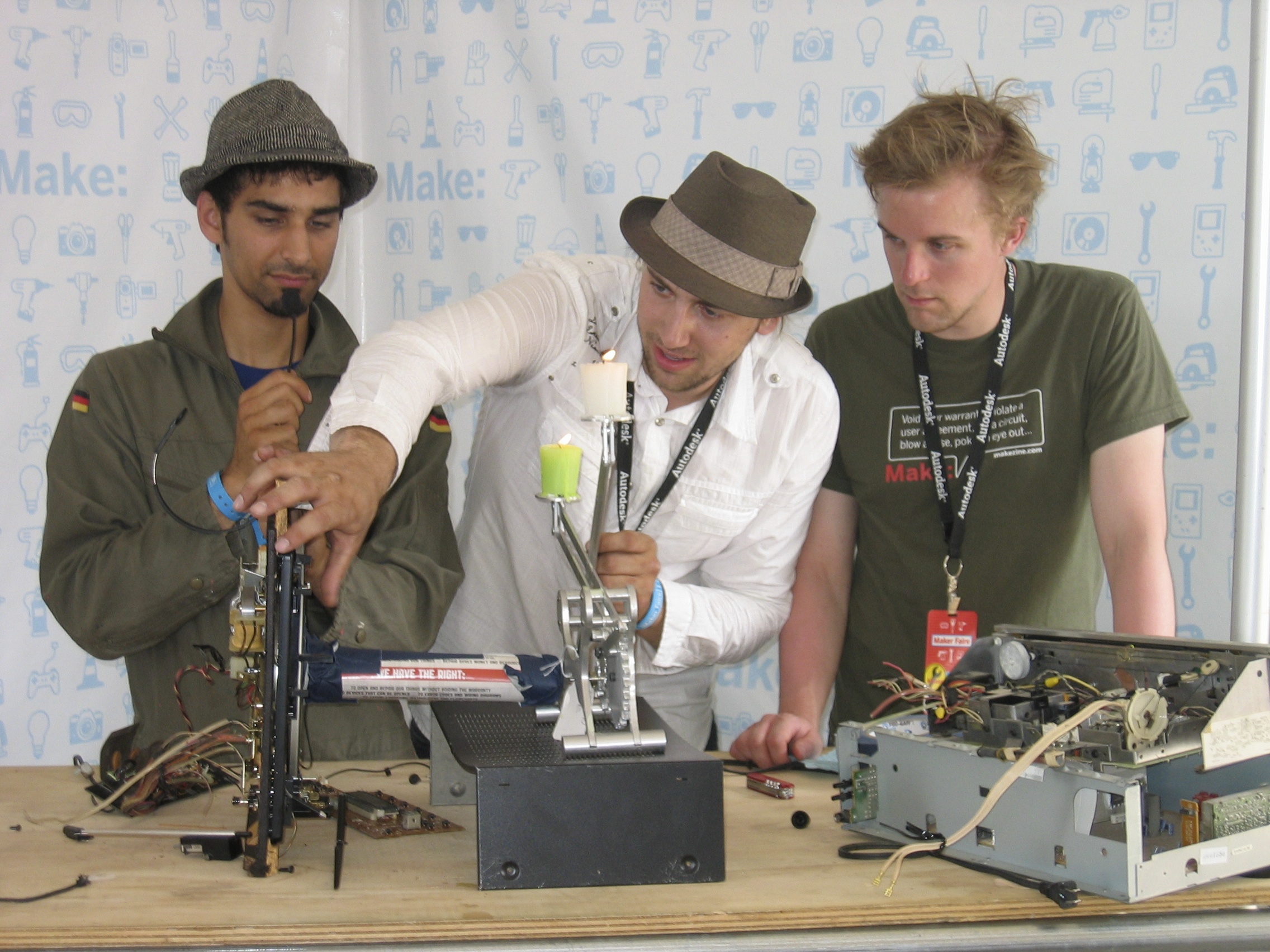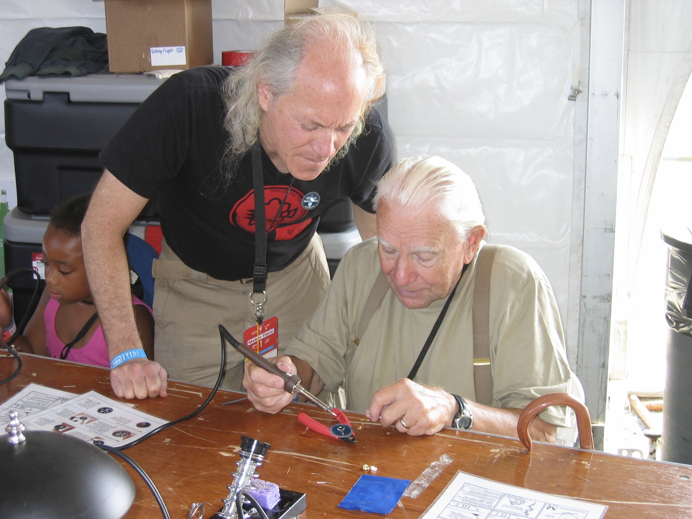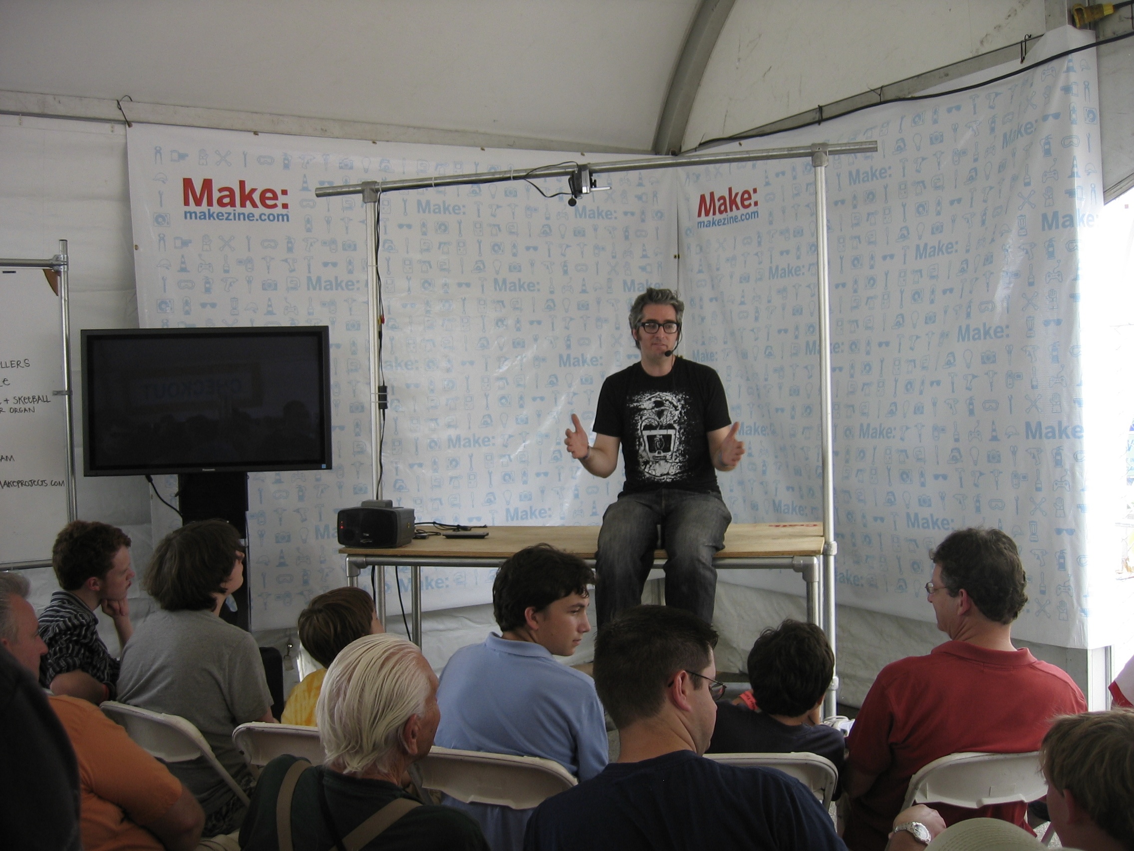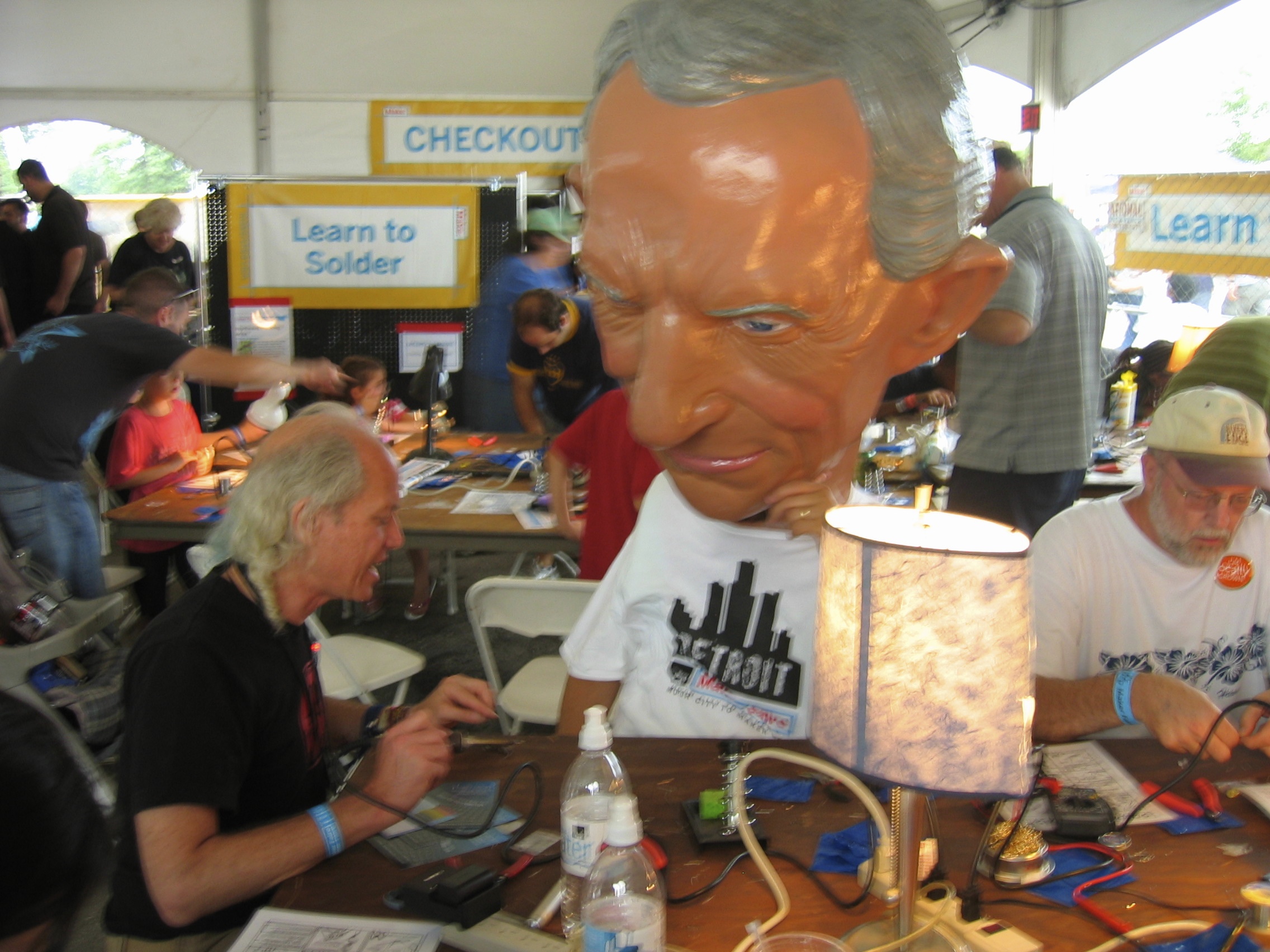 Personally, I’d have to say one of my fondest memories was at the first year, watching hacker and inventor Mitch Altman teach countless people, ages 5 to 85 (including someone with a giant Henry Ford head on), how to solder. Brought tears to my eyes. Here are some of my shots from the first Maker Faire Detroit, in 2010: