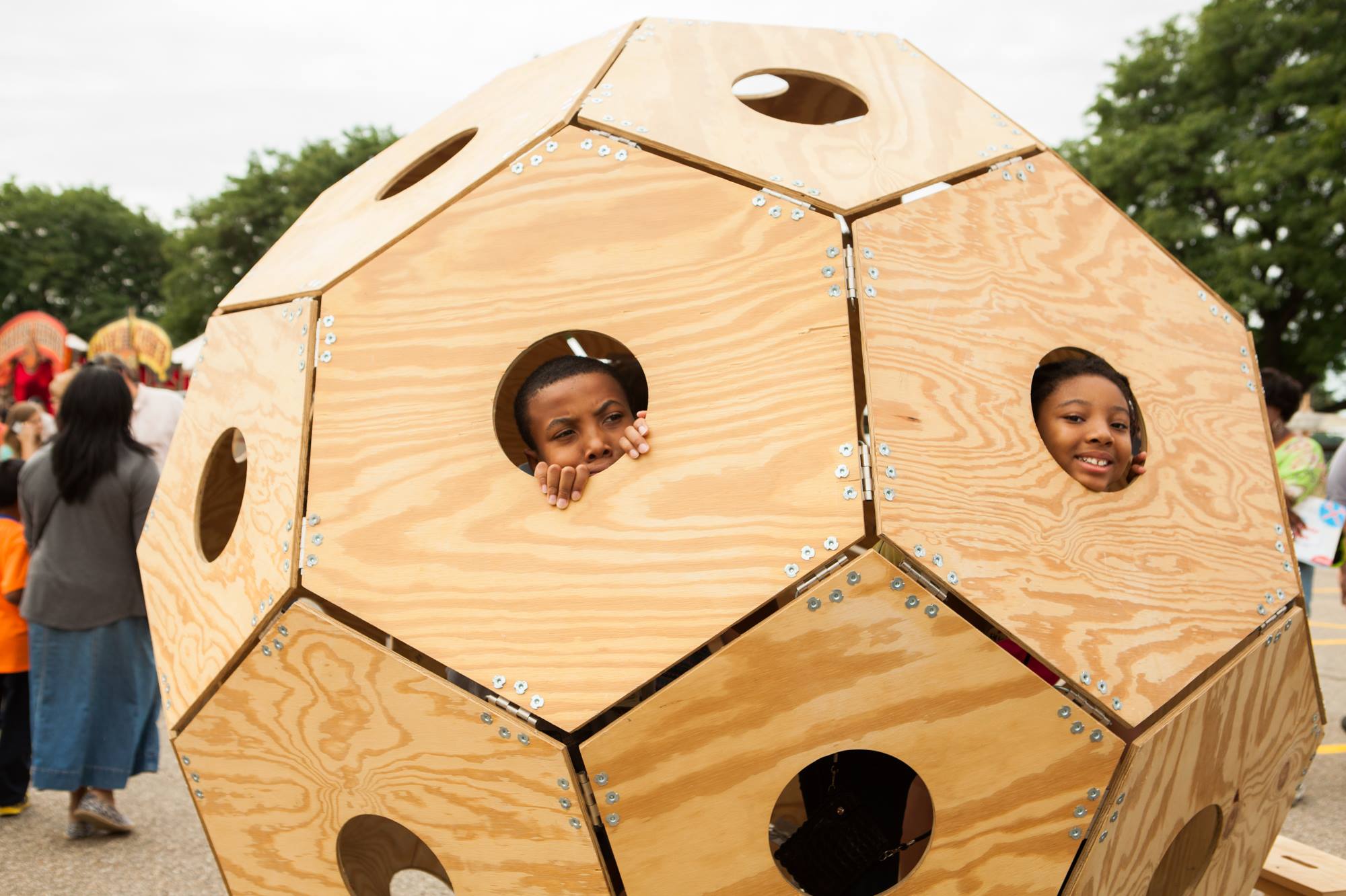 Ann Arbor-based Anya Sirota + AKOAKI designed this modular DJ and broadcast booth for Detroit’s North End neighborhood, inspired by P-Funk and their iconic Mothership Connection album.