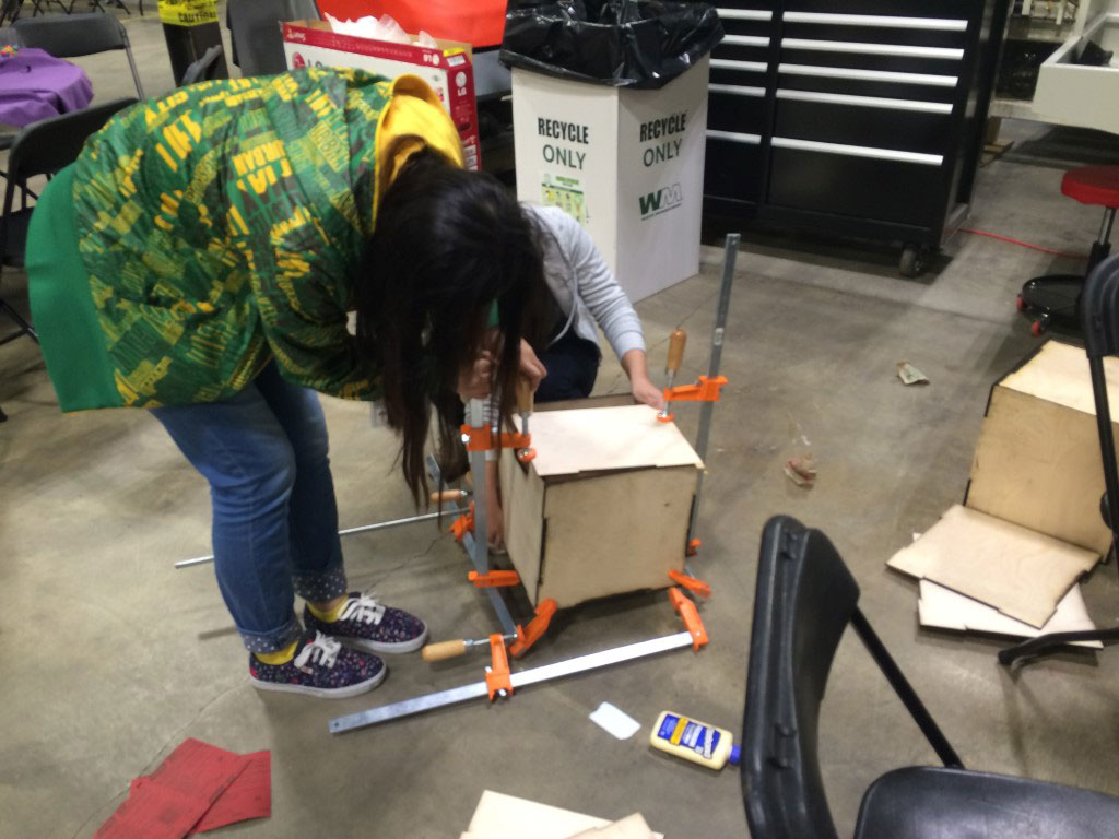 There were appliances around the building with labels explaining whether they could be disassembled and destroyed or only interfaced with software. Luckily, I got to see both in action. This was the part that really surprised me. I came to the event expecting to see people connecting to GE’s internet enabled appliances and writing apps to control them. There’s nothing wrong with that, I just personally find more pleasure in workshop construction than software. What I discoveredย was that nearly every entry into the hackathon involved a physical build!
