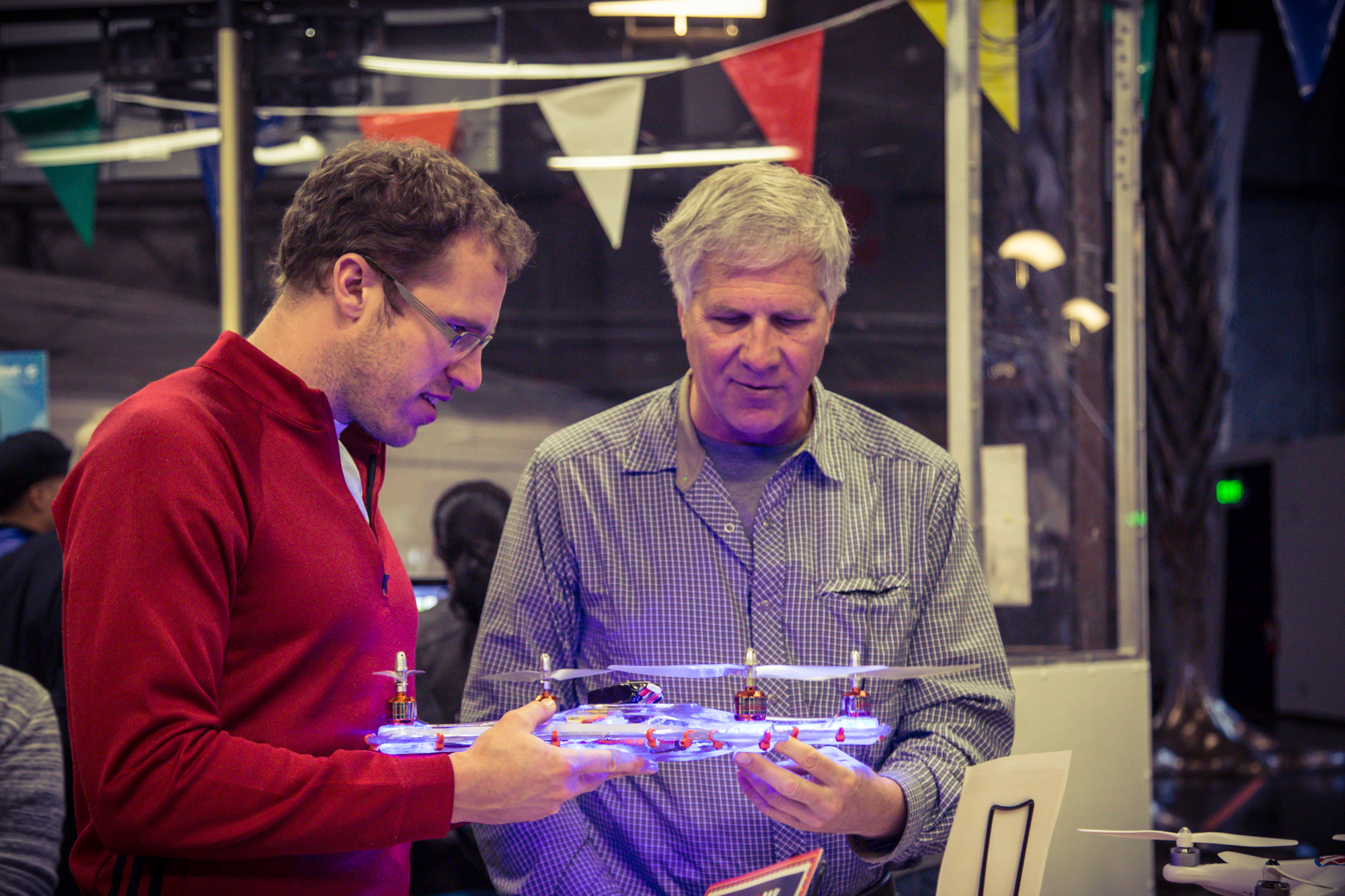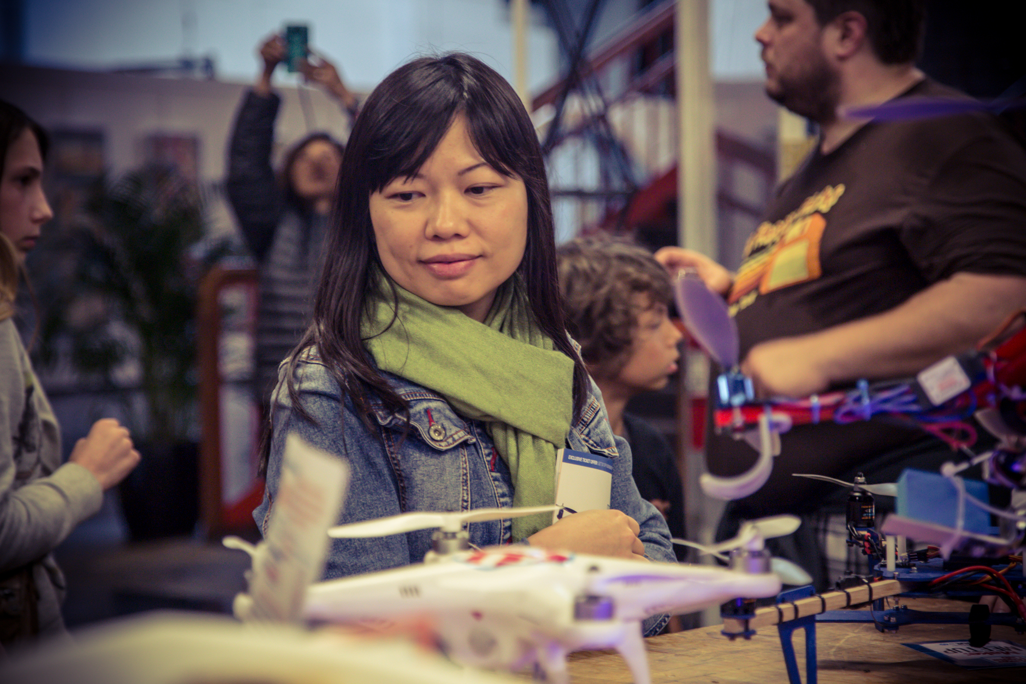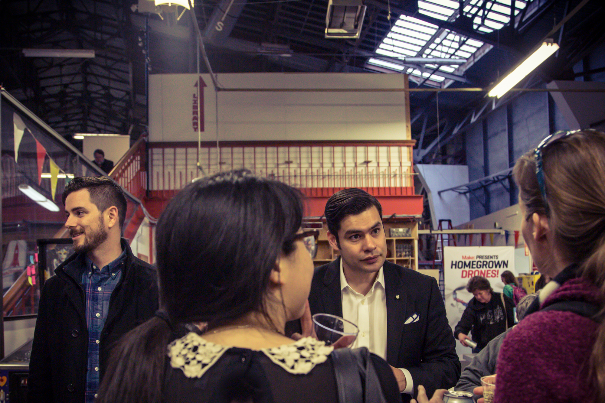 We welcomed about 200 guests to our Maker Media Lab at the Palace of Fine Arts for food, drinks, and the opportunity to talk about and explore all things drone. The buzz came to life with some amazing demos. We got to play with a variety of drones, and—thanks to our sponsor HP—we got to check out Sprout, their latest immersive computing platform, which has some incredible potential for drone prototype design.