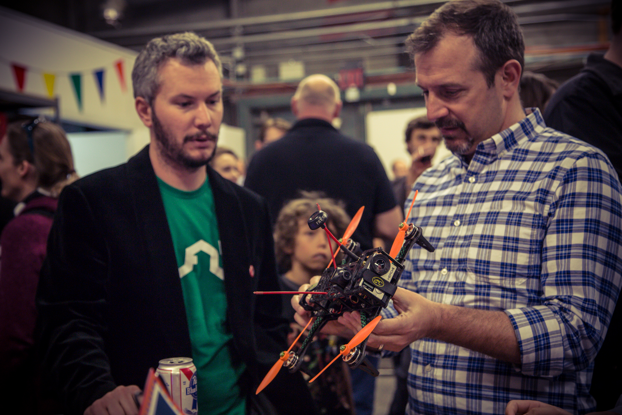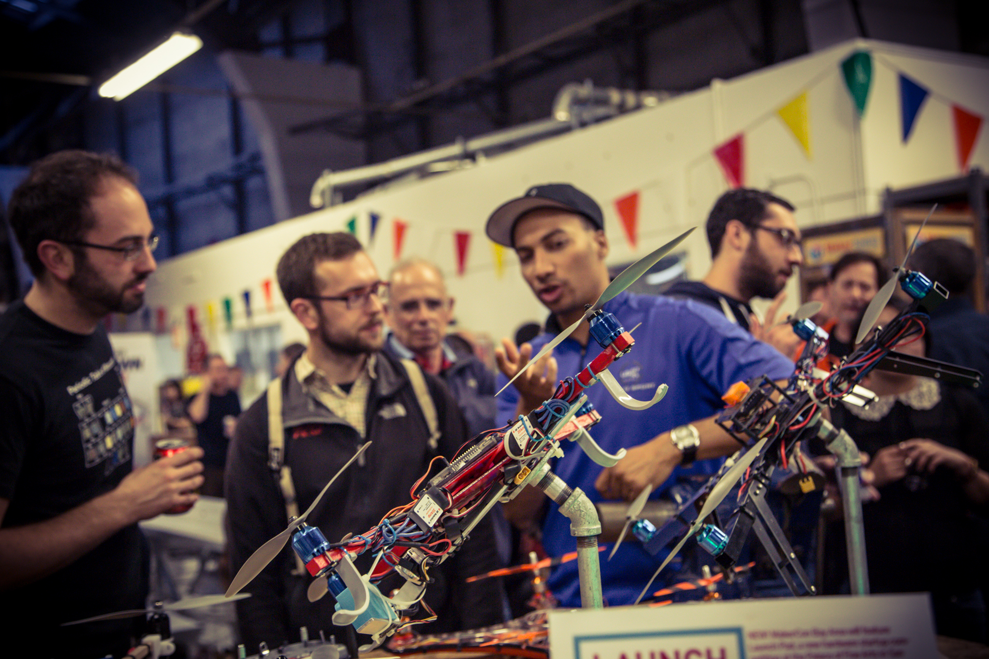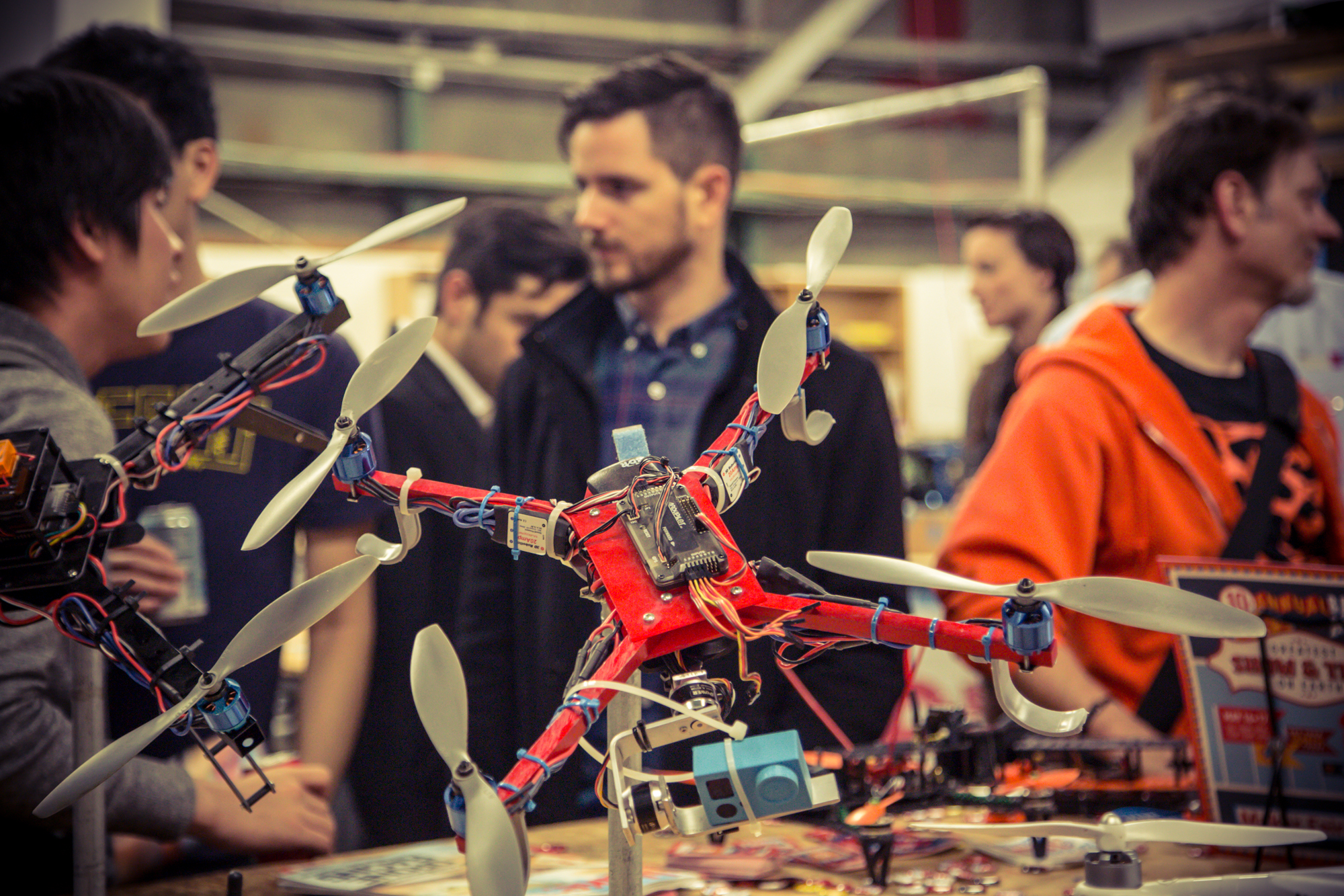 We welcomed about 200 guests to our Maker Media Lab at the Palace of Fine Arts for food, drinks, and the opportunity to talk about and explore all things drone. The buzz came to life with some amazing demos. We got to play with a variety of drones, and—thanks to our sponsor HP—we got to check out Sprout, their latest immersive computing platform, which has some incredible potential for drone prototype design.