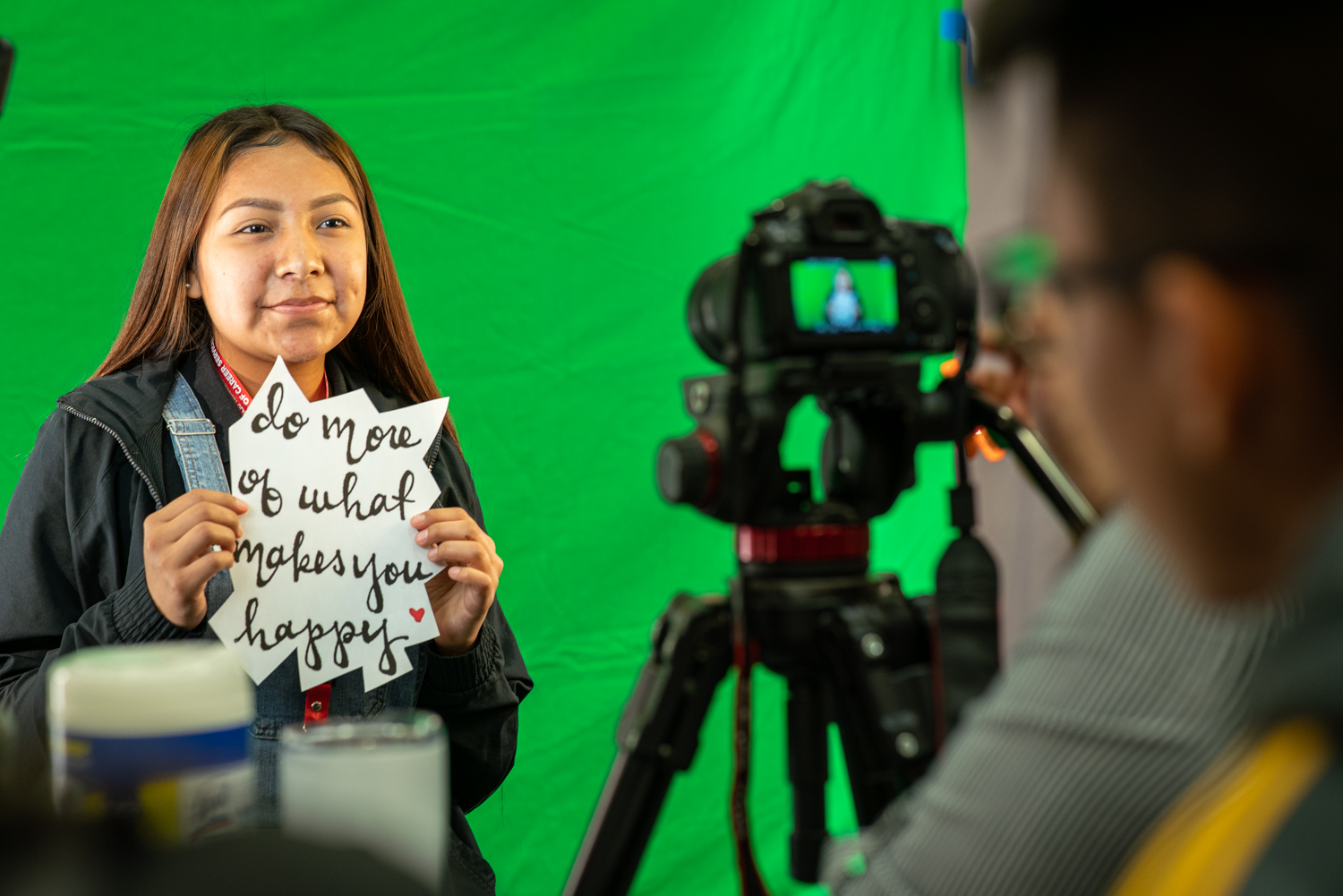 GREENSCREEN: Felicia Chischilly and other New Media students ran a Photo Booth backed by a greenscreen so participants can add special effects later.