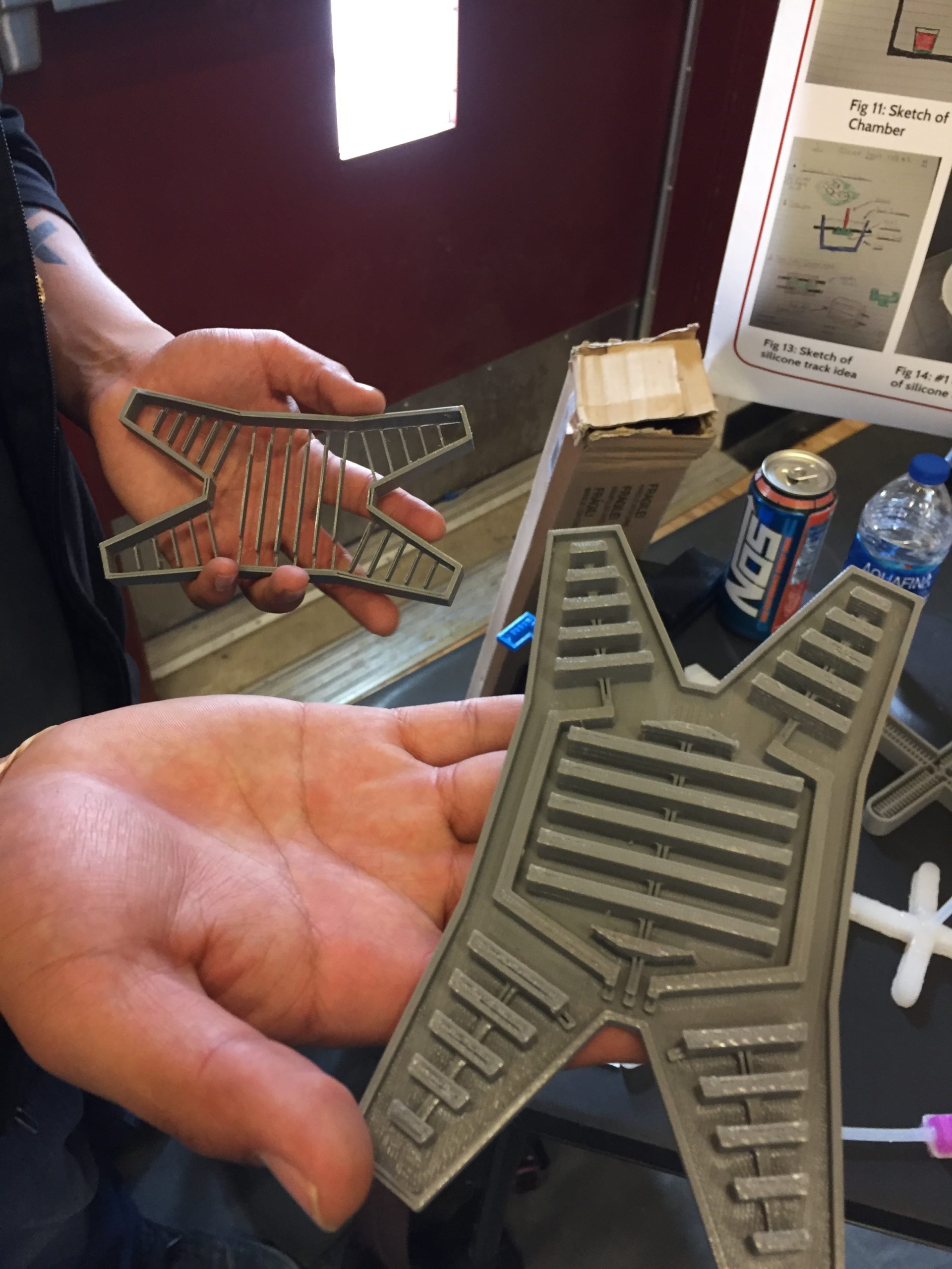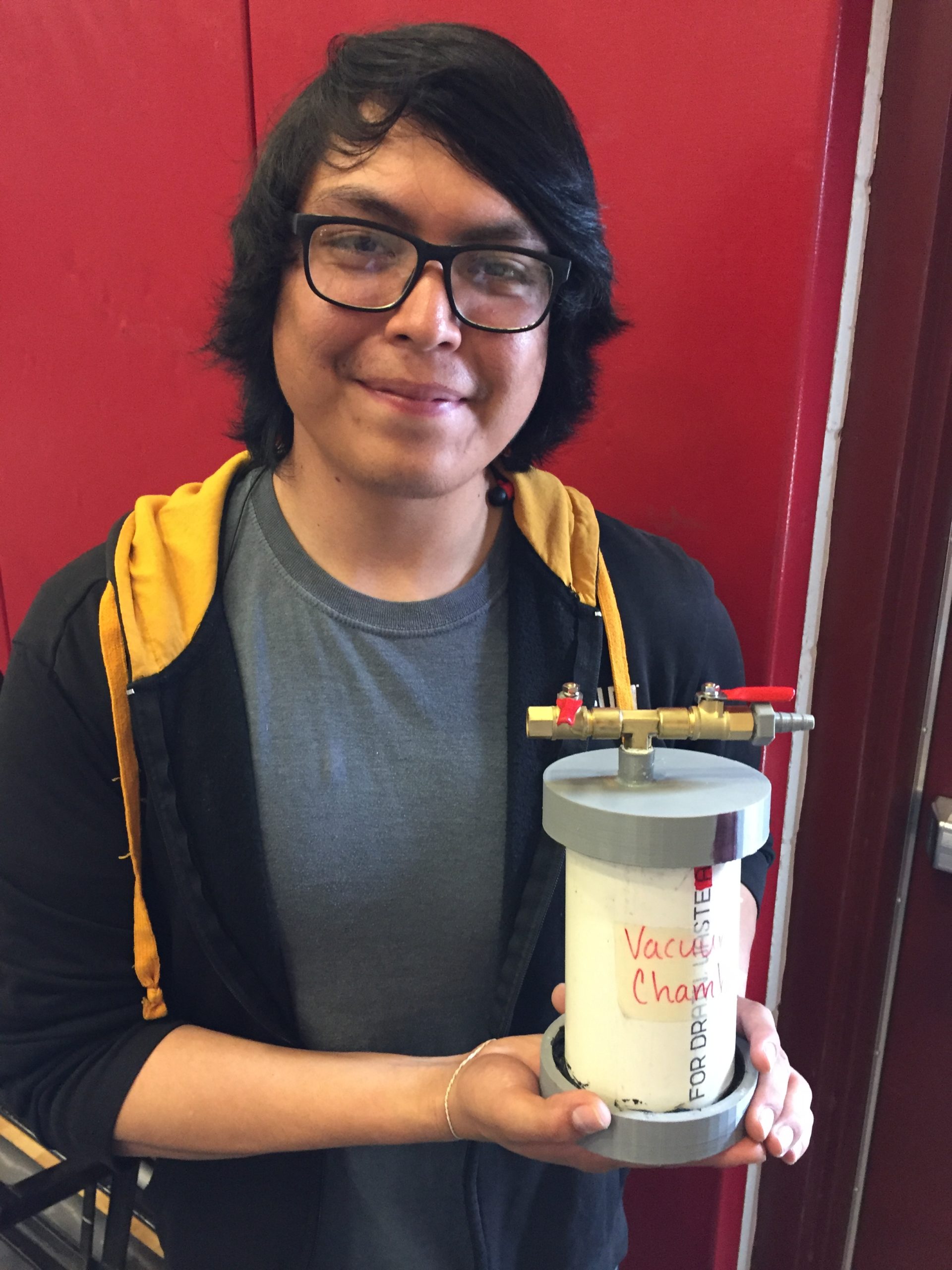 3D PRINTING: Jonathan Chinana exhibited his Soft Robotics experiments; he’s using 3D printed molds to cast silicone rubber actuators and grippers that change shape when inflated. Jonathan did a summer research program at Harvard University and came back full of skills and ideas but lacking some of their fancy equipment. He built this DIY vacuum chamber from PVC pipe and 3D printed end caps, for degassing the silicone castings.