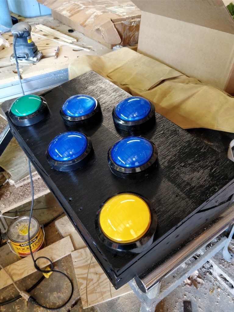 I slapped together this box to hold everything, with the buttons at an angle for slightly better ergonomics. Then I added coat of paint on it and sealed it up with polycrilic so it would be easy to clean.