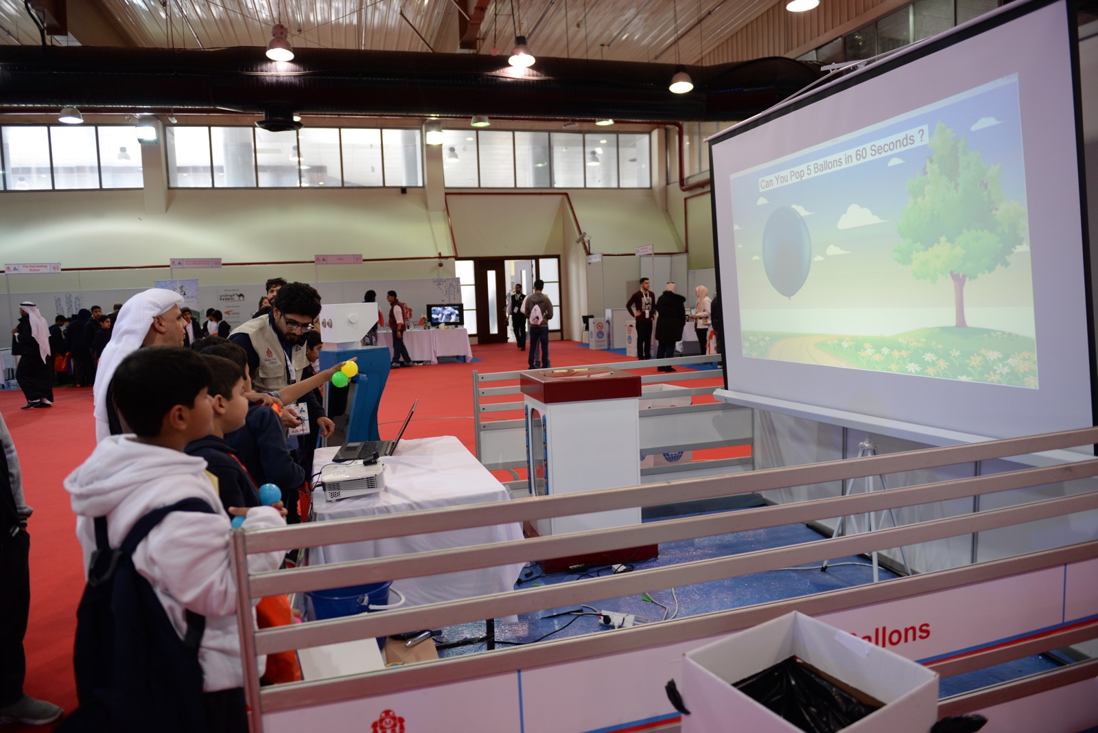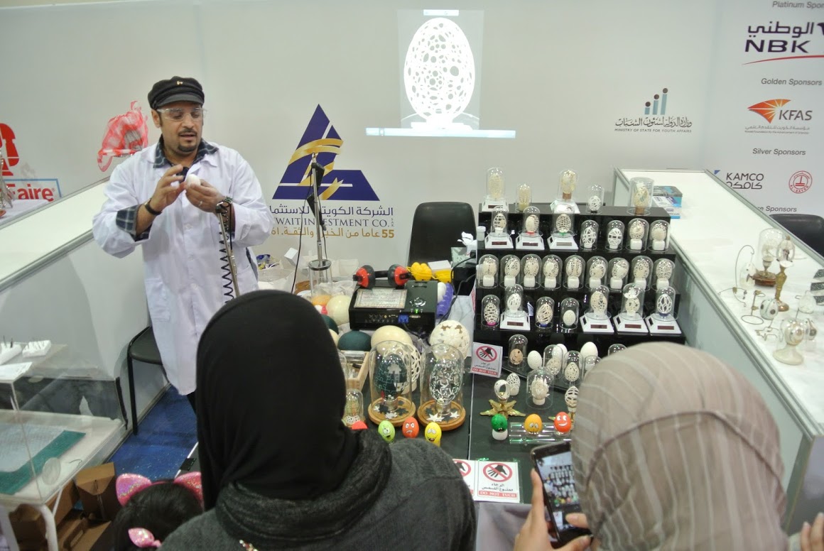 I met Ms. Hala Montague, the senior PR officer of Kuwait Investment Company (KIC), the Faire’s main supporter and organizer, as I arrived to the shiny Kuwait International Fairgrounds the next morning, located in a quickly growing area about half an hour from downtown. Energetic, proud, and in charge (and a wonderful tour guide over the next three days), she introduced me to many of the exhibitors, including a cheerful local artist who hand-carves intricate designs into all types of bird eggs, ranging from the size of small marbles, to ostrich eggs the size of a nerf football (he told me those are not easy to come by). I quickly noticed many groups of schoolchildren touring through the space, eagerly listening to the makers explain their projects, participating actively in the 3D Pen Workshop, and throwing balls at a wall to pop virtual balloons and unlock a prize box. This youth was on display not only at the faire, but in Kuwait overall, where 70% of the population is under age 30.