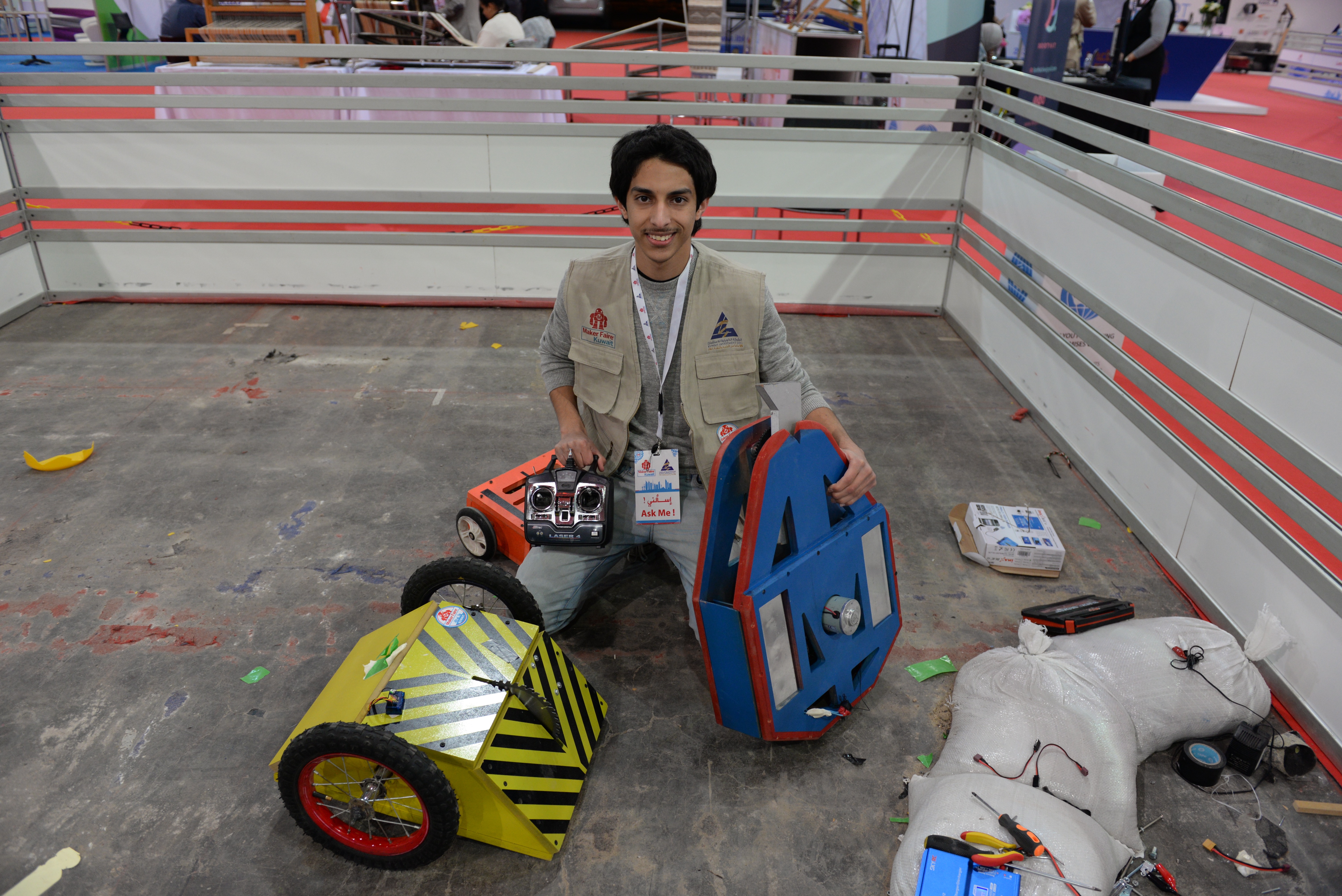 The other group helping organize the Faire was Creative Bits Solutions, a Kuwaiti business that distributes tools and electronics for makers in the Middle East, founded and run by Ahmad Alsaleh and his family. He and his friend Nasser Alkhaldi brought the maker movement into Kuwait by founding the country’s first FabLab, and also designed and sell an educational robotics hardware platform called Ebot. In 2014 they participated as makers at World Maker Faire New York, and brought the idea of organizing their own local event home with them.