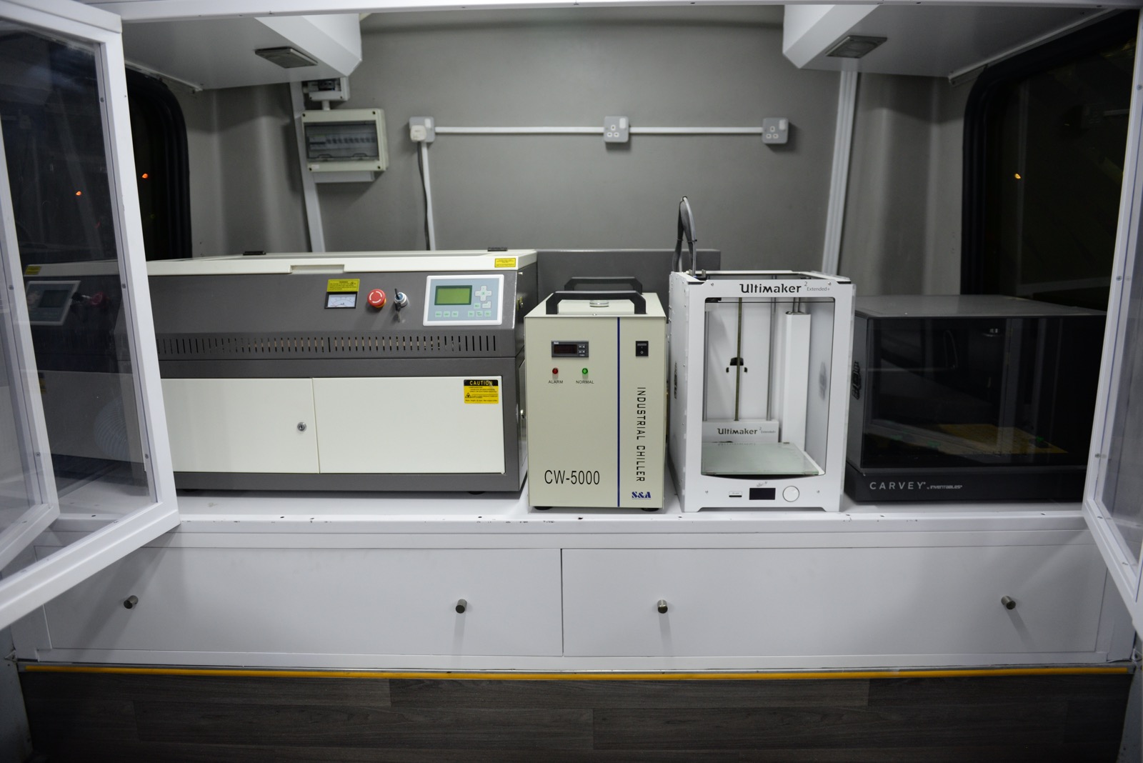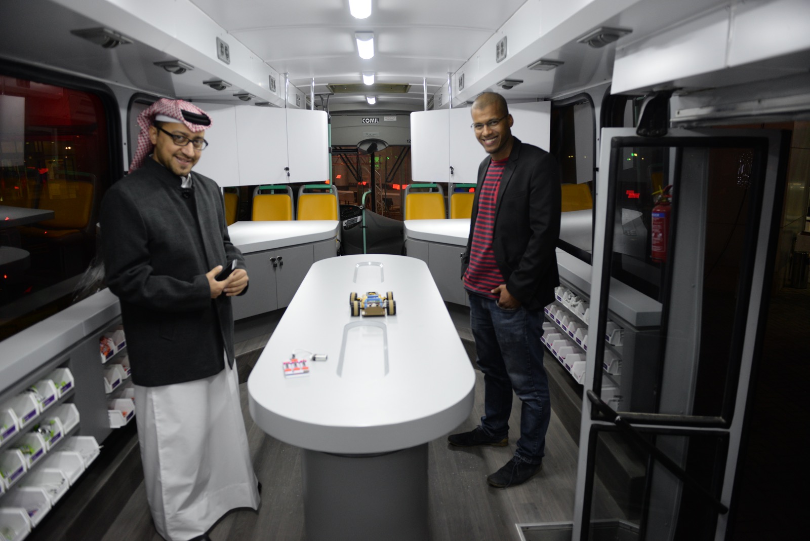 A self-erasing whiteboard project used one of Ahmad and Nasser’s EBot controllers to drive a mechanical wiper. Another, called Kuwait 1951, showed a virtual-reality recreation of old Kuwait 66 years ago, experienced through an HTC Vive VR headset. Some groups had traveled from neighboring countries, including Saudi Arabia and Qatar. The Qatar Scientific Club brought their robot camel jockeys, which have been refining camel racing in the region, moving away from child jockeys to small, lightweight, remote-controlled robots that strap to a camel’s back and spin a whip to make it run. Youns and Nasef, two other Qatari makers, brought the Sanea Bus, a mobile workshop inside retrofitted bus that contained workbenches, a huge assortment of LittleBits, a laser cutter, an Ultimaker 3D printer, and an Inventables Carvey. “If you take a picture, make sure to show Zach Kaplan,” they told me.