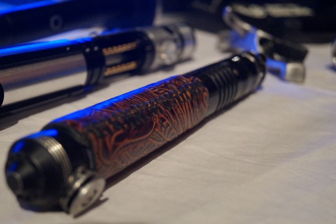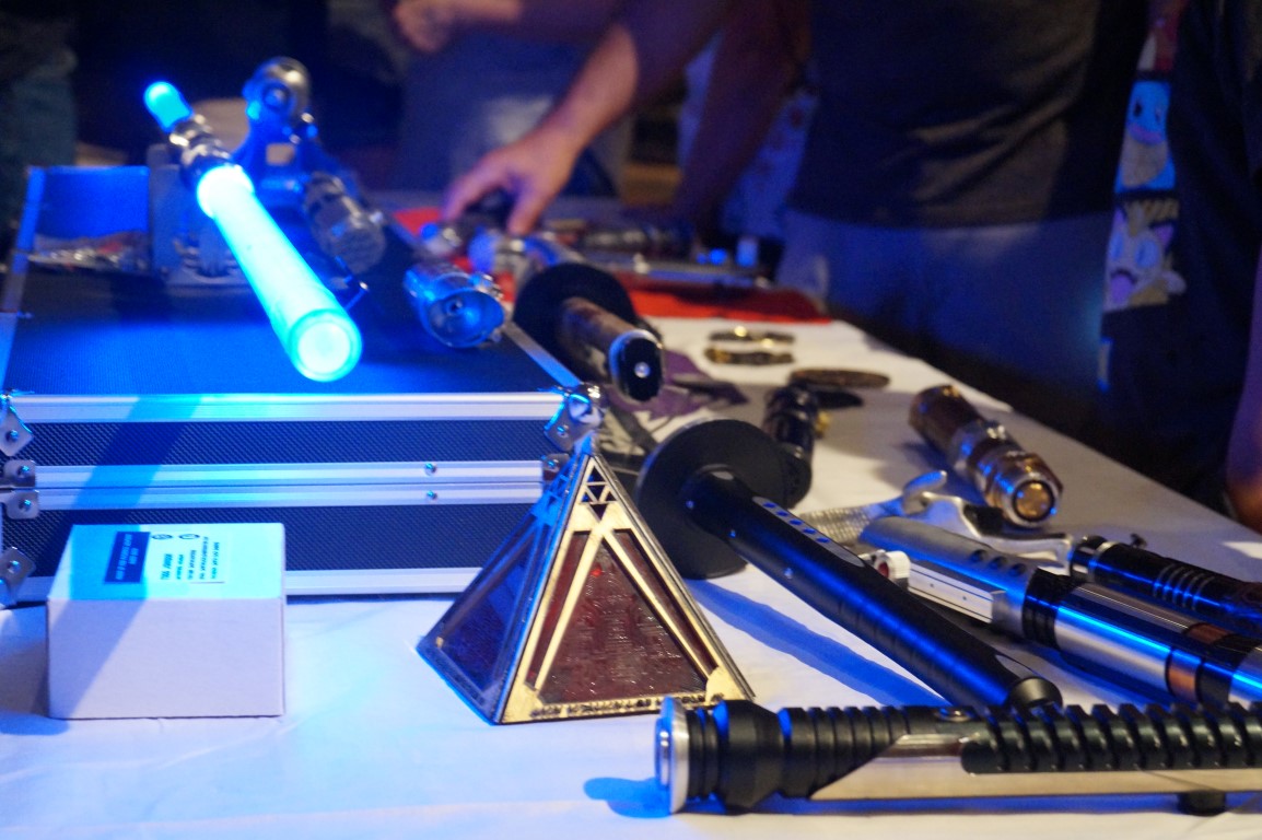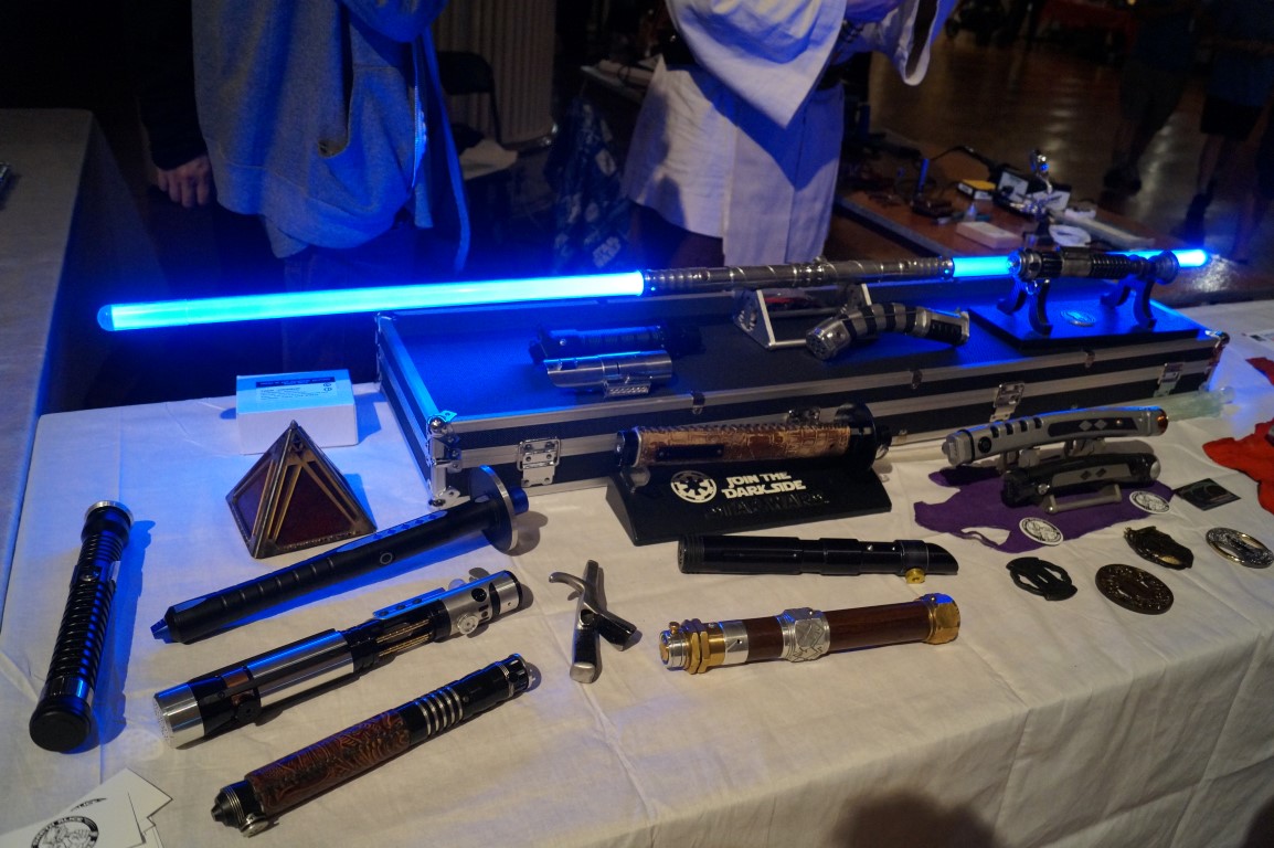 I know this picture is blurry, but just look at the expression on this young woman’s face as she walks up to a table covered in light sabers. These kits and custom props are from Terra Prime Light Armory.