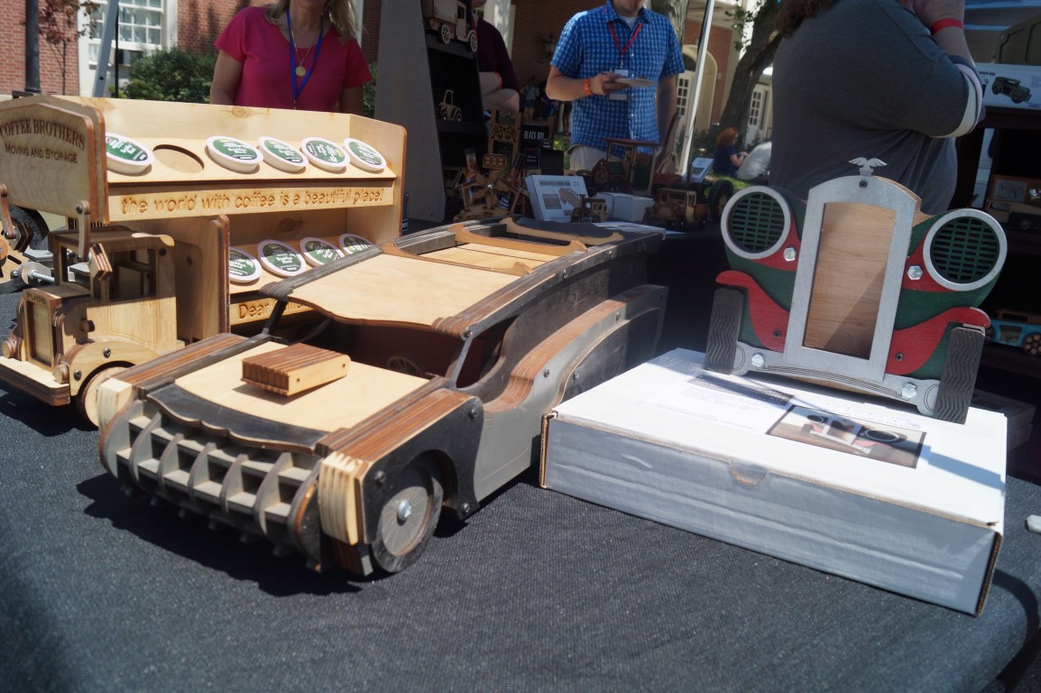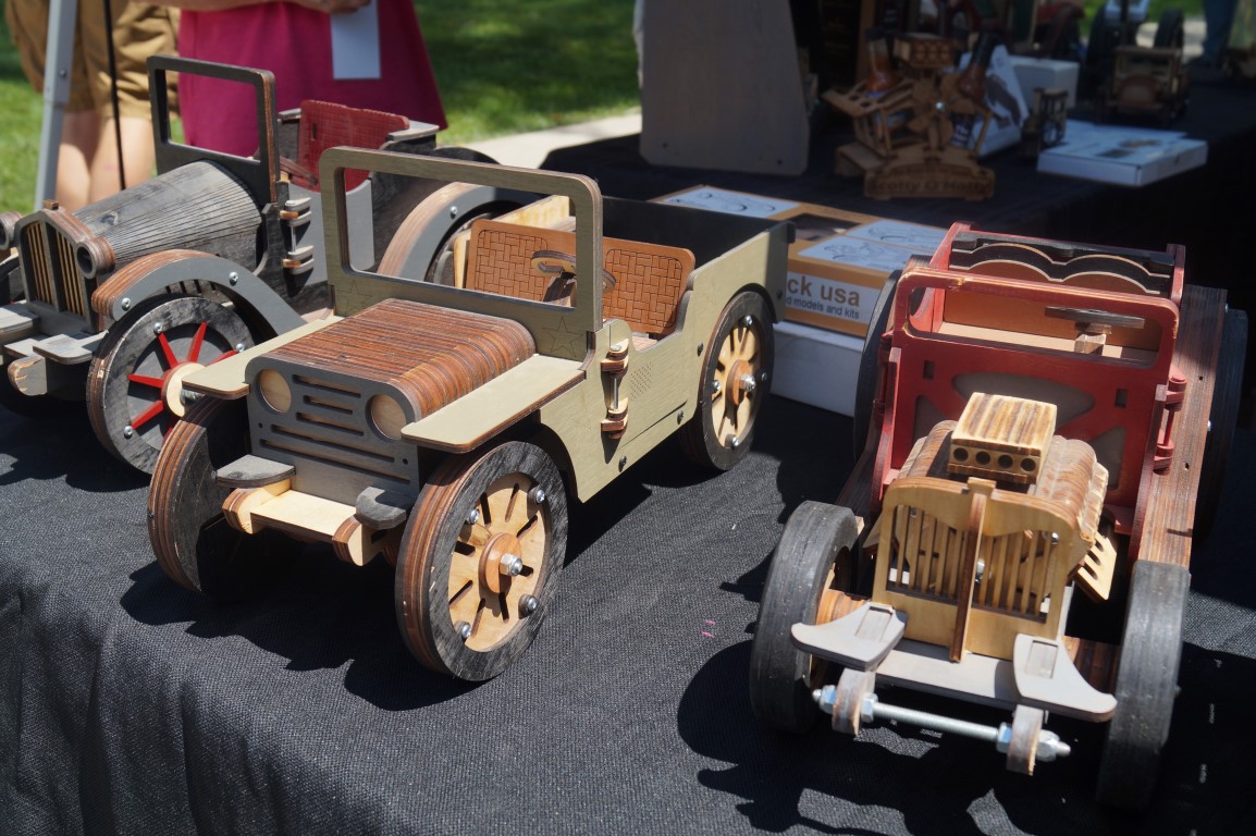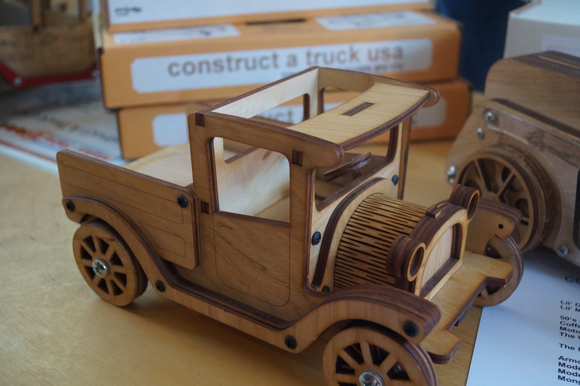These little wooden truck kits were delightful! They are all laser cut and seem to be fairly easy to assemble, but the final result is also sturdy and, in my opinion, quite nice looking. Jim, above, is posing with one that was his own creation. The only way to enter this vehicle, named “nimble” is to lift the windshield!