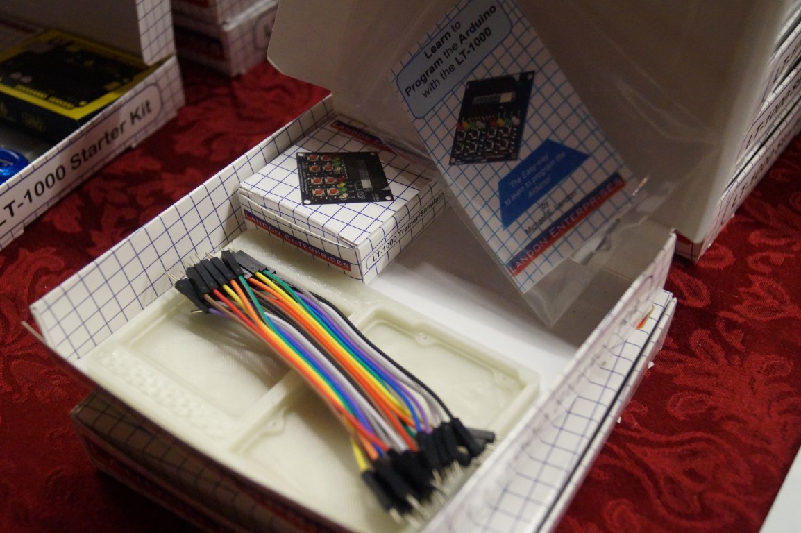 Michael waas showing off these test boards for learning arduino and raspberry pi. They’re a small board that has a a bunch of common learning circuits built in. You plug it into your arduino or raspberry pi and cut out all the breadboarding mess from the learning process.