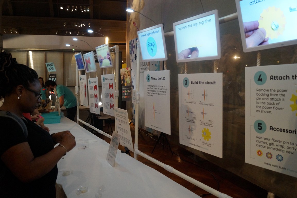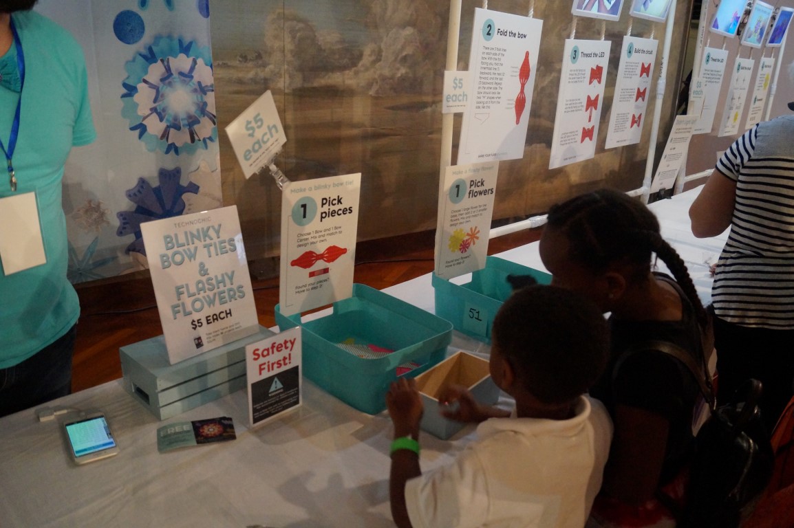 One of my favorites from a few faires is here! This is Technochic, who makes these papercraft circuits. They had people assembling LED flowers and bowties.