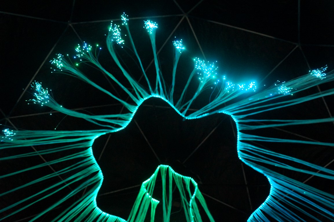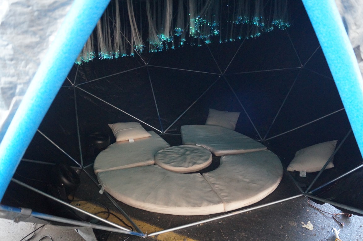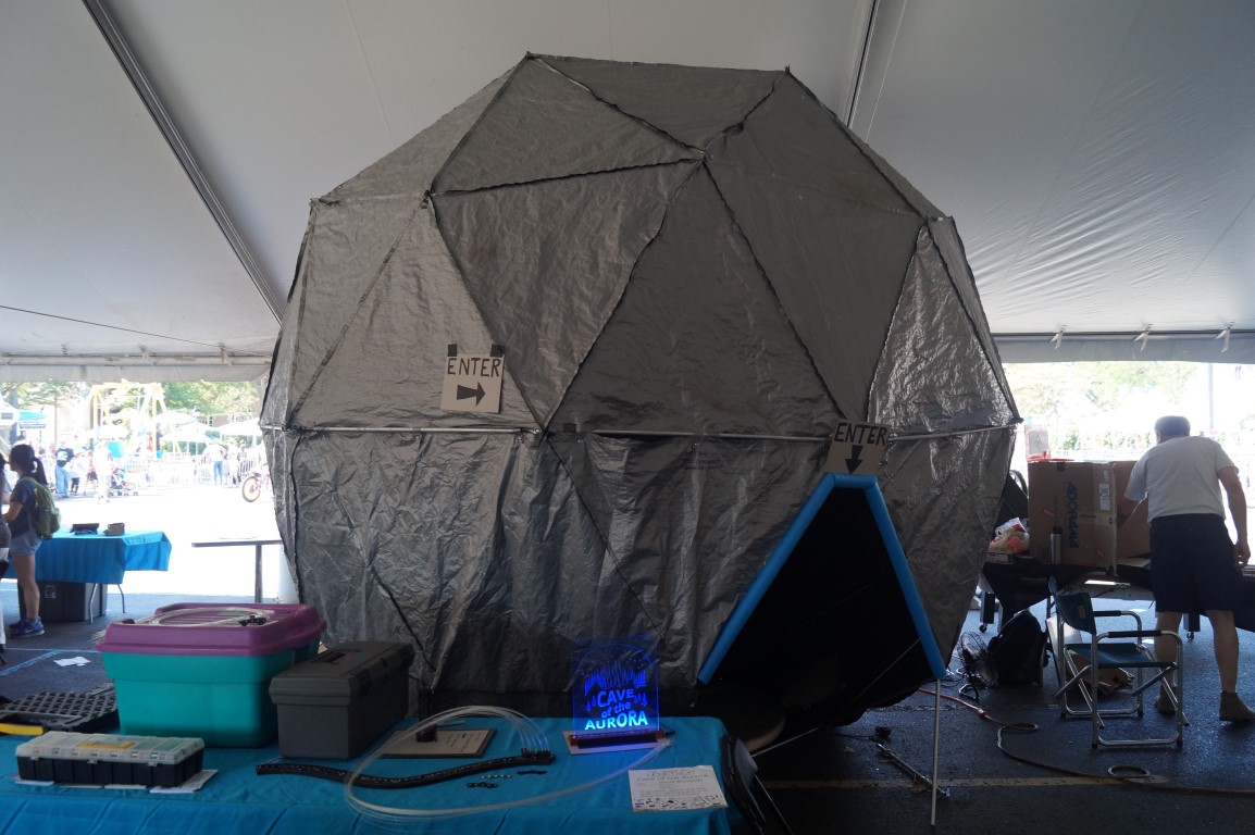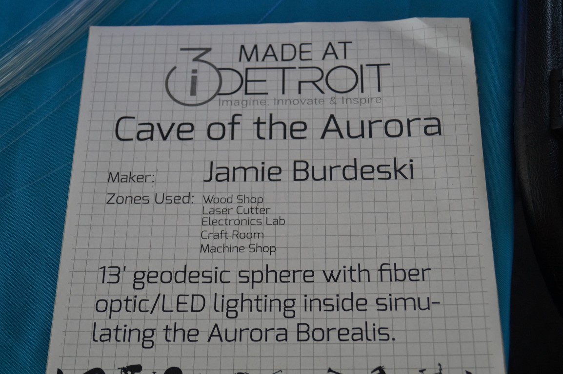 Hidden away in a fairly unassuming geodesic dome in the i3Detroit tent was this fun display of lights. Inspired by the aurora borealis, this fiber optic display offers a chance to sit and relax, staring up into the beautiful colors.
