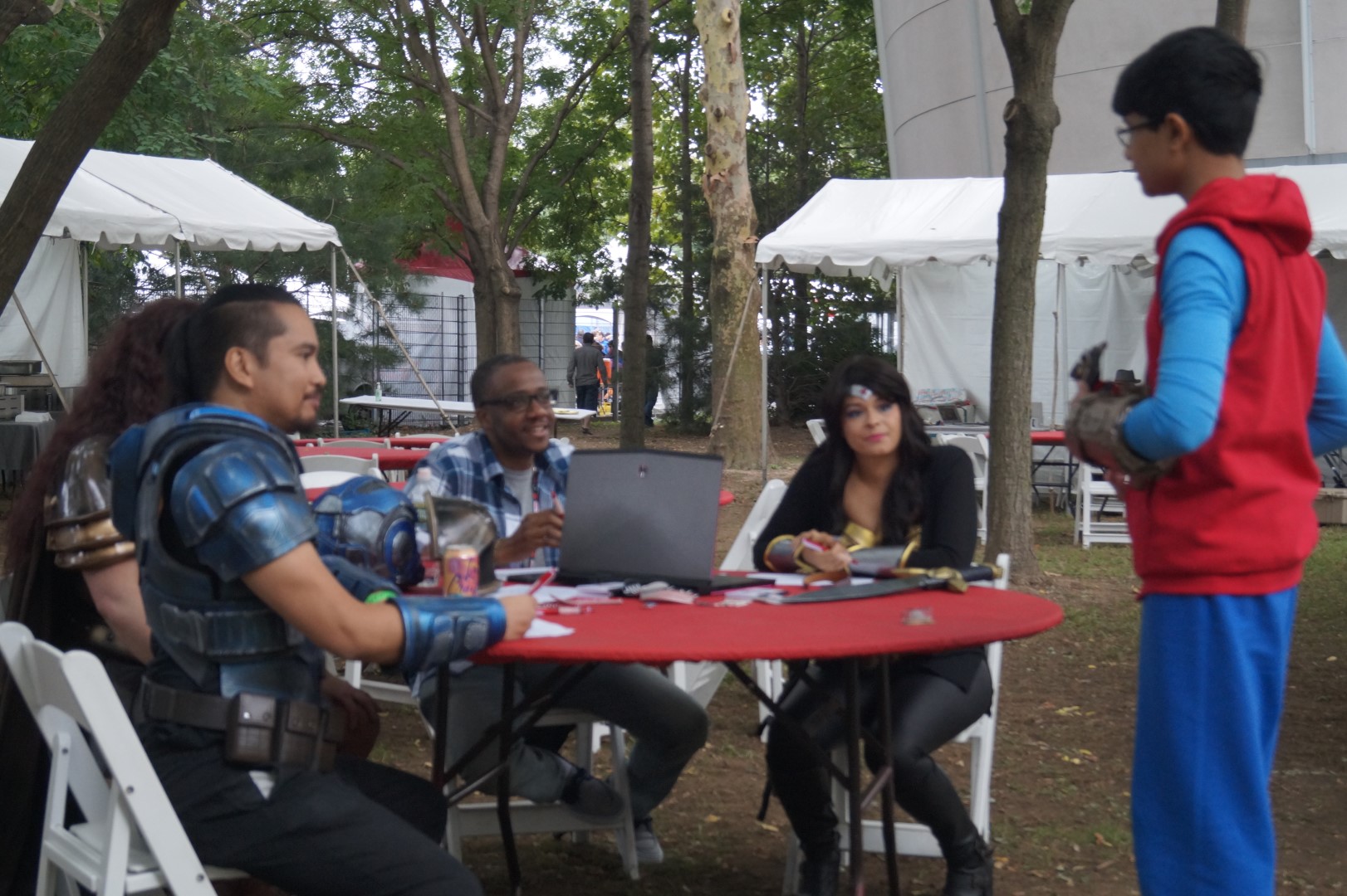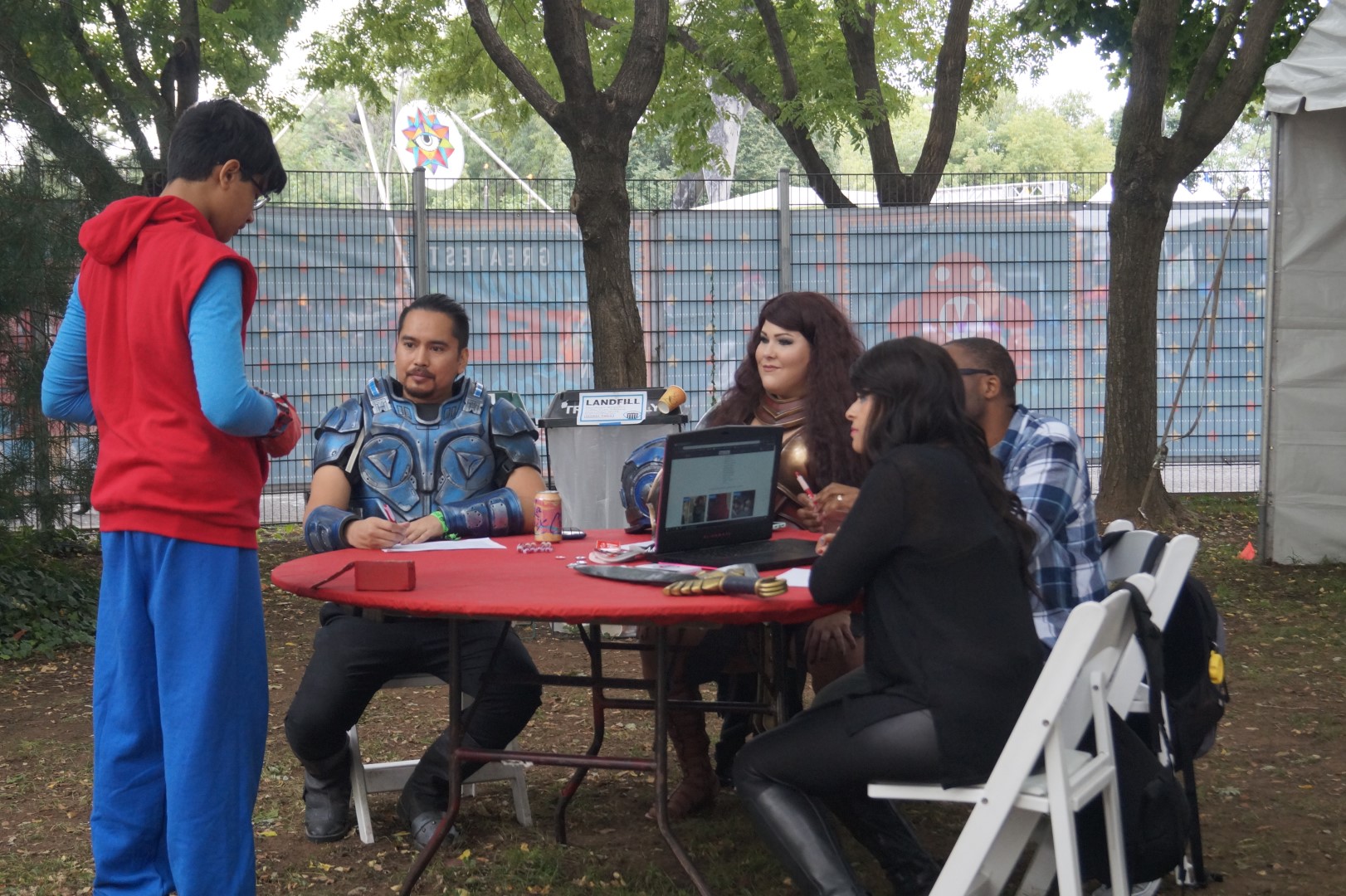 Dhareza, Becka Noel, Jackie Craft, and Darrell aka Broken Nerd are deep in the process of judging the competitors in the cosplay contest. That is such a difficult job! – caleb kraft