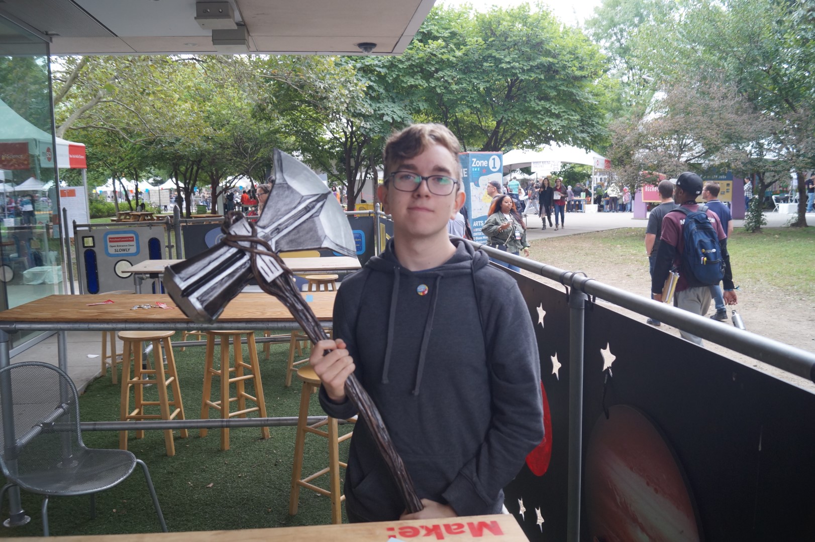 The gates are open! The front gates were packed as last-minute makers rushed to get their gear in and set up. To keep everyone amused while we wait for the gates to open, we have all kinds of craziness happening. This is the start of the day and such a wonderful feeling each time. – caleb kraft