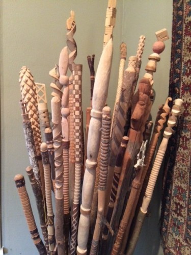 Retired architect Ivan Johnson began carving walking sticks as a Scoutmaster during the 1970s. As his collection grew, he began exploring the swamps around the Aucilla River, next to the St. Marks National Wildlife Refuge in North Florida for sticks to source. Each of his one-piece walking sticks areย hand carved using simple tools such as pocket knives, drills, and small saws. After he’s carved them,ย Marsey Johnson applies intricate painted patterns.