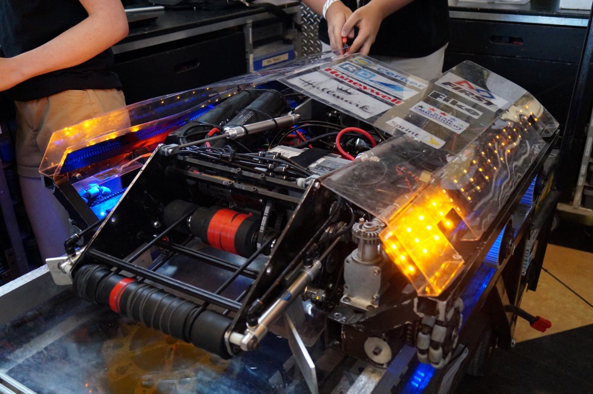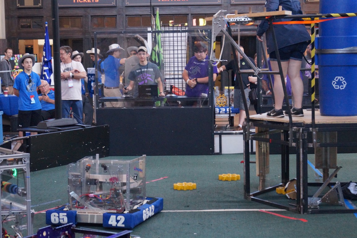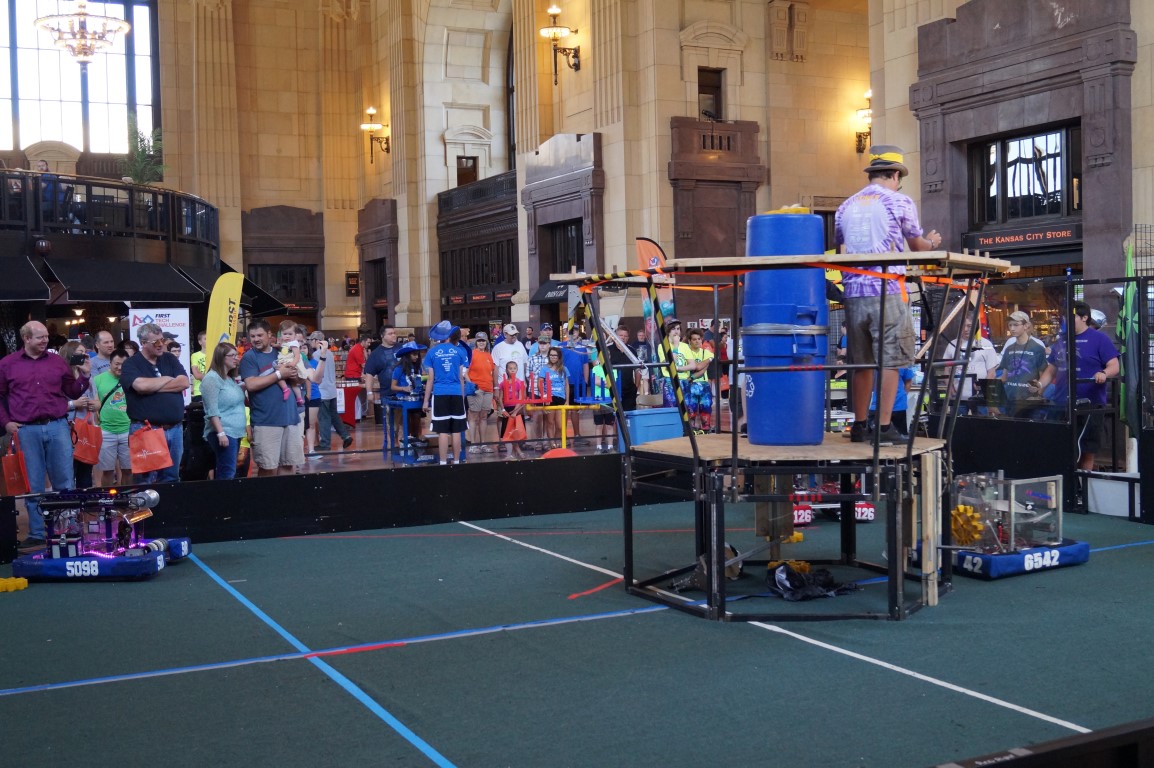 FIRST Robotics has a big presence at Maker Faire Kansas City. They’ve got many teams all set up doing a demonstration of what their competitions are like. In this example, the bots are having to collect a cog from one end of the arena and place it on a pole at the center, where the person pulls it up and mounts it in place.