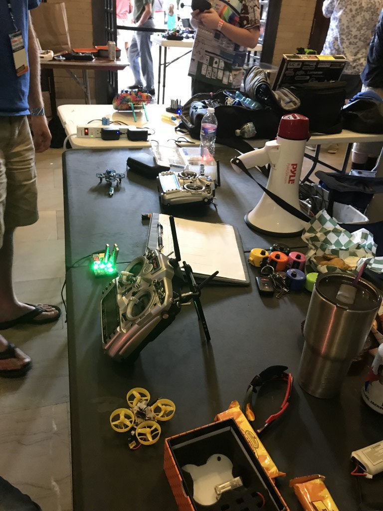 One of my favorite parts of this faire was Matt Bell’s flying circus. This was a miniature drone racing course, all constructed from cardboard. The pilots use First Person View rigs to see from the drone’s perspective as it swoops and crashes around the course.
