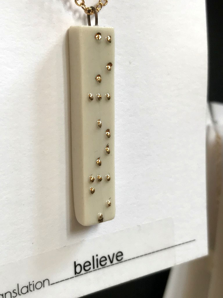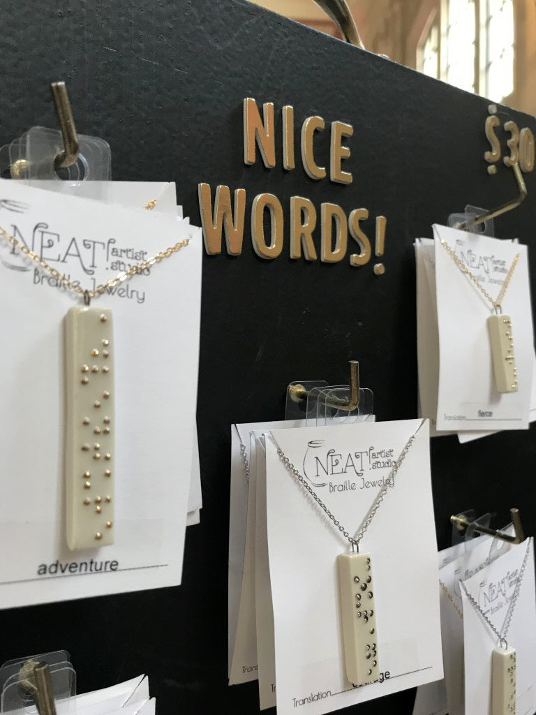 Kate Schroeder brought her NEAT! Braille jewelry. These are single words, created in Braille. They look pretty cool too. She had nice words, silly words, and naughty words. I really thought it was cool. As I introduced myself, she even made me a little paper name tag with my name in braille!