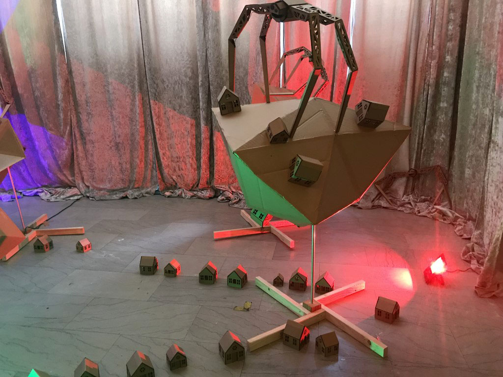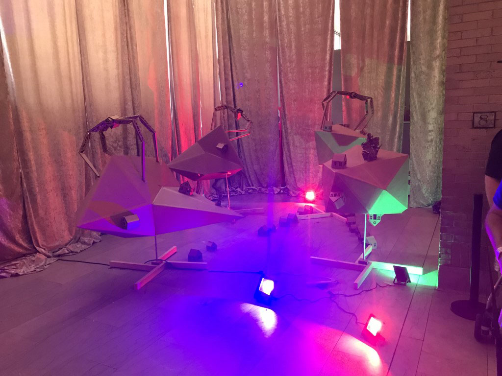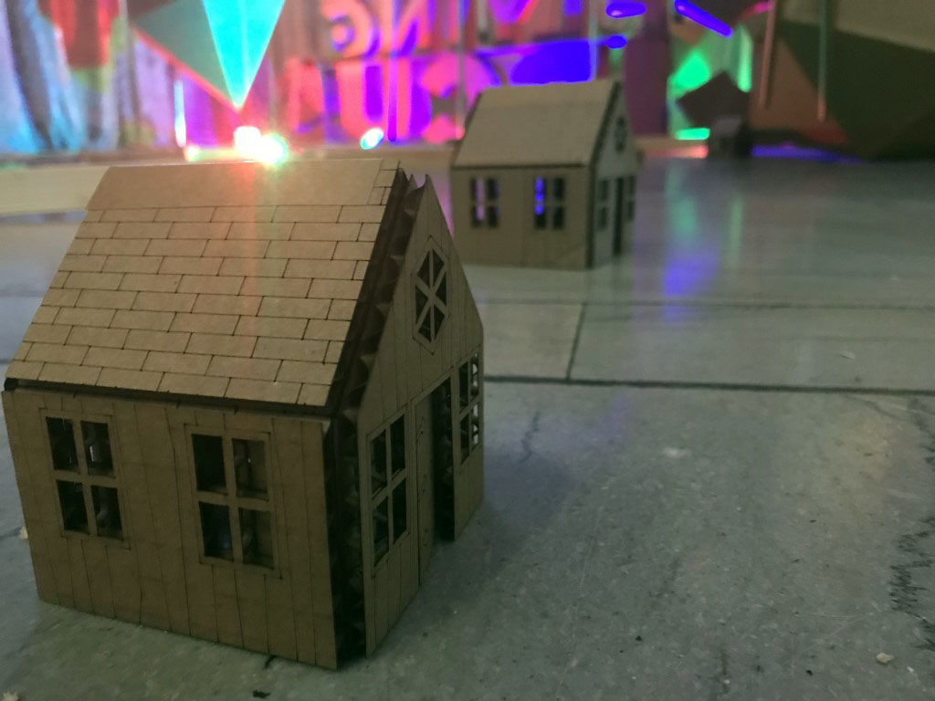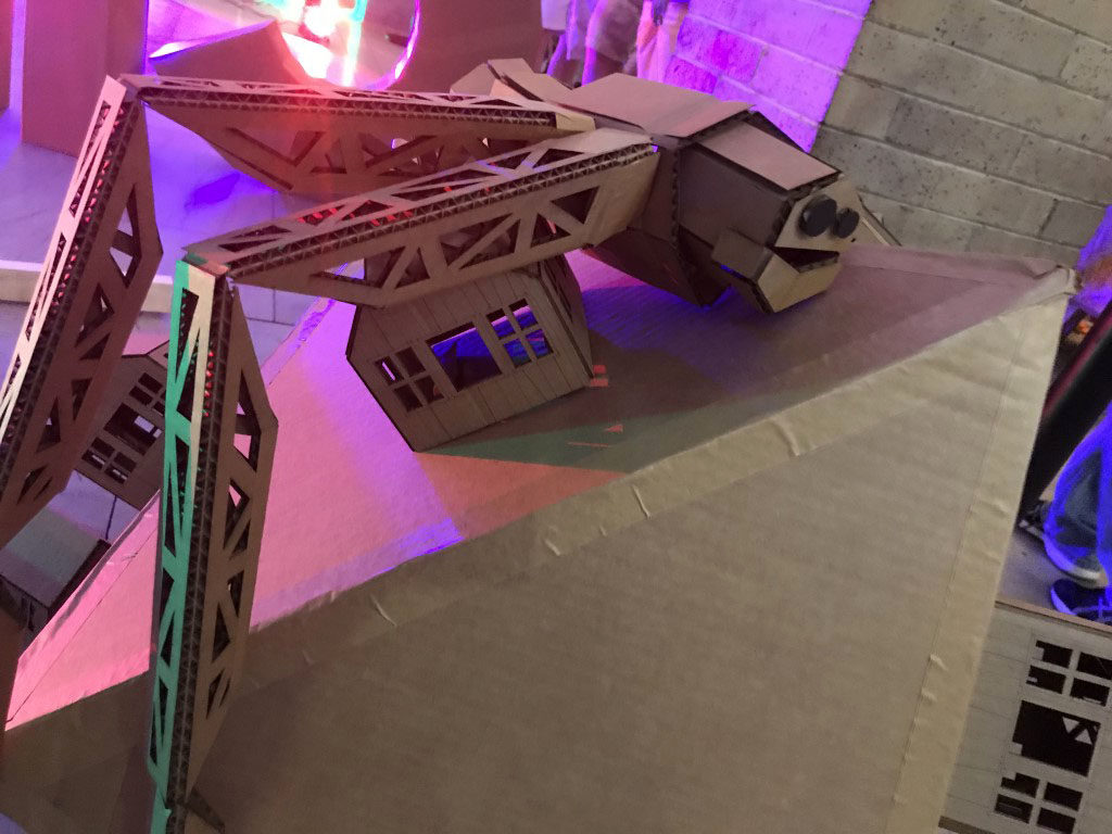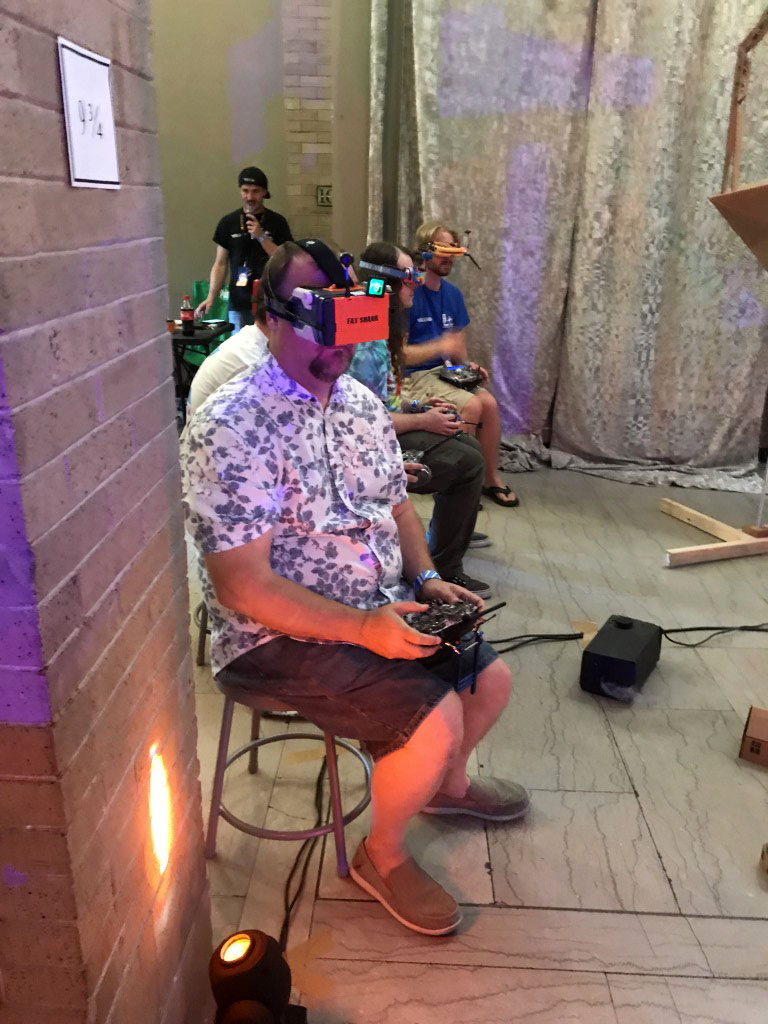 One of my favorite parts of this faire was Matt Bell’s flying circus. This was a miniature drone racing course, all constructed from cardboard. The pilots use First Person View rigs to see from the drone’s perspective as it swoops and crashes around the course.
