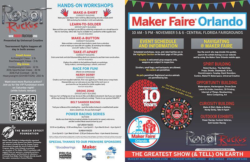 Maker Faire Orlando celebrates 10 years of awesome this weekend as it gets underway at the Central Florida Fairgrounds. The all-volunteer team, lead by the intrepid makers of Maker FX Makerspace, once again have put together an amazing collection individual maker projects, workshops for the whole family, the infamous Robot Ruckus, done, belt sander + power wheels racing, and more. The 10th edition will feature makers from near and far across three expo halls and outdoor spaces. Join a scavenger hunt: Document your travels through Maker Faire by scanning your RFID card on the IoT node at each participating exhibit. Track your progress and compete to visit more exhibits than your friends in a set period of time. Win swag and get a certificate mapping your participation!