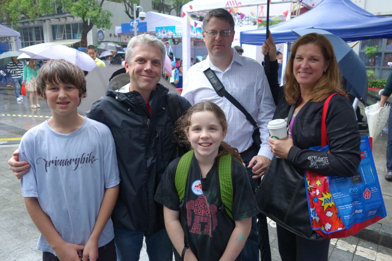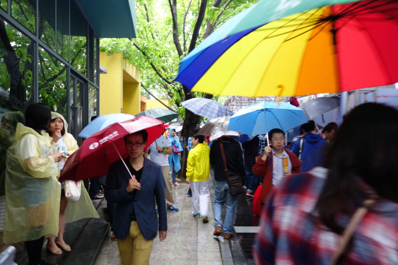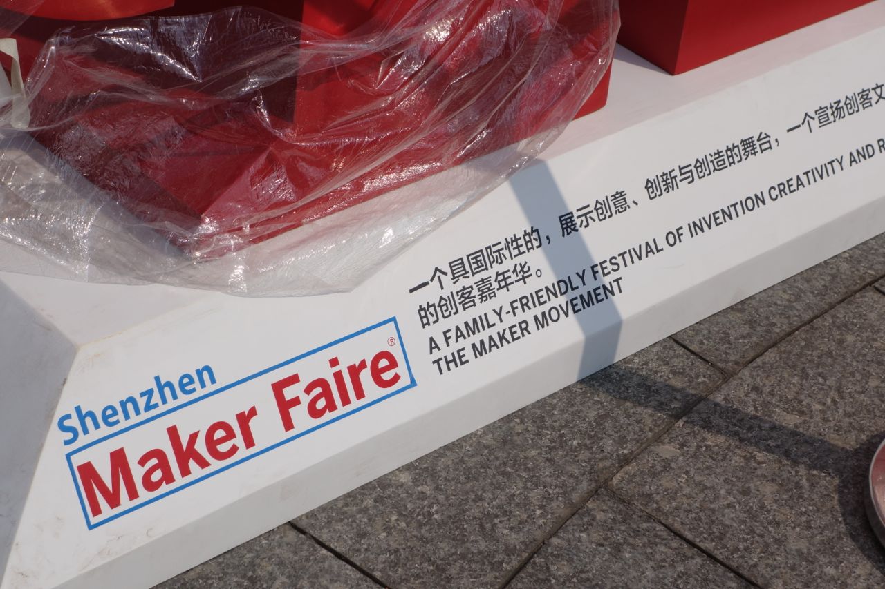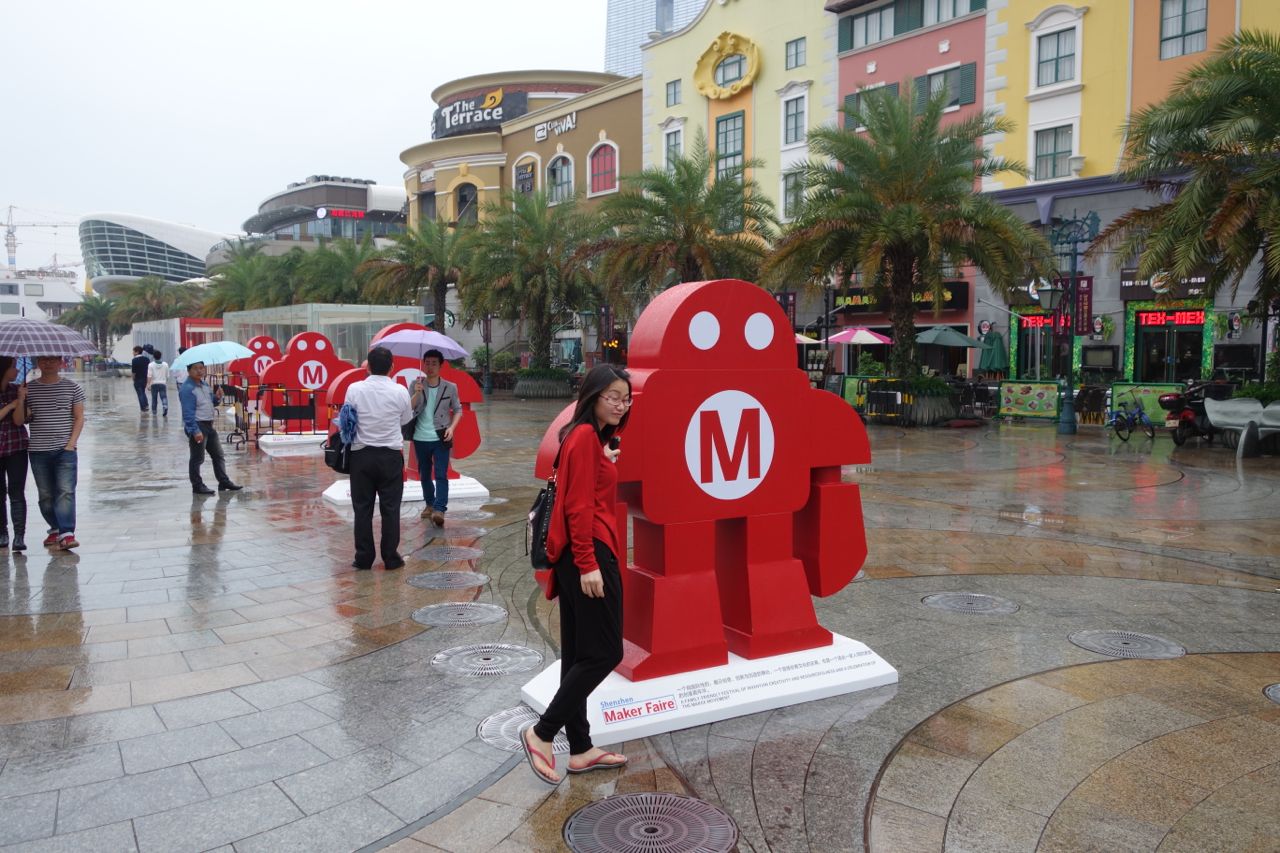 Maker Faire Shenzhen was held mostly outside and their first day was rainy, and umbrellas were required. The rain didn’t seem to keep people away, however, although it made it a little harder for makers. When I asked Eric if anything about this Maker Faire surprised him, he said “that it stopped raining.” The second day, which was a Monday and the third of a 3-day weekend holiday, was dry and more enjoyable.