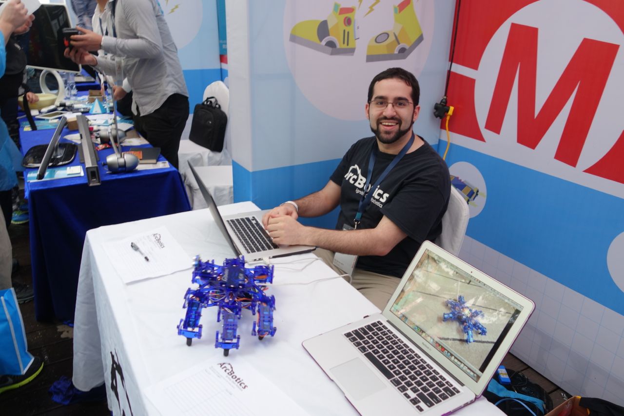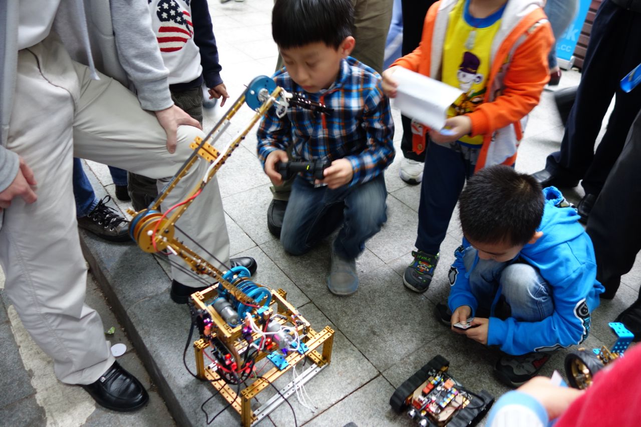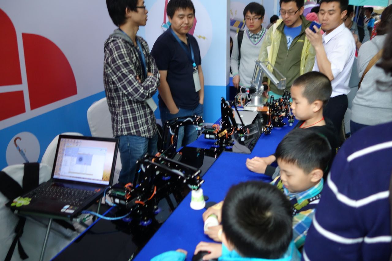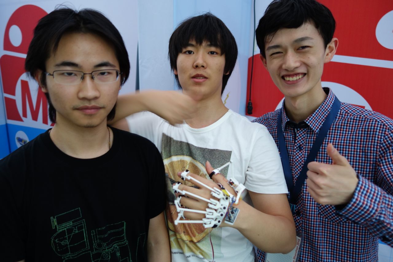 There were plenty of activities as well as student projects. I had two favorite student projects. One was a group of university students who had built a telepresence robot called Frank. One of the team members said that they were showing the fifth generation of Frank. The Dexta Robotics team from Nanjing showed a project that is temporarily called Handuino, which is an apparatus for your hand that allows you to control a robotic hand. The founder of the company, Aler Gu, garduated from high school last year and has taken a year off to work on this project before heading to Cambridge University in the fall to study Mechanical Engineering. Aler sees possible industrial uses for a remotely controlled hand as well as a new interface for games. They are preparing an injection-molded version of the hand soon, and then will launch a Kickstarter.