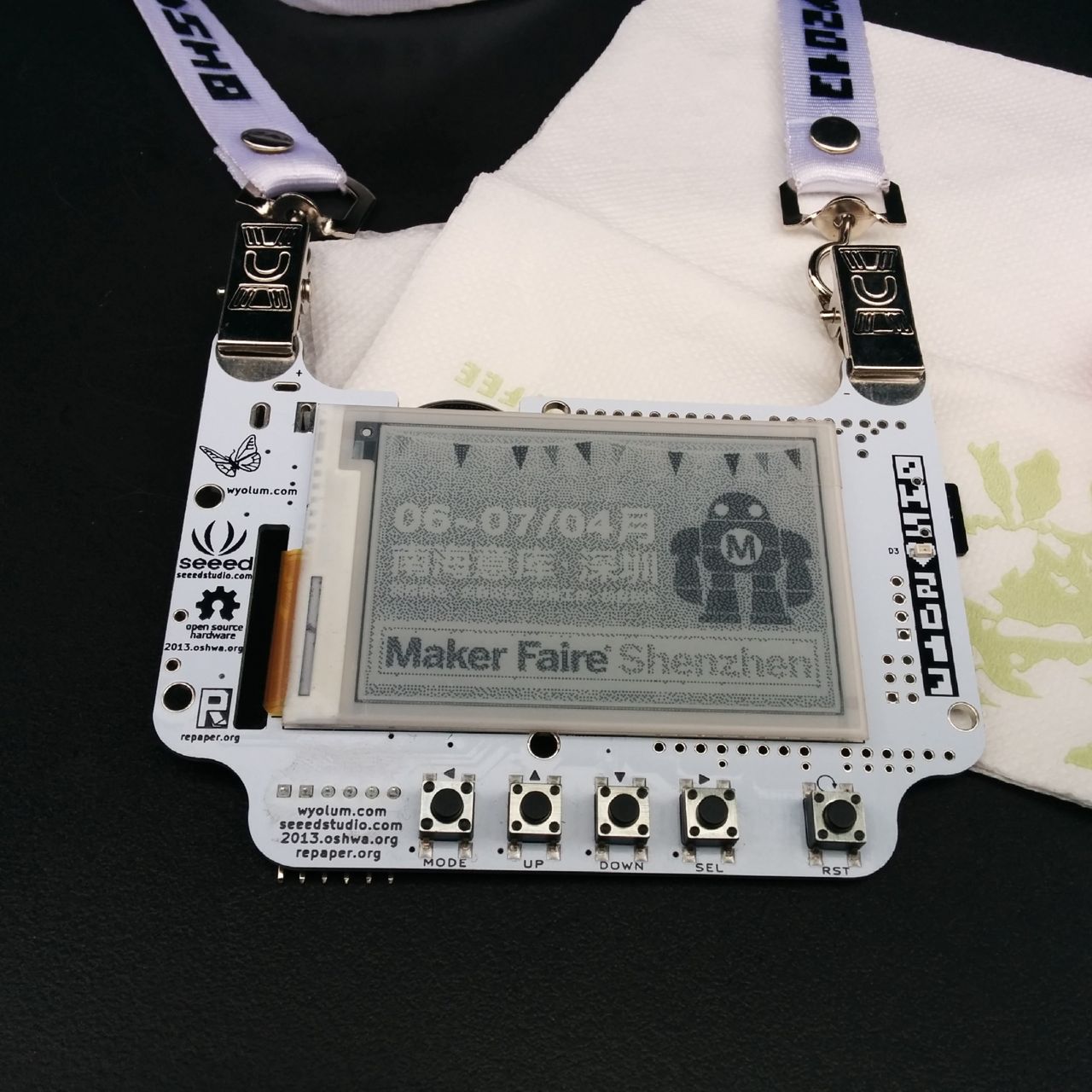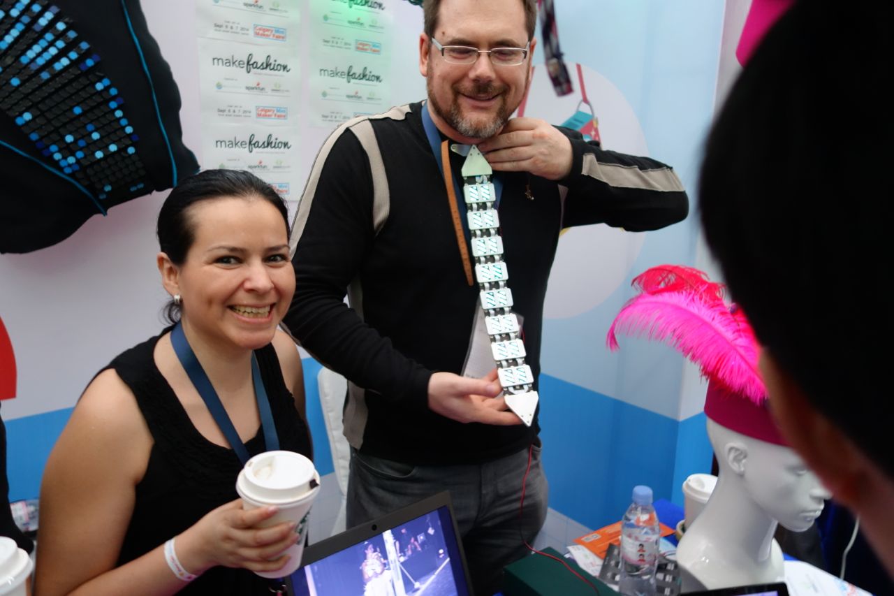 The Make Fashion group exhibited a number of wearables projects. Dr. Trish Flanagan of the School of Visual Arts at the Hong Kong Baptist University brought a number of student projects, including an LED umbrella and a dress that utilized an array electro-mechanical components like those used in German airport signs. (I’ve always wanted one of those large signs for Maker Faire.) Shannon Hoover, who is the organizer of the Maker Faire in Calgary and came to Shenzhen with his wife as vacation, wore his e-tie from his neck. Earlier in the week, he had arranged a tour for me of Dr. Flanagan’s Wearables Lab in Hong Kong before Maker Faire.