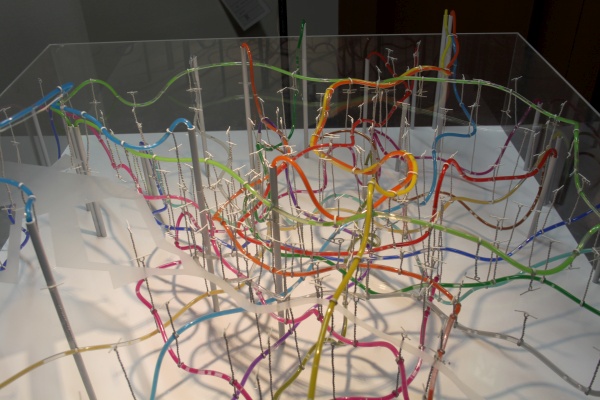 Tokyo’s extensive metro and train system recreated in colored water and air bubbles by Takatsugu Kuriyama.