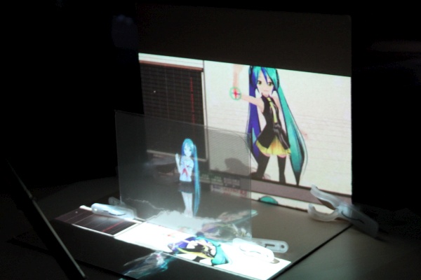 A ‘holographic’ figure dances in front of a projected background. This technique has been used in stage shows. By Hatsune Miku.