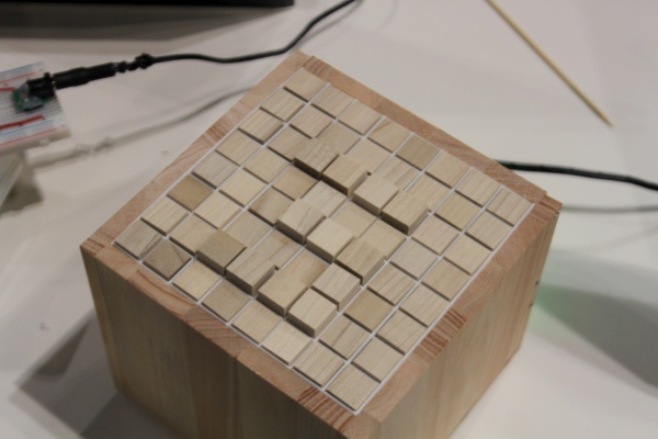 A low resolution matrix display using small wooden blocks pushed up by solenoids.