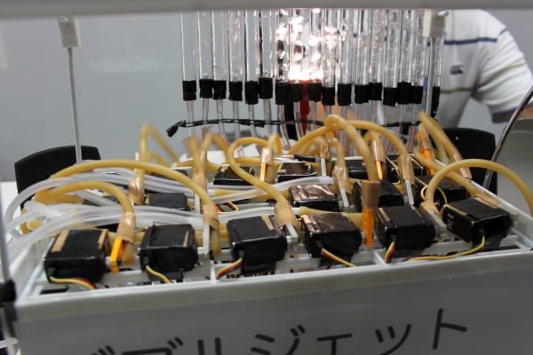 @awatwi creates a symphony of air bubbles in clear tubes filled with water. An array of servos press or release air hoses that blow bubbles through the water in each column.