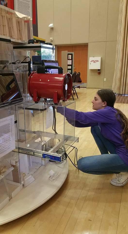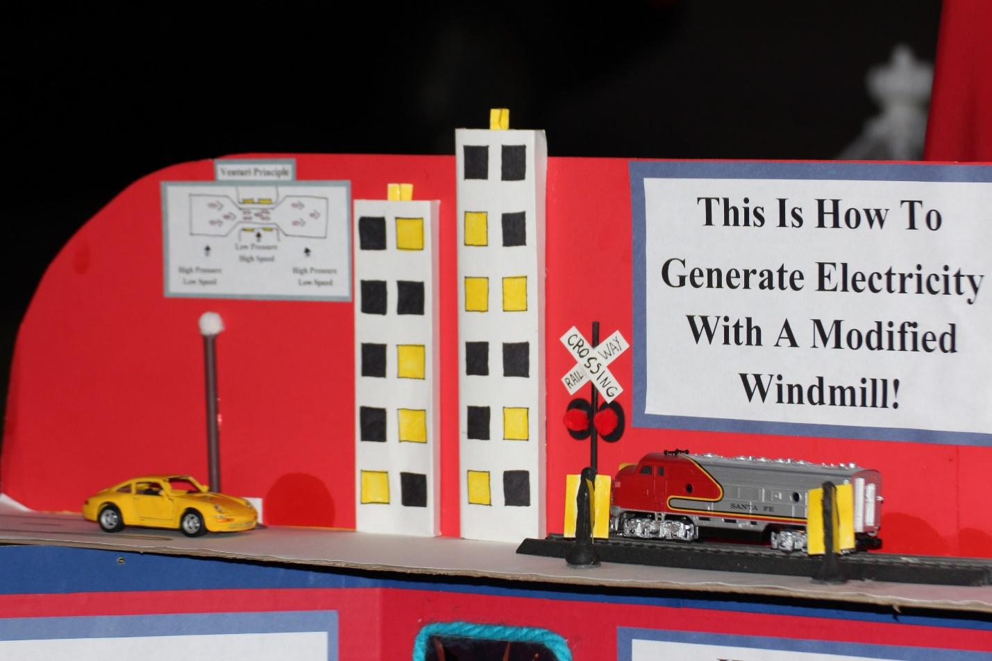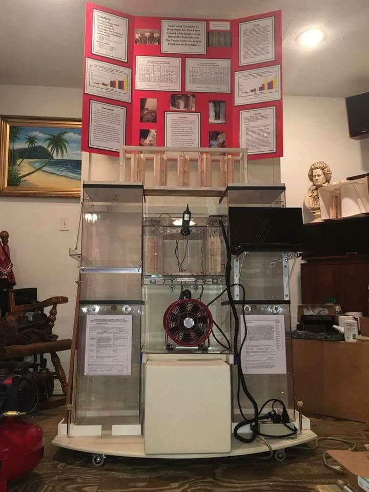 Fast forward to 2012 during a trip to California for the National Trampoline and Tumbling Championship. That trip was like a turning point in my life, because it was the first time I saw a wind farm up close, and personal! During the middle of that 3000-mile trip, we stopped in Van Horn Texas, and I noticed lots of long power lines running across the Interstate that supplied power from very far away. The buildings were very scattered, and the railroad had a crossing that did not get much use, it seemed. That little town seemed to make a big impression on me. After another 1500 miles, the wind farm came into view, and I was overwhelmed by how the turbines just kept turning in the distance, as we drove down Interstate 10. The whole time, I had my arm out of the window, catching the wind, and watching the turbines spin. I also had been noticing the tumbleweed, as it was rolling down the Interstate, during that trip, and all those things just kind of came together. I thought, “Why aren’t turbines on the side of these empty roads to take advantage of all this wind that the cars are producing?” I figured, why not use those turbines to generate electricity from all those cars that pass each, and every day, on both sides of the Interstate. After that day, turbines have been a very important part of my life. My first science fair project was based on that idea of powering a vertical axis turbine by the turbulence from a passing car, and since then, I have been developing scale-model Vertical Axis Wind Turbines (VAWT) to test various functions of biomimicry. I have incorporated, whale tubercles, nanoparticles (“The Lotus Effect”), and bird wing movement into my designs, and all the turbines were tested in a venturi that was inspired by my trips to Disney World to see Spaceship Earth!